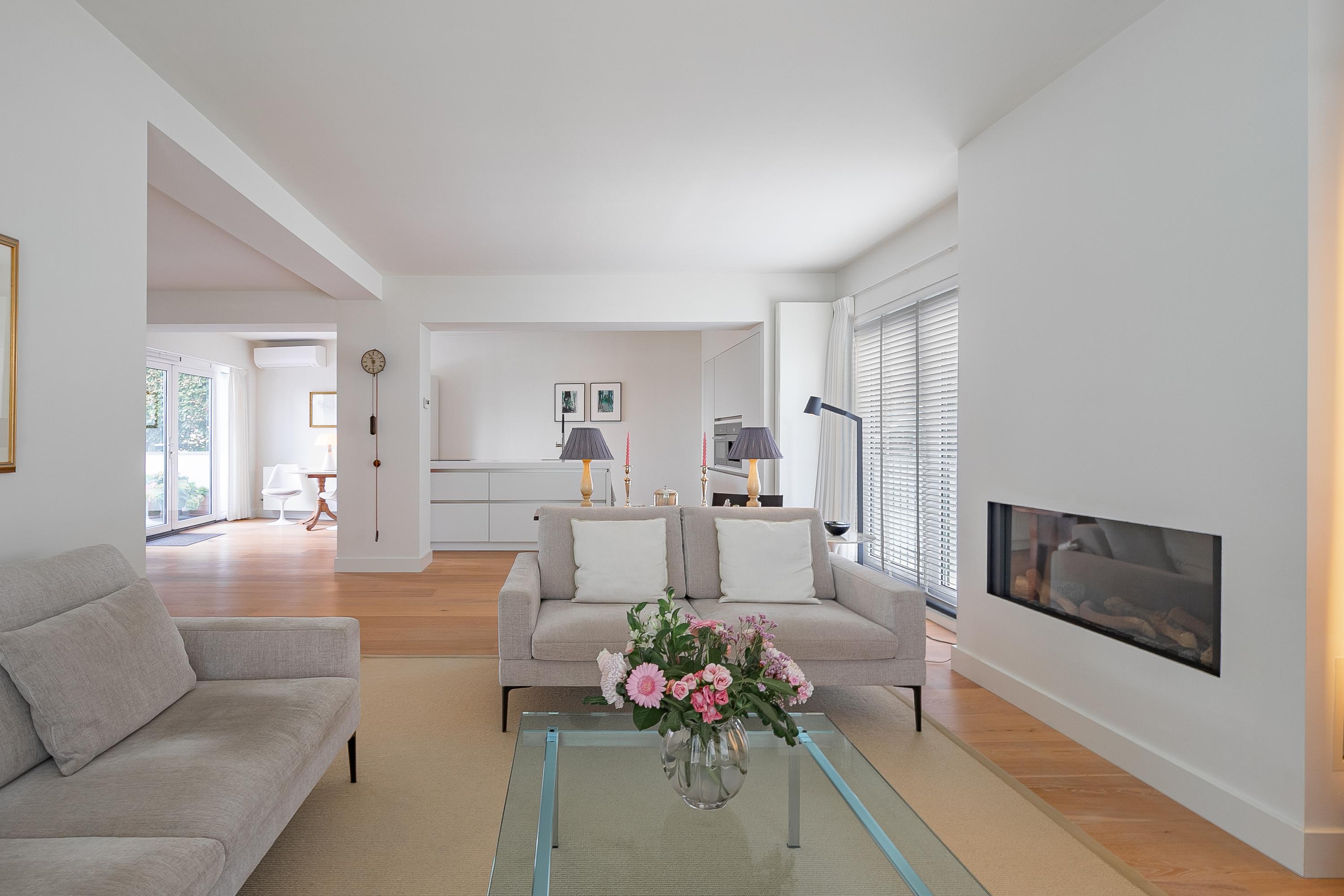 تركز الطابق الأرضي المفتوح على مساحة معيشة واسعة تبلغ حوالي 68م²، يميزها أرضية باركيه من خشب البلوط، ومدفأة غاز مخصصة من Faber، ومشعات مصممة خصيصاً. تضم المطبخ بدون مقابض سطح طهي اندكشن بخمس مناطق، وفرن حراري، وماكينة قهوة مدمجة، وأبواب منزلقة تطل على الحديقة، ما يمنح سهولة في الحياة اليومية والاستضافة. تنتقل منطقة المعيشة إلى حديقة حضرية خاصة مواجهة للشمال الشرقي وساحة أمامية خضراء تستقبل أشعة الشمس المسائية.
