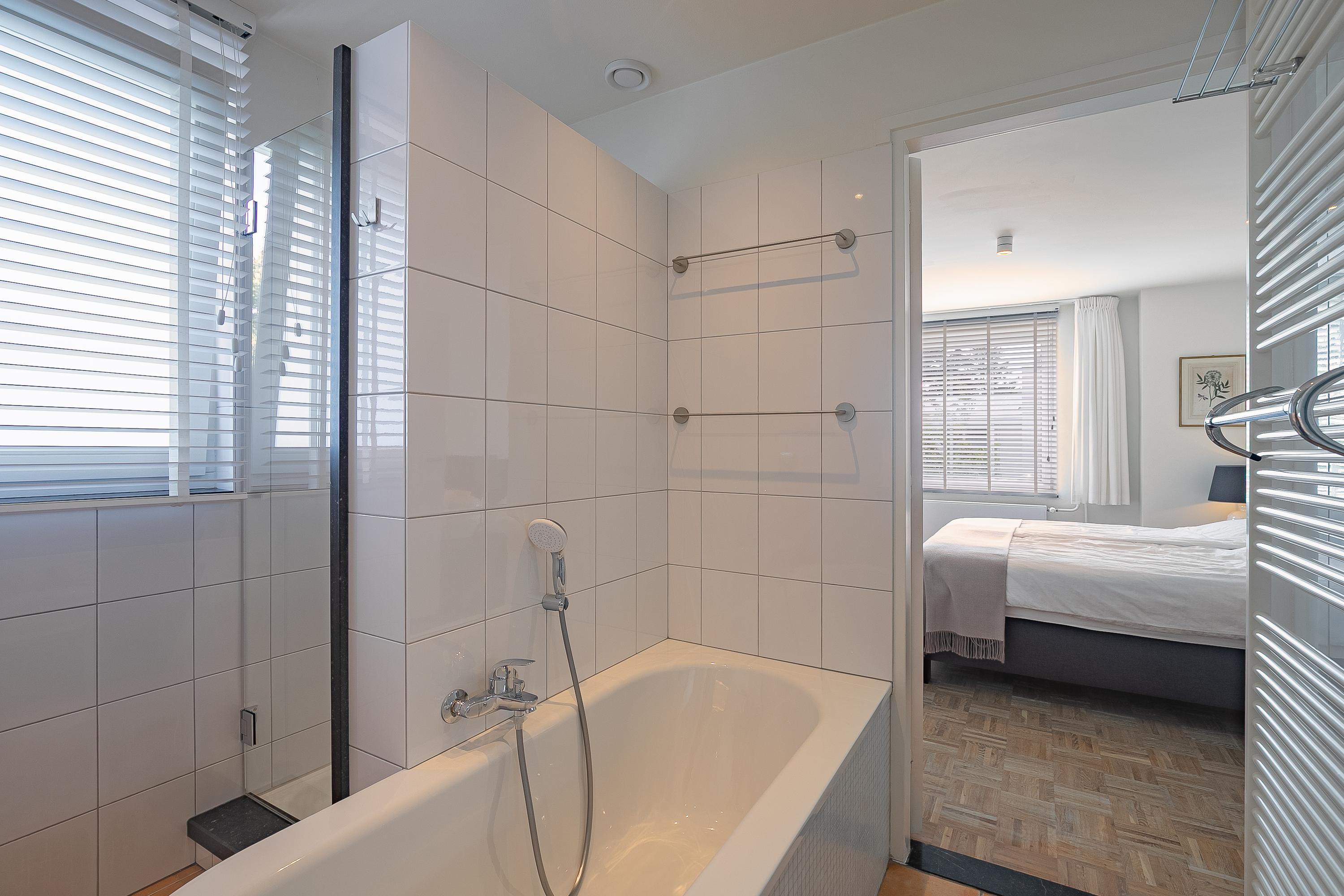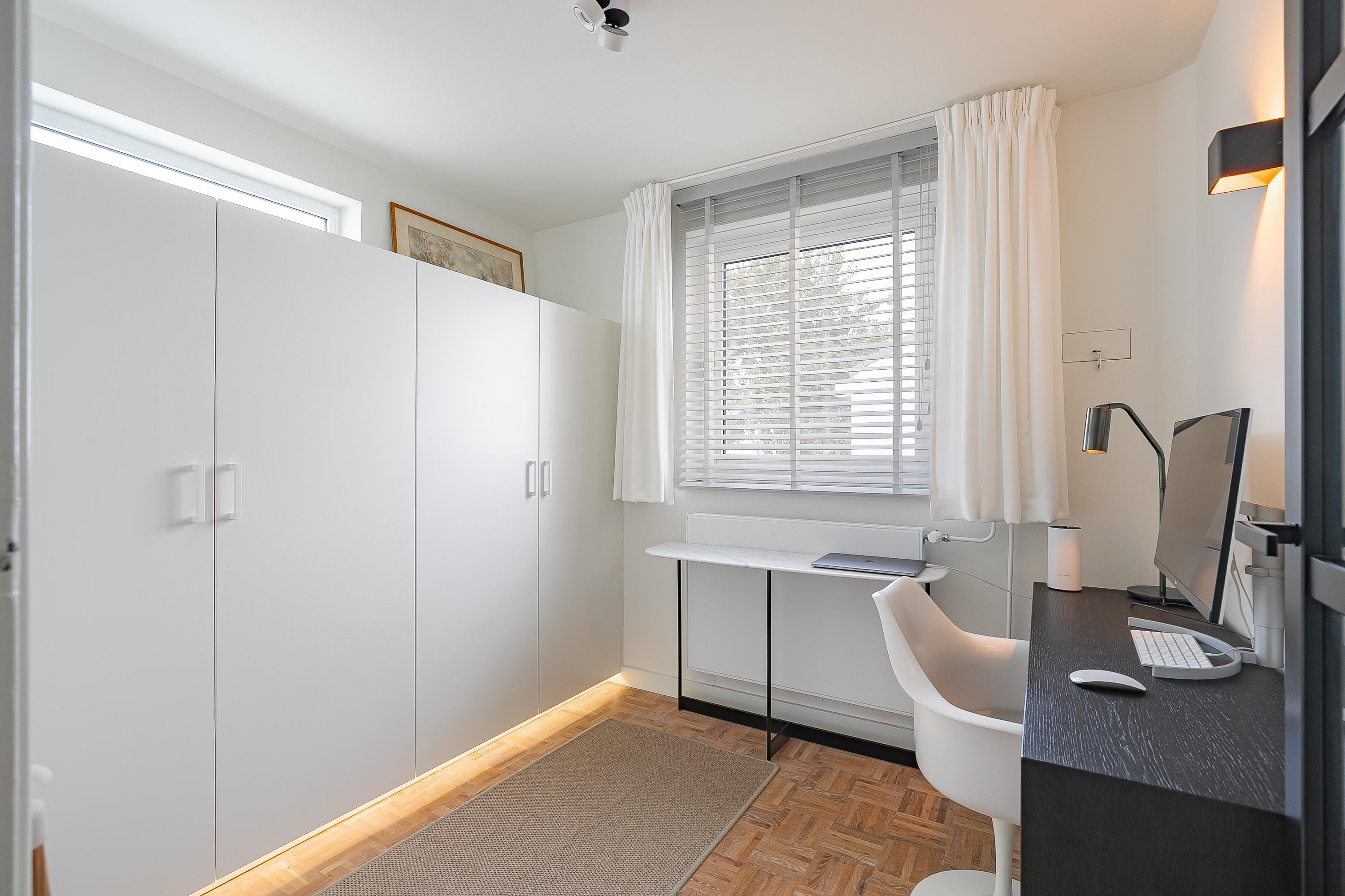 في الطابق العلوي، تكمل أربع غرف نوم خزائن مصممة خصيصاً من Slangen Interieurbouw وأرضية باركيه بنمط الفسيفساء. يحتوي الحمام على دش مشي وحوض استحمام، وتهوية ميكانيكية، وتدفئة أرضية. تستفيد غرفة النوم الرئيسية من مكيف هواء؛ وتتوفر حلول تخزين واسعة مع قبو كبير يضم جراجاً بمساحة 33م² وغرف خدمات، إضافة إلى مساحة تخزين في السطح.