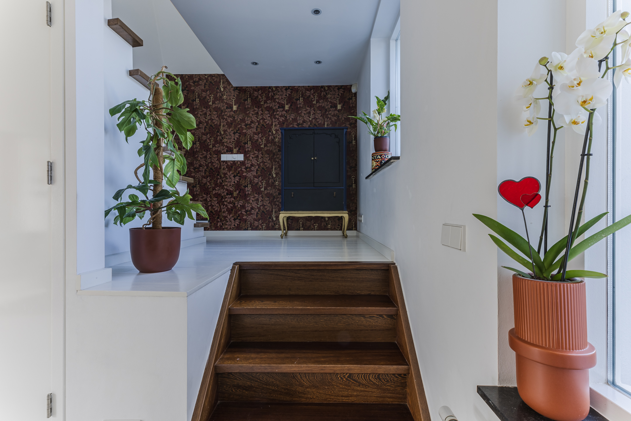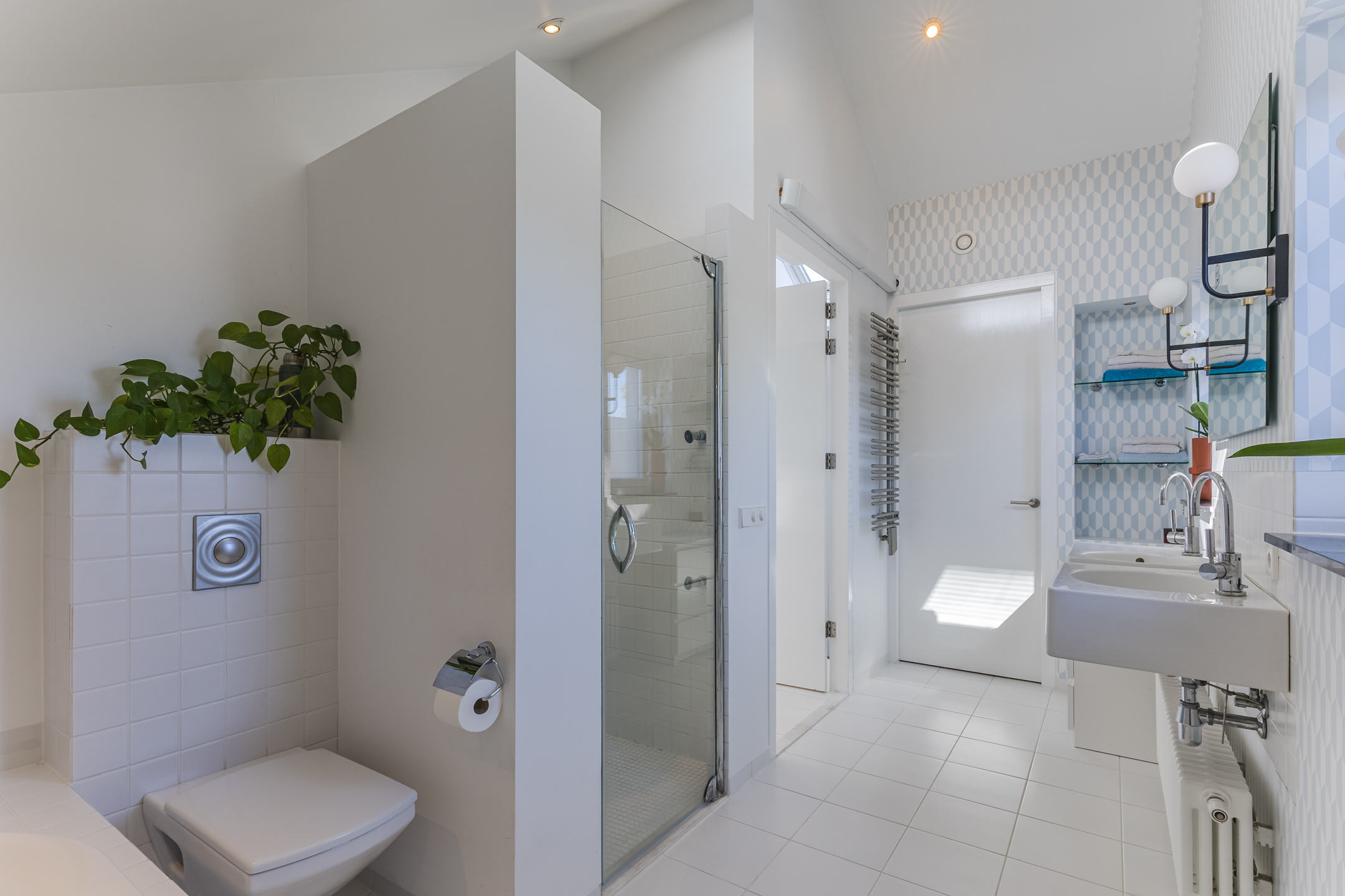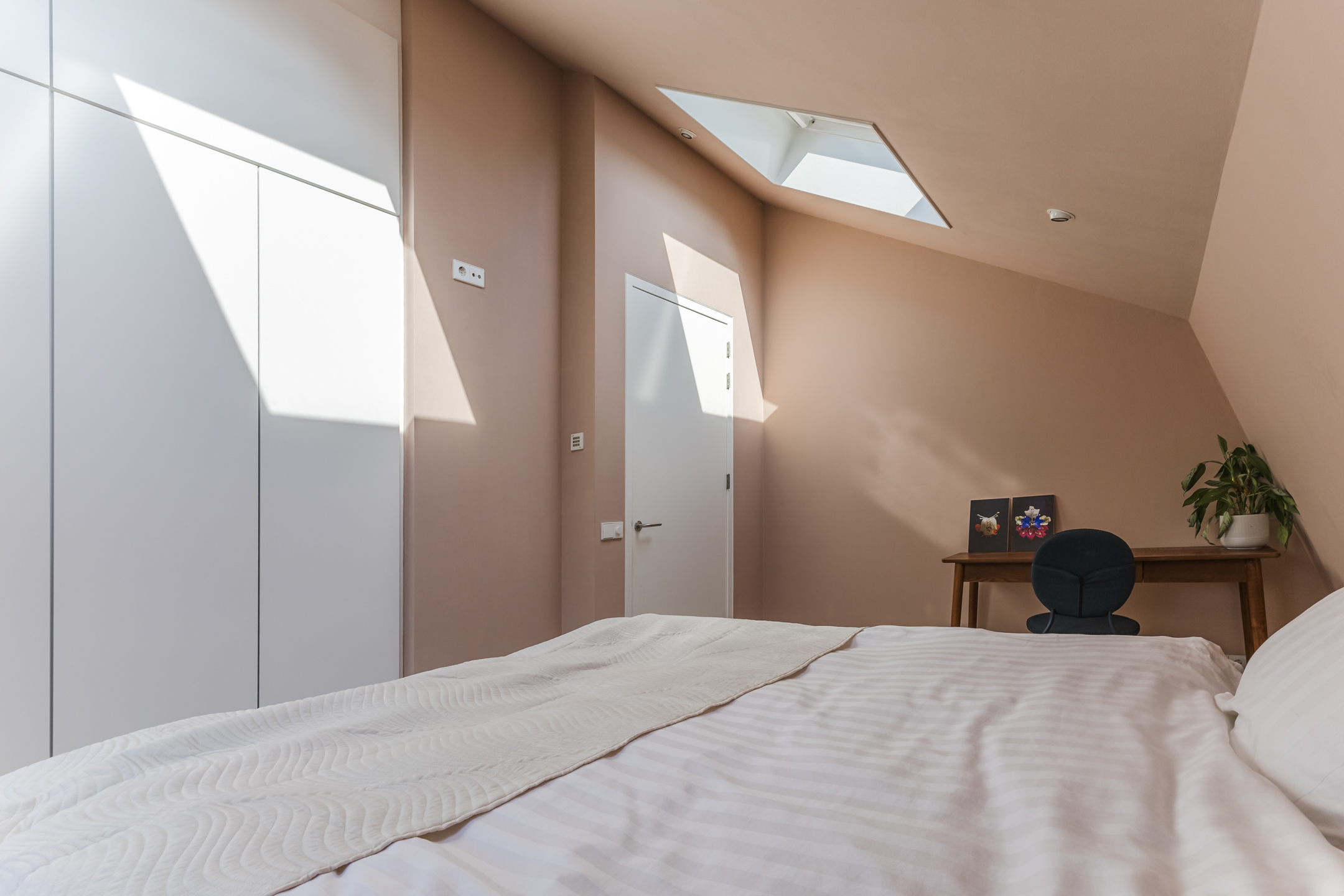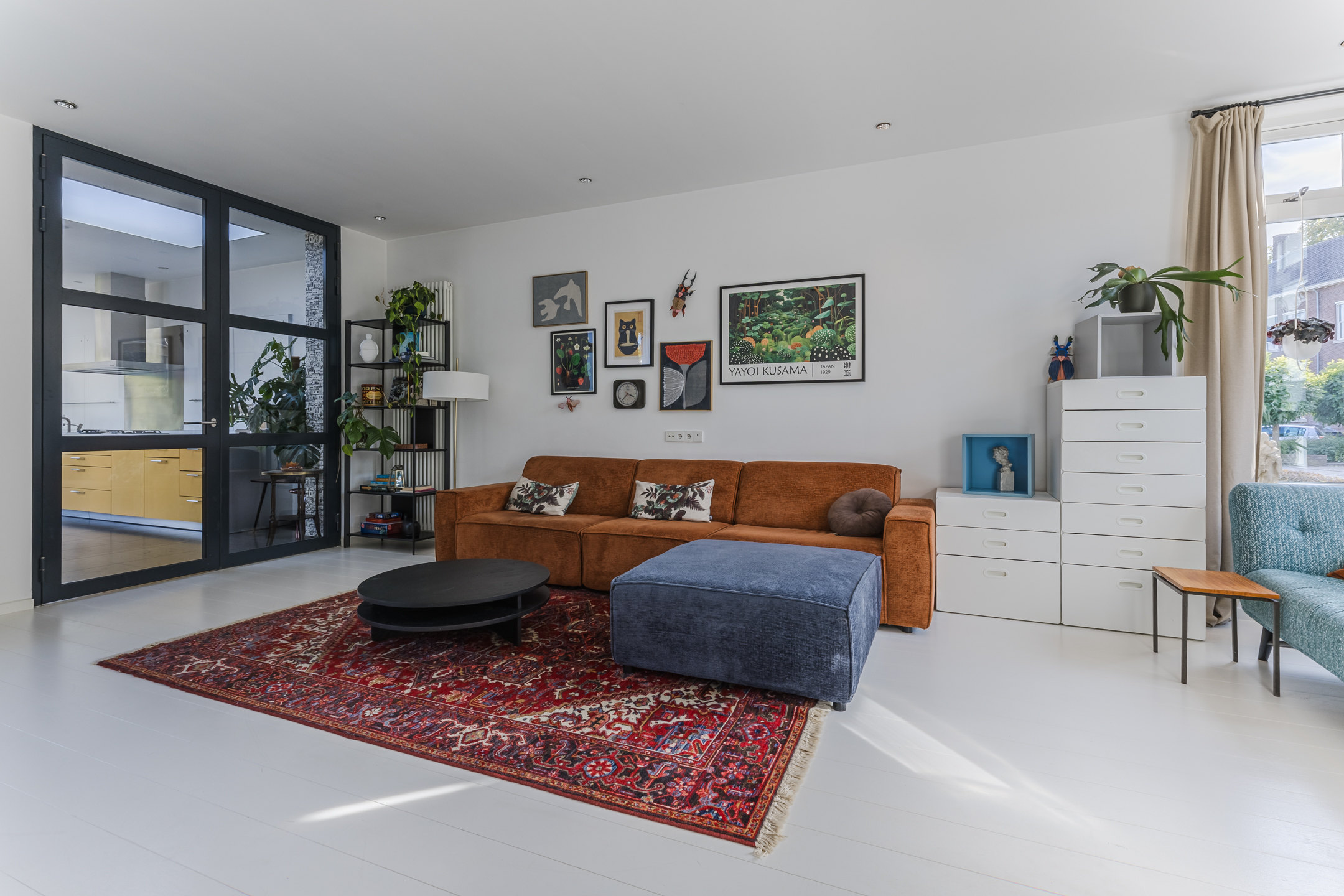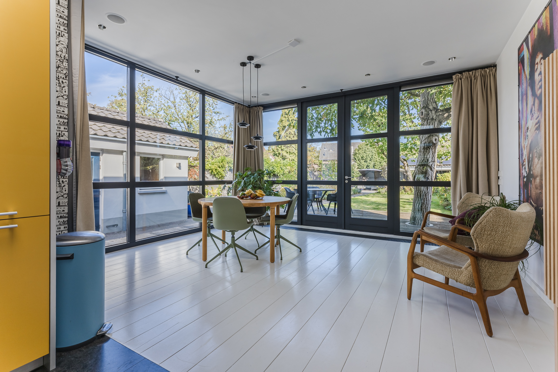 غرفة المعيشة الفسيحة، المزودة بمدفأة غاز، تتصل بسلاسة بمطبخ مفتوح مليء بالضوء ومُجهز بمستوى راقٍ من التشطيب. تدفئة أرضية، أسقف عالية، ومواد مختارة بعناية تضفي إحساسًا بالراحة، بينما توفر الأبواب المحورية فواصل ناعمة بين المساحات. يضم المطبخ مجموعة من الأجهزة المدمجة، وإطلالة على الحديقة، ومرونة للحياة اليومية والضيافة. أما غرف النوم الثلاث فتوفرها حمام أنيق مزود بتدفئة أرضية ودش بدون عتبة، وقد استُكمل التشطيب فيها بحكمة واهتمام.