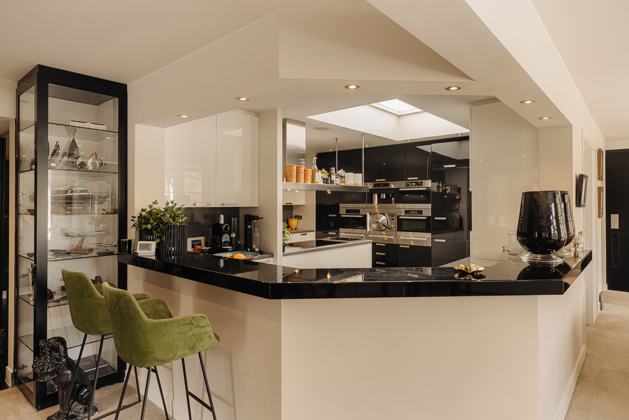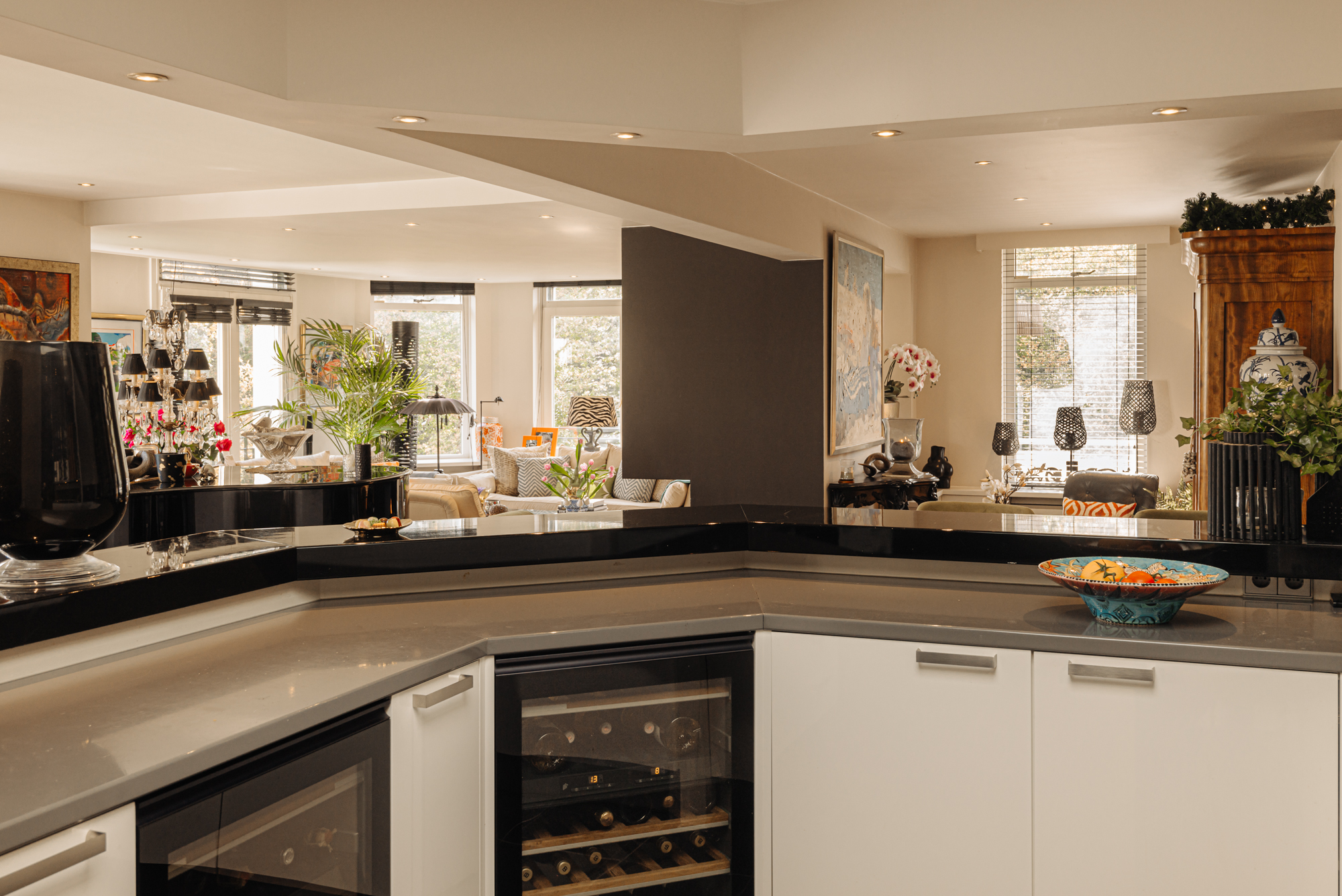 Halfopen designkeuken voorzien van hoogwaardige Miele-apparatuur, waaronder twee ovens en wijnklimaatkasten en een grote bar.