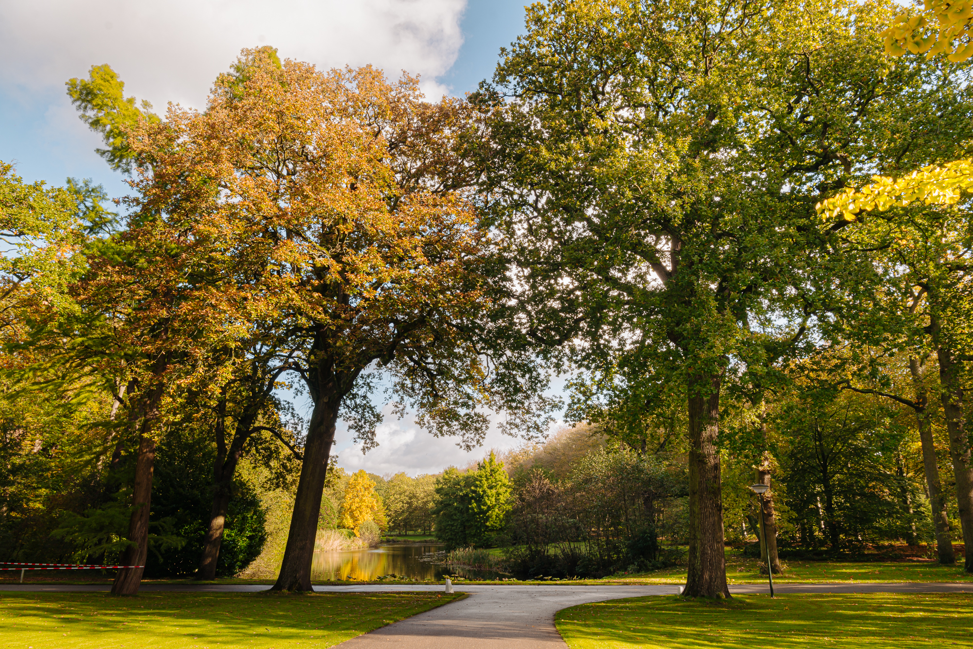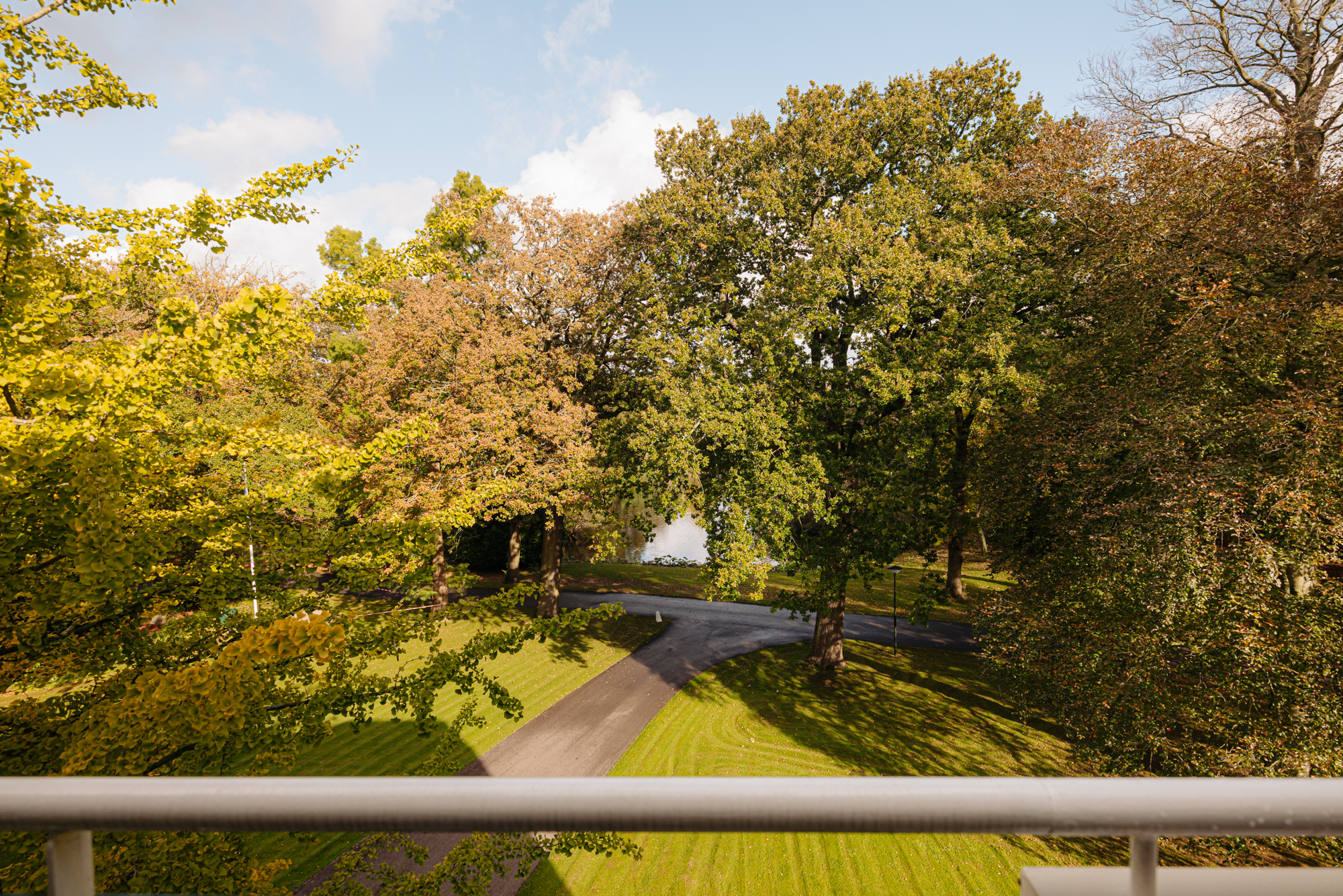 Ruime woonkamer (drie samengetrokken kamers) met gashaard, grote raampartijen en daardoor prachtig uitzicht. Twee balkons omringd door groen.