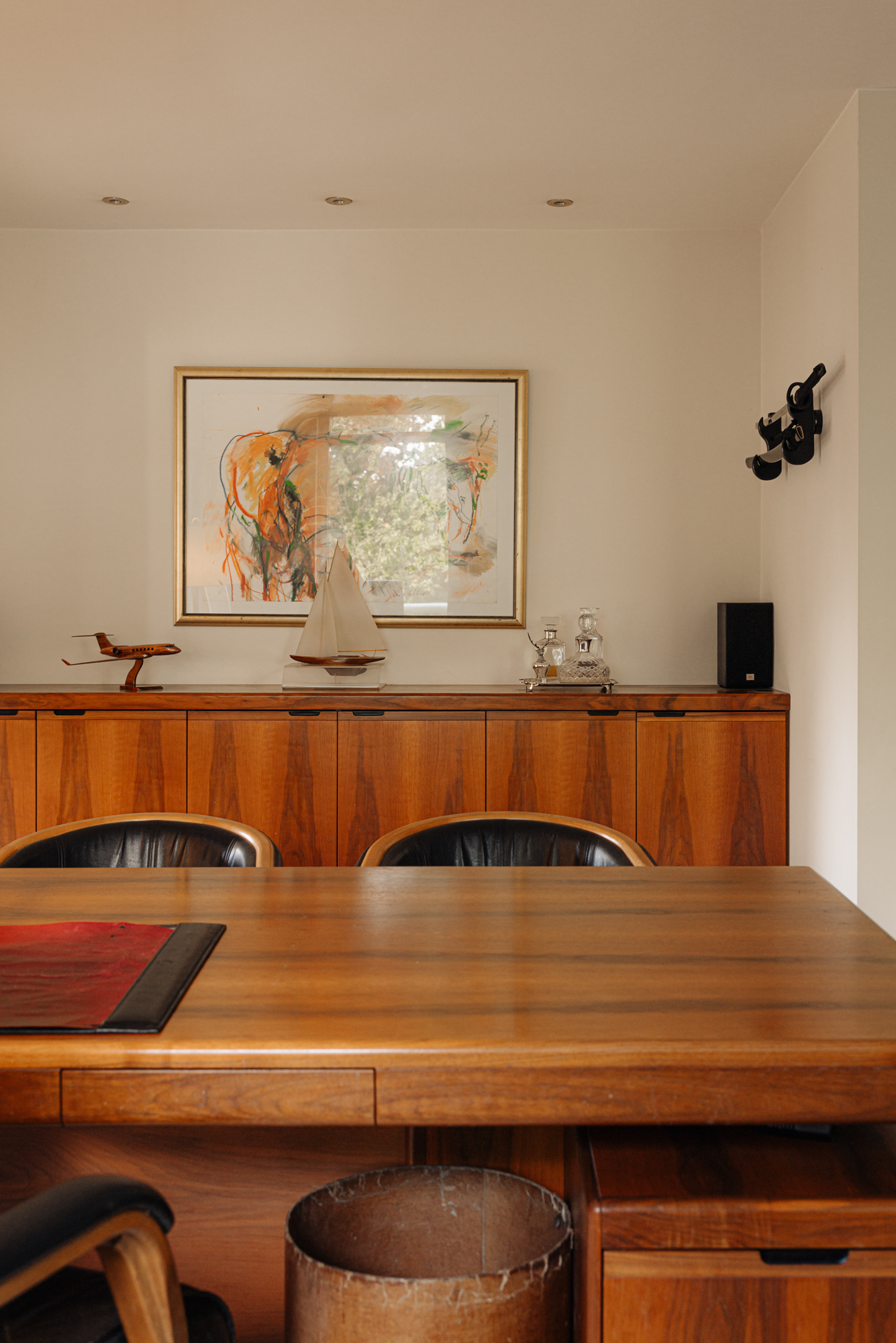 Aparte wasruimte en een aparte berging op de gang. Stijlvolle werkkamer met notenhouten kasten en bureau.
