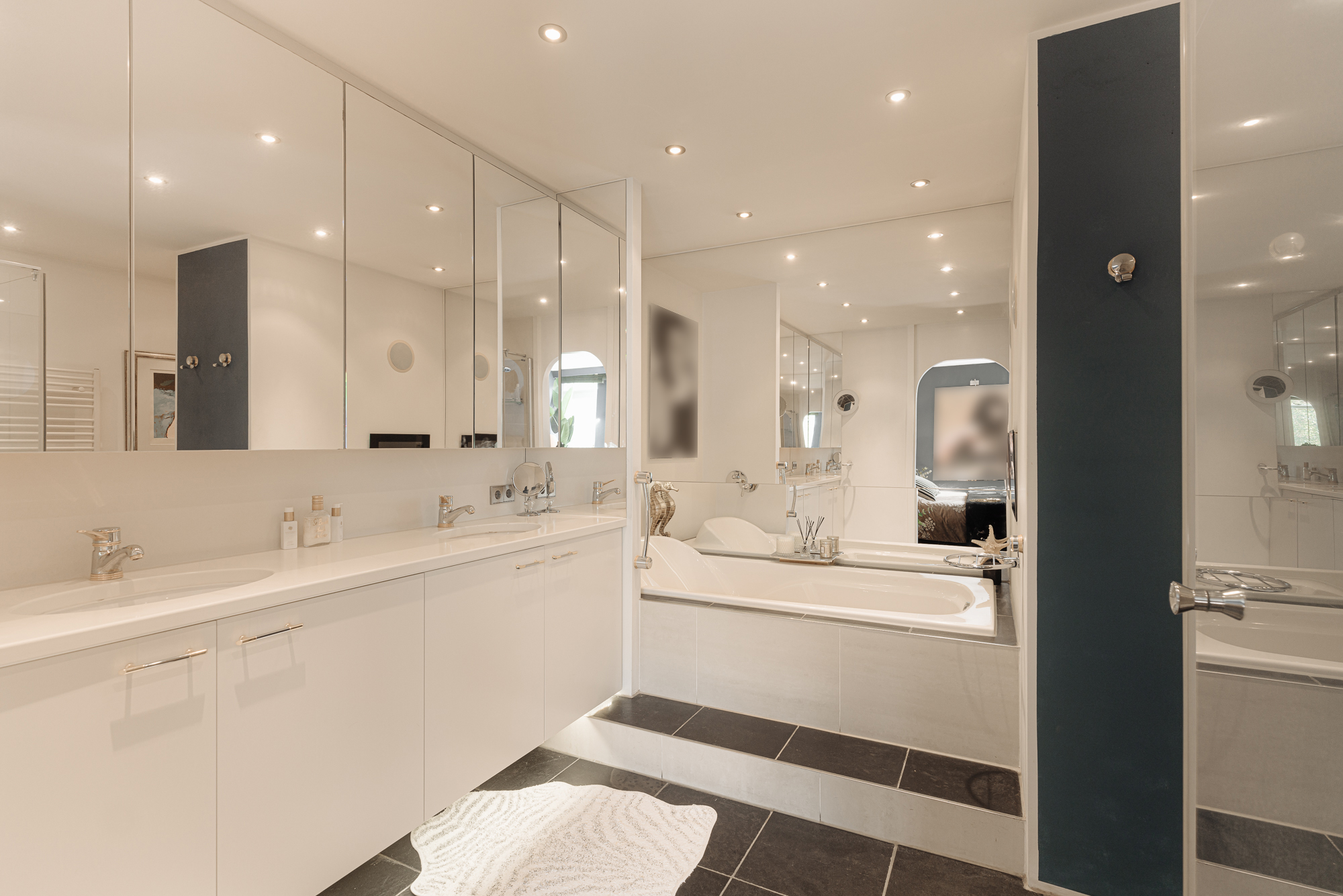 Hoofdslaapkamer aan de achterzijde ensuite badkamer met een stoomdouche, royaal ligbad en een dubbele wastafel. De tweede slaapkamer aan de voorzijde heeft ook een eigen badkamer.