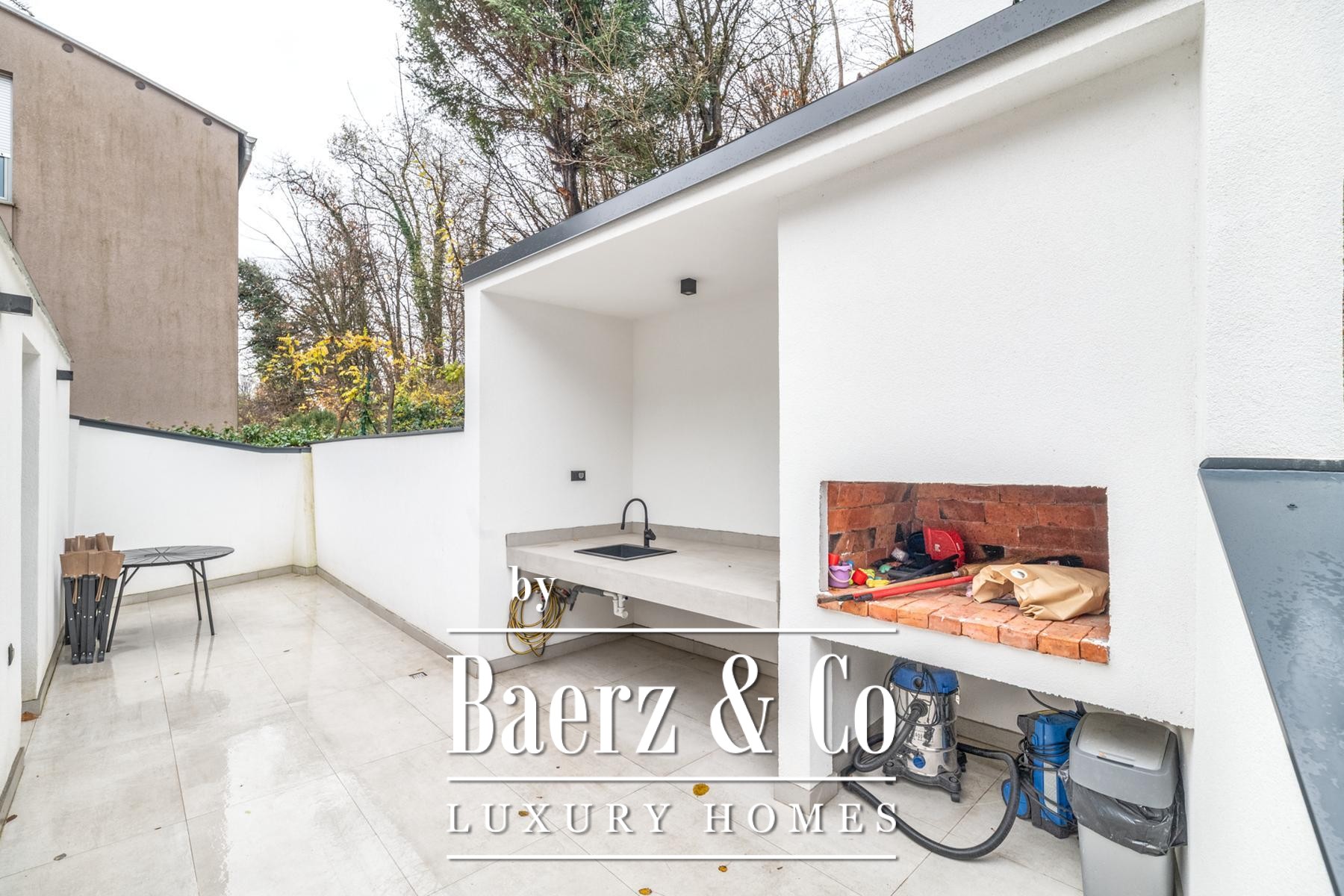 Das Erdgeschoss vermittelt ein Gefühl von beruflicher und privater Ausgewogenheit und verfügt über ein Büro, ein Fitnessstudio, einen Trainingsraum mit Tatamimatten, ein Badezimmer sowie durchdachten Stauraum. Im ersten Obergeschoss öffnet sich ein großzügiger Wohnbereich mit maßgefertigter Küche, Essbereich und Lounge, ergänzt durch eine große Terrasse mit Kamin, Grill und Sommerküche — einladend für eine kultivierte Geselligkeit. Im Dachgeschoss befinden sich drei ruhige Schlafzimmer, ein Badezimmer, ein Flur und eine Terrasse und bieten einen intimen Rückzugsort fernab des städtischen Lebensrhythmus.