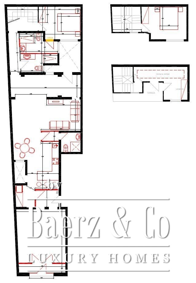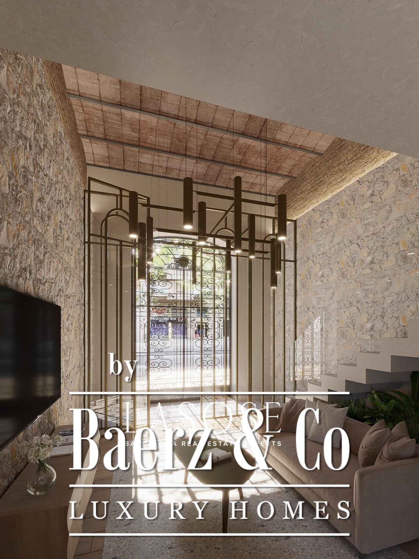 Drei Schlafzimmer und drei Bäder bieten Privatsphäre und Komfort, wobei die Hauptsuite mit katalanischem Gewölbe, Ankleideraum und elegantem Bad en suite hervorsticht. Die private Terrasse auf der oberen Ebene bietet sowohl Abgeschiedenheit als auch Funktionalität und verfügt über einen diskret integrierten Hauswirtschaftsbereich für den täglichen Bedarf. Klimaanlage, Einbauschränke und edle Ausstattungsdetails vervollständigen das exklusive Wohngefühl.