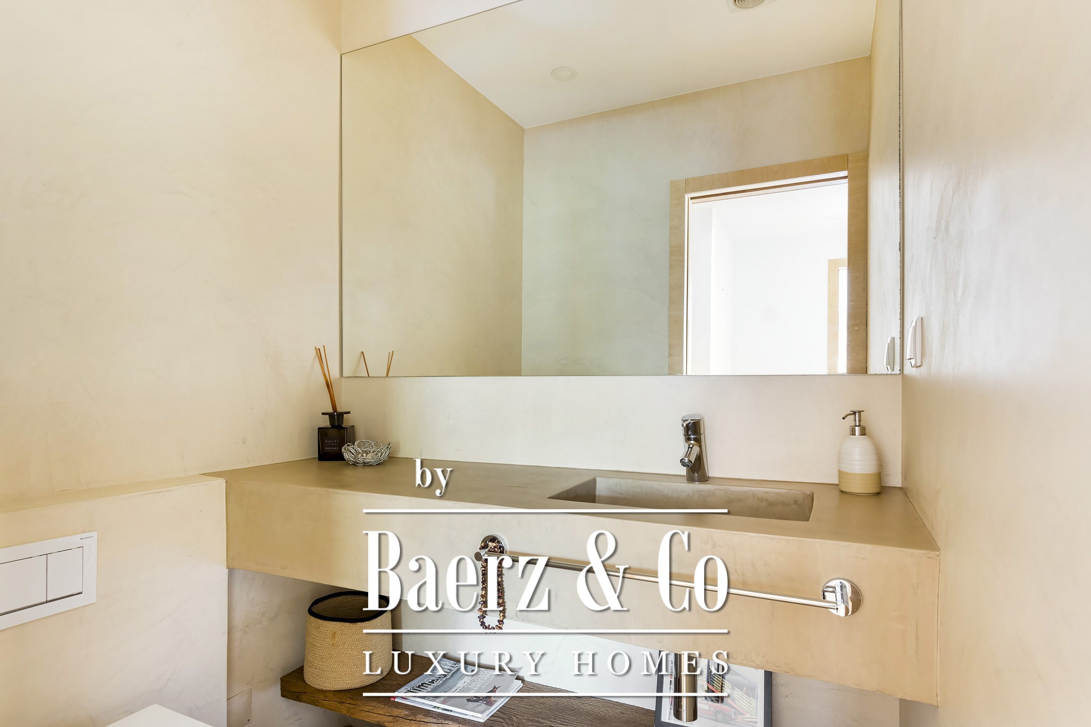 Die Schlafzimmer erstrecken sich über zwei Ebenen, wobei das Obergeschoss drei helle Zimmer und elegant ausgestattete Bäder bietet. Im unteren Bereich sorgen zwei Suiten für eine Balance aus Privatheit und Offenheit, darunter eine mit großzügigem Ankleidebereich, direktem Zugang zur Terrasse und einem Bad mit Meerblick.