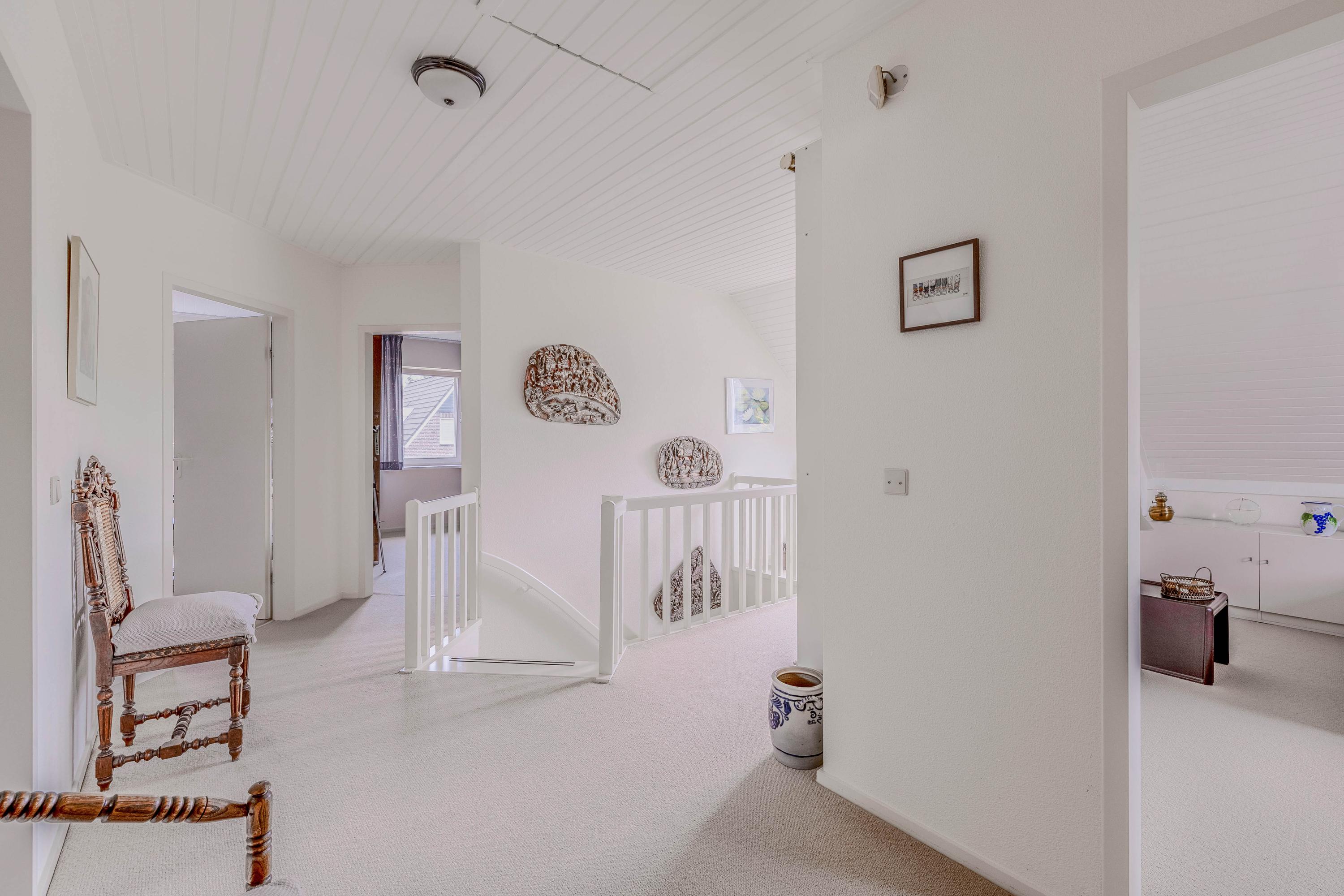 Fünf weitere Schlafzimmer und ein zweites Badezimmer befinden sich im Obergeschoss. Eines der Zimmer bietet Zugang zu einem möglichen Wellnessbereich, ein weiteres öffnet sich zu einem Balkon. Ein Keller, ein Dachboden und eine 21 m² große, beheizbare Garage mit Sektionaltor und Gartenzugang schaffen flexible Stauraummöglichkeiten. Im Außenbereich laden mehrere Sitzplätze zwischen altem Baumbestand und liebevoll gestalteten Beeten zum Verweilen ein – perfekt für ruhiges Familienleben oder gesellige Zusammenkünfte.