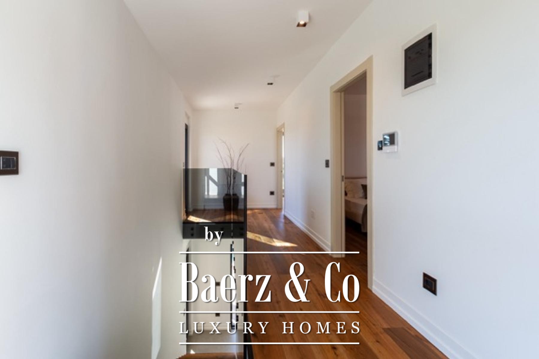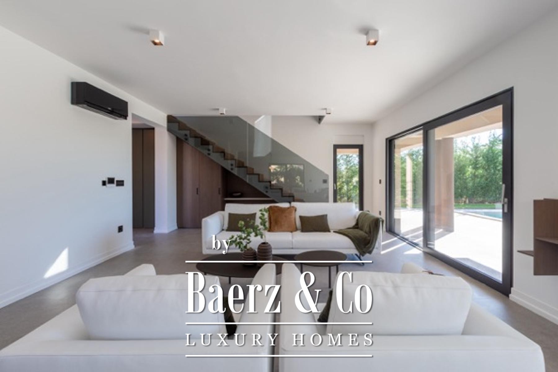 Beim Betreten des Hauses vermitteln hohe Decken und ein offener Wohnbereich ein großzügiges, lichtdurchflutetes Ambiente. Panoramaverglasung eröffnet den Blick auf einen sorgfältig angelegten Garten sowie auf einen beheizten Pool mit den Maßen 9,5 mal 3,5 Meter. Die Hauptebene verbindet sich fließend mit dem Außenbereich; eine automatische Bewässerungsanlage hält den eleganten Innenhof stets gepflegt. Im Zentrum des Hauses befindet sich eine Glaswendeltreppe, die zu drei Schlafzimmern führt – jedes mit eigenem, modern ausgestatteten Bad. Zwei Schlafzimmer haben Zugang zu privaten Terrassen, die zu entspannten Nachmittagsstunden einladen.