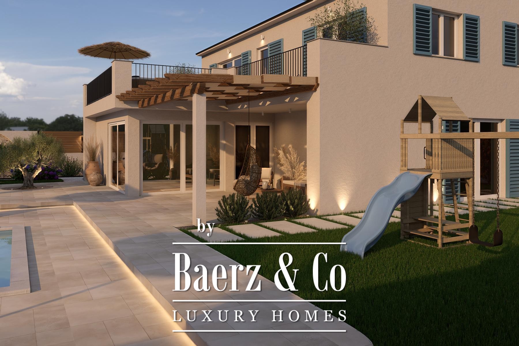 Der Gartenbereich erstreckt sich rund um einen Swimmingpool mit Sonnenliegefläche und großzügiger Terrasse, eingebettet in mediterrane, reife Bepflanzung. Eine Sommerküche schafft den perfekten Rahmen für geselliges Speisen und entspannte Momente. Die Steinvilla Zadar Okolica ist ideal für privates Wohnen das ganze Jahr über oder als strategische Anlage, mit allen Annehmlichkeiten des täglichen Lebens in unmittelbarer Nähe und direktem Zugang nach Zadar. Die Fertigstellung ist für Mai 2026 vorgesehen.