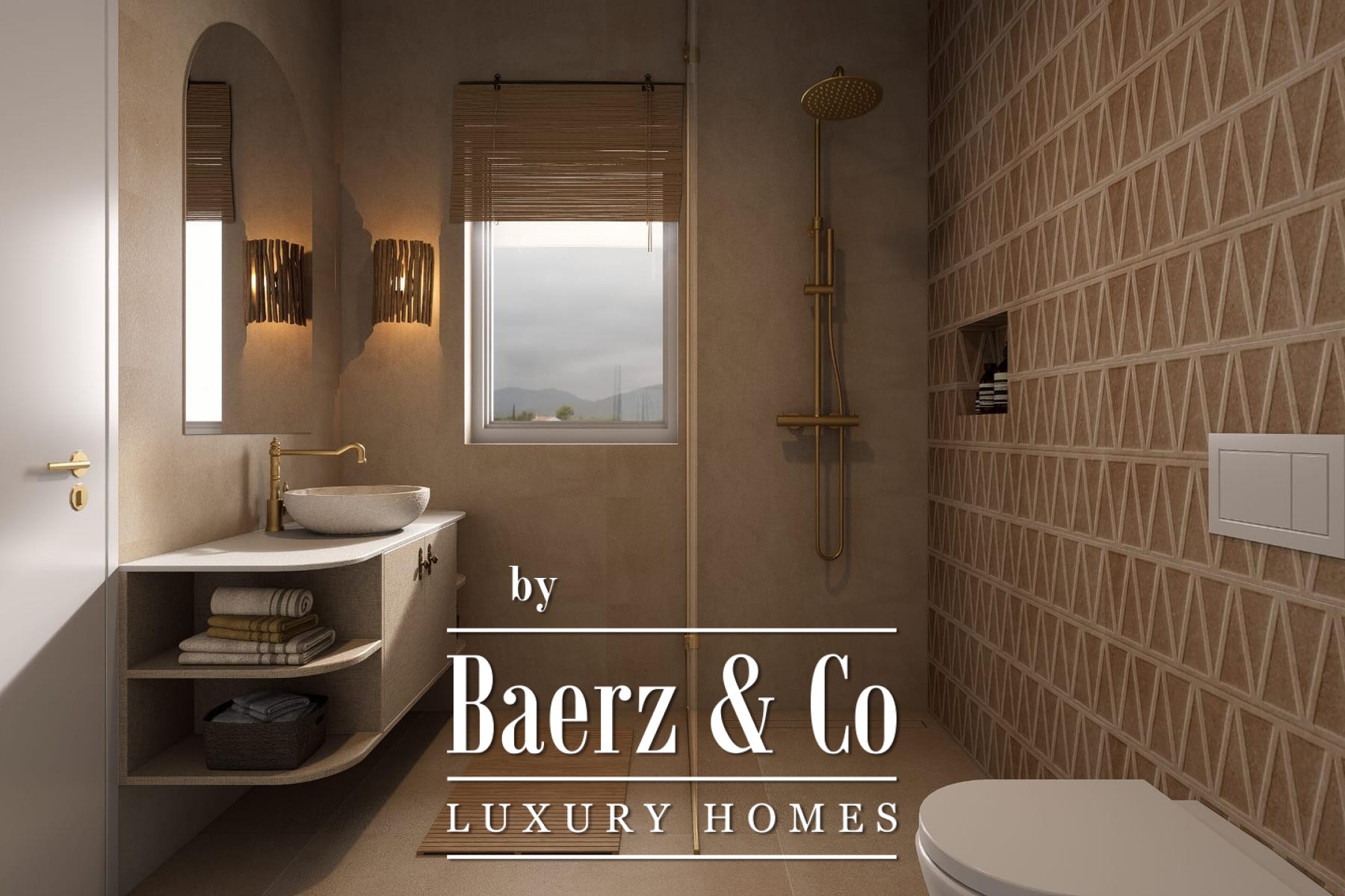 Im Obergeschoss erwarten Sie drei Schlafzimmer und zwei Badezimmer mit Zugang zu einer überdachten Terrasse, die Licht und Luft frei fließen lässt. Die Auswahl an Materialien – Stein, Holz und hochwertige Ausstattungen – unterstreicht den dezenten Luxus der Villa und sorgt für ein warmes Ambiente.