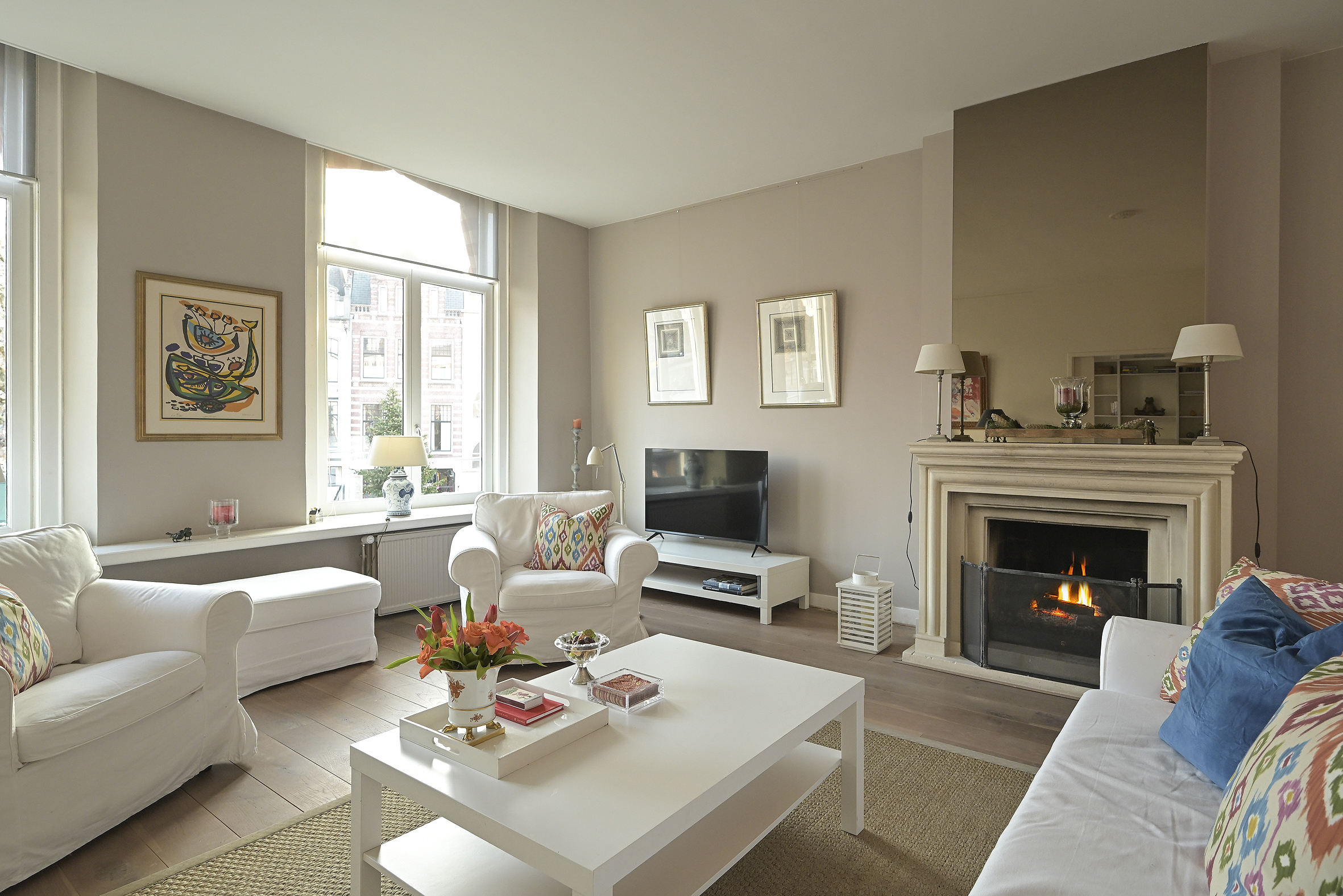 At the front of the building is the imposing living room, high ceilings, a stylish fireplace, and a phenomenal view of the Hofvijver. From the living room, there is an elegant passageway to a spacious library or bedroom, complete with open bookcases. Adjacent is a hallway with ample closet space and a finished marble bathroom with a vanity, shower, and toilet. The kitchen is equipped with built-in appliances and ample closet space. At the rear of the apartment is the very spacious master bedroom, offering peace and privacy. This room opens onto a hallway with a walk-in closet and space for the gas central heating boiler. There is also a separate laundry room with connections for a washer and dryer and additional storage space. The second, luxurious marble bathroom features a bathtub, a spacious walk-in shower, a stylish vanity with a built-in vanity, and a toilet.