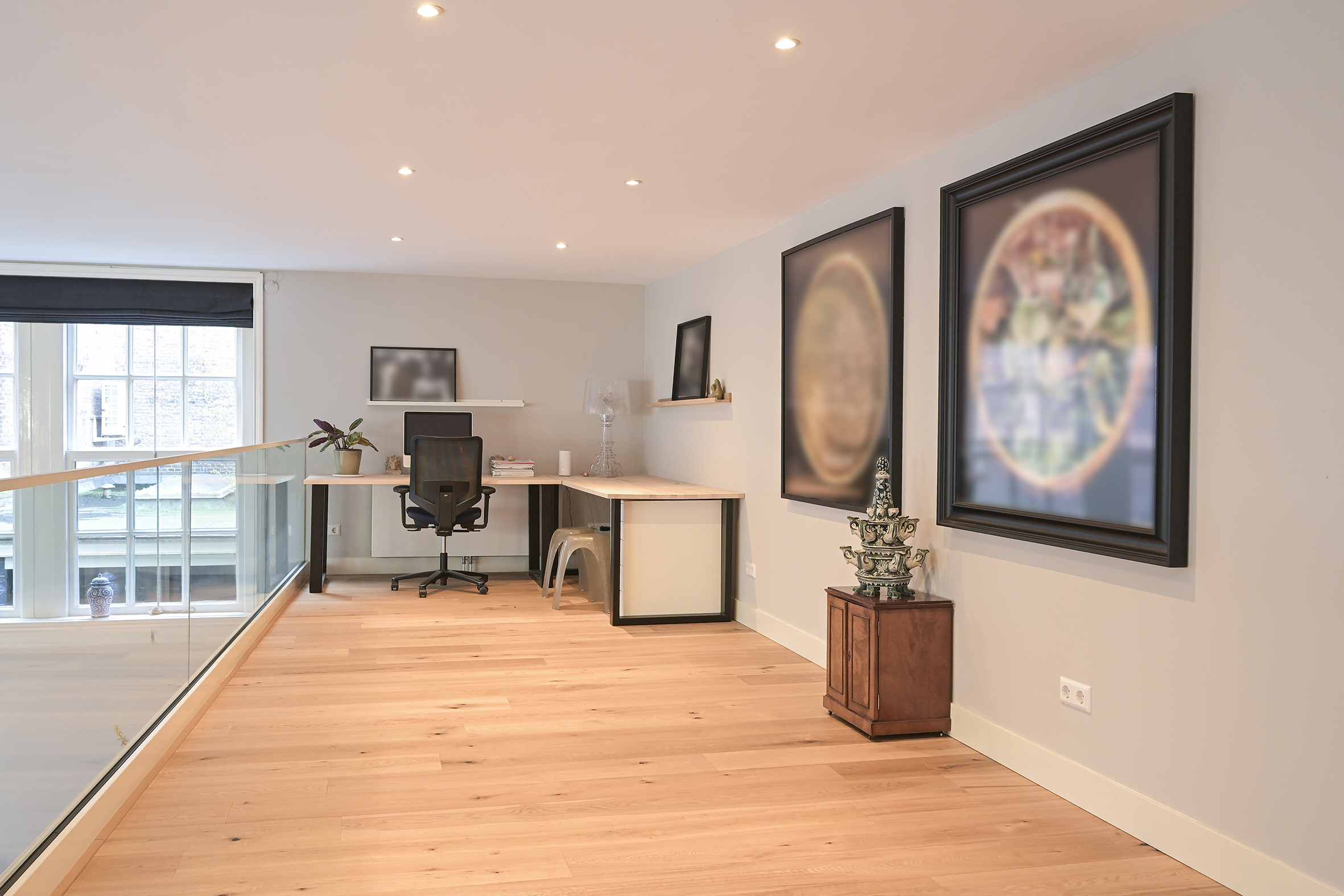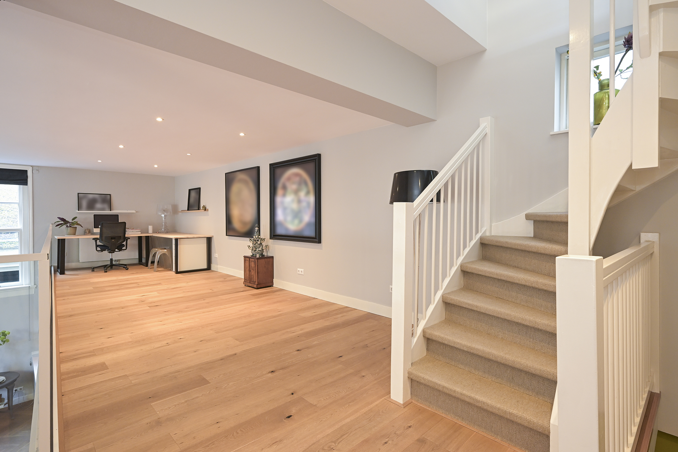 The first floor consists of a large L-shaped open space that can be utilized in various ways. Currently, there are two lovely, bright workspaces here, but if additional bedrooms are needed, they can be created here.