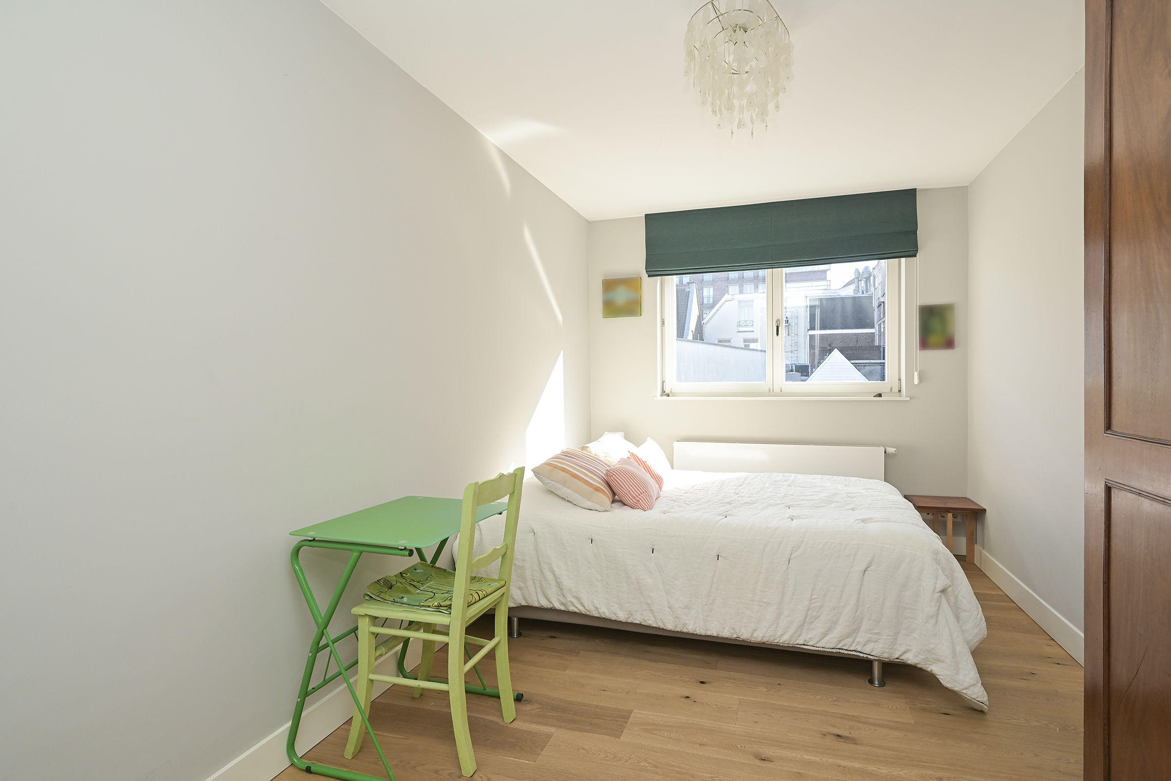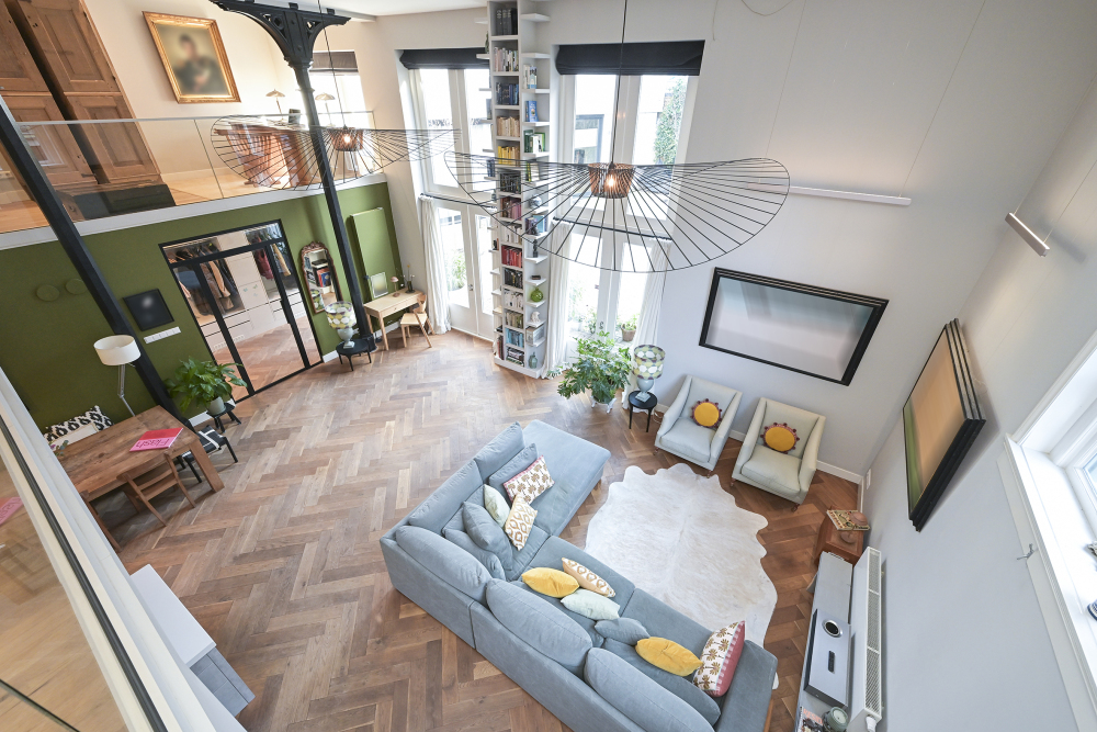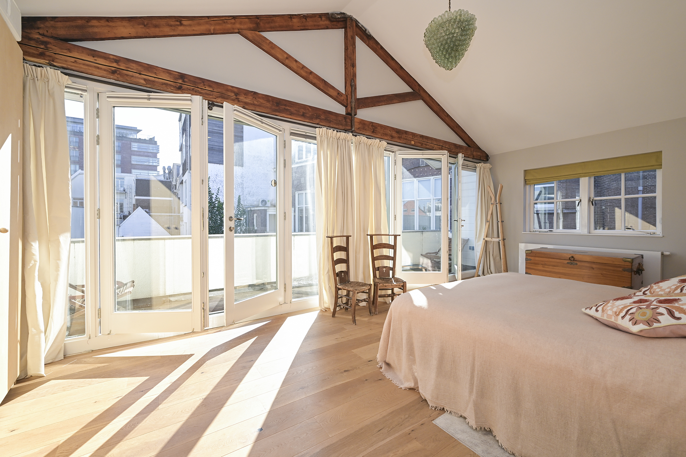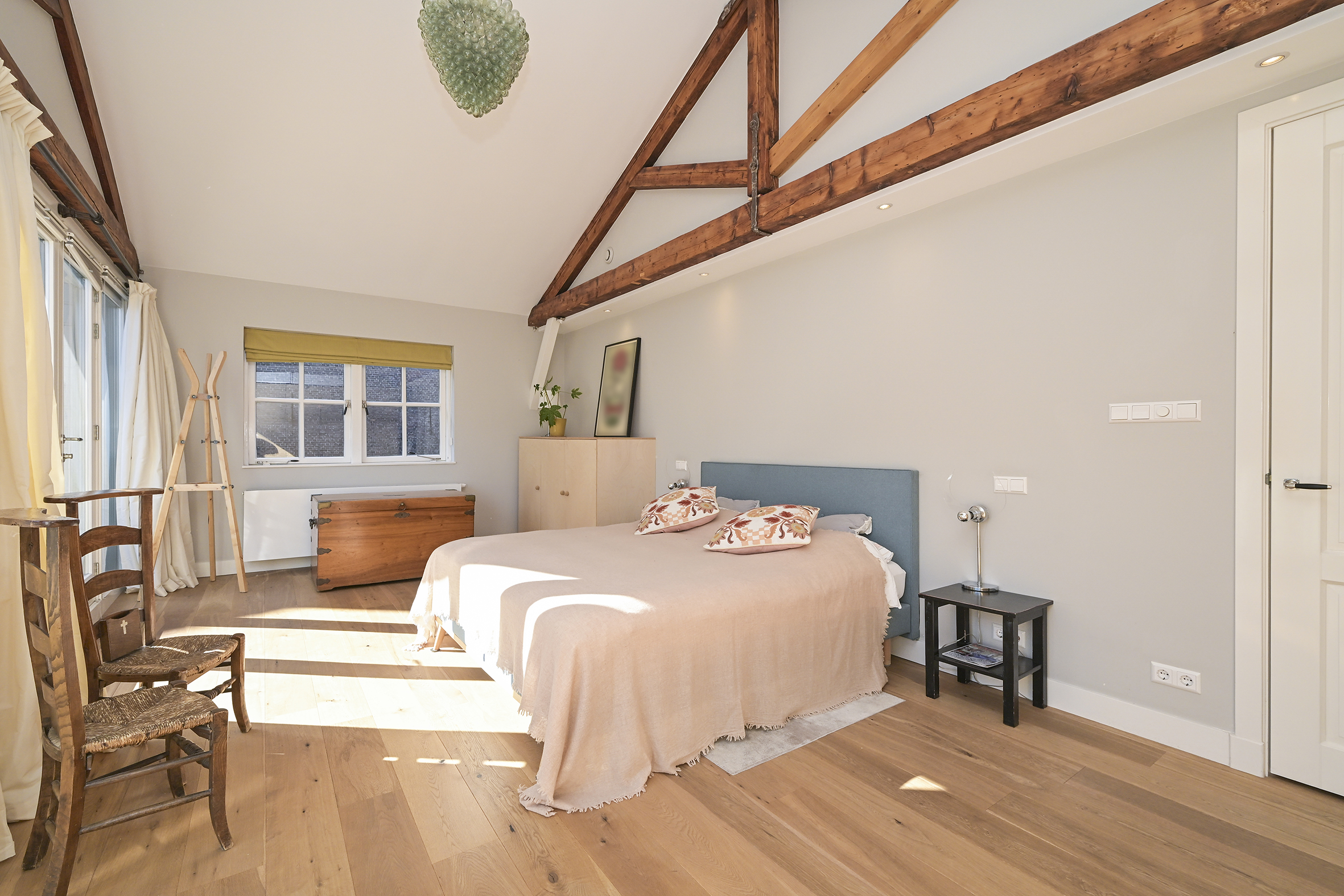 The second floor features three bedrooms (previously four), a spacious, sunny balcony, and two modern bathrooms. The master bedroom also has a loft-like feel with exposed rafters. From the hallway, there is access to an attic housing a heat recovery system, and a fixed staircase leads to the sunny rooftop terrace with panoramic views of The Hague.
