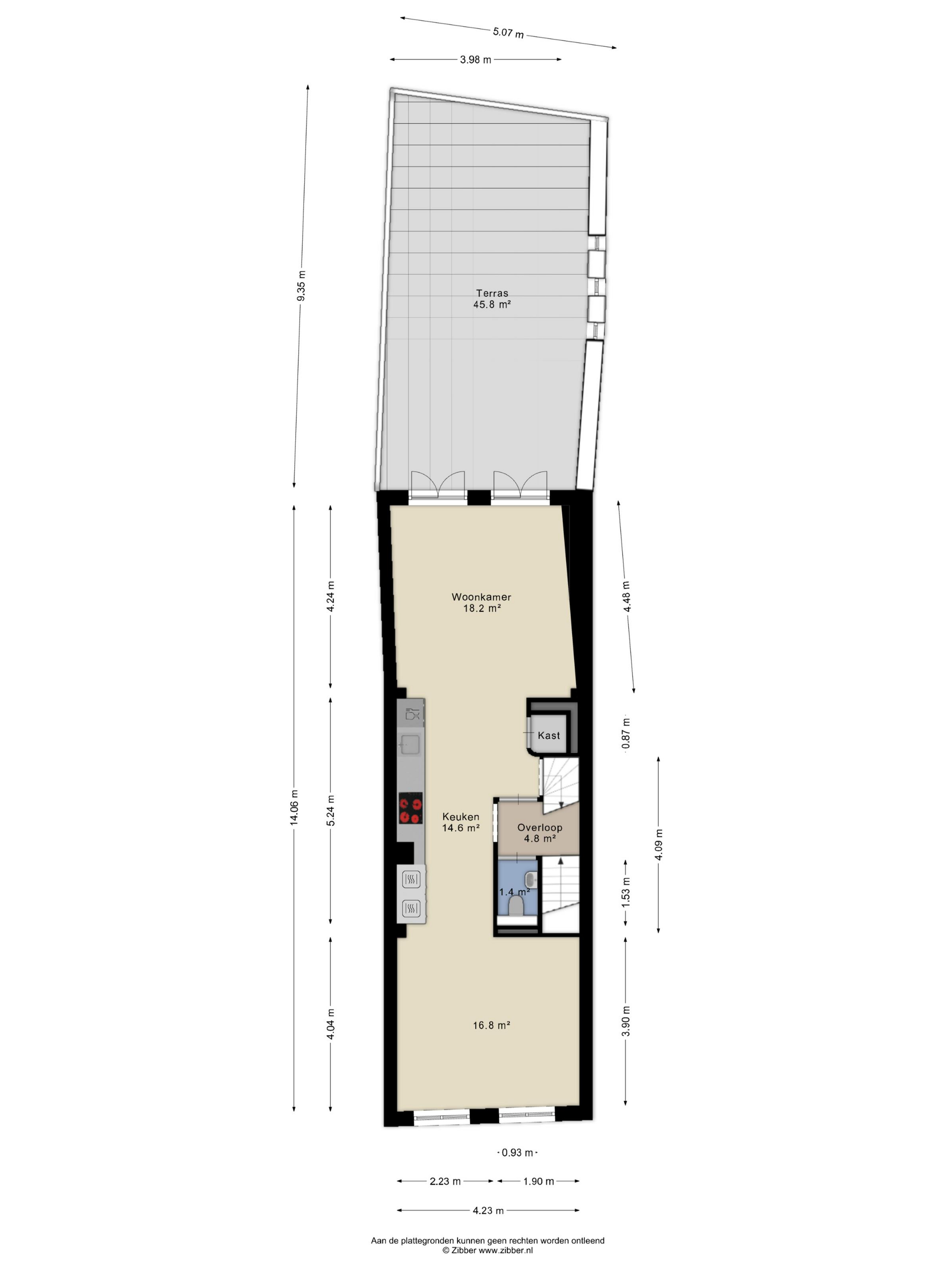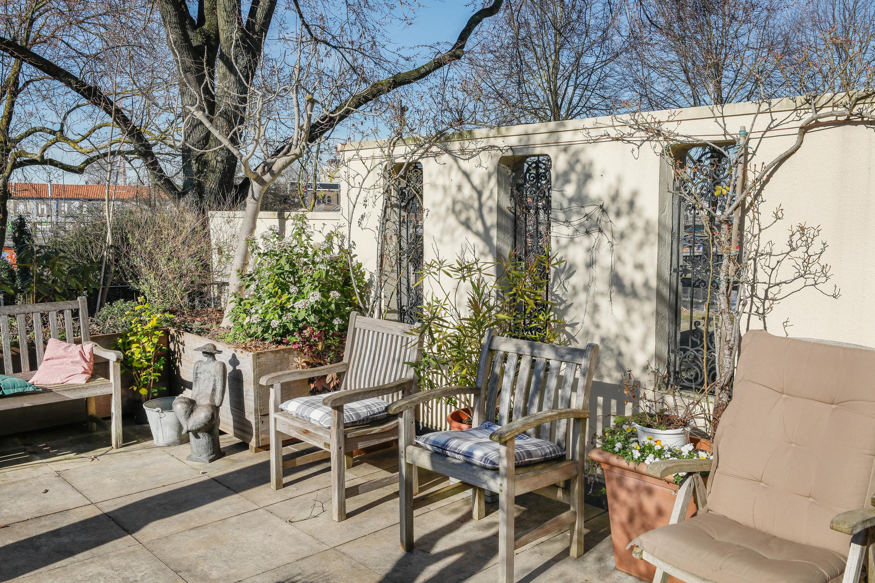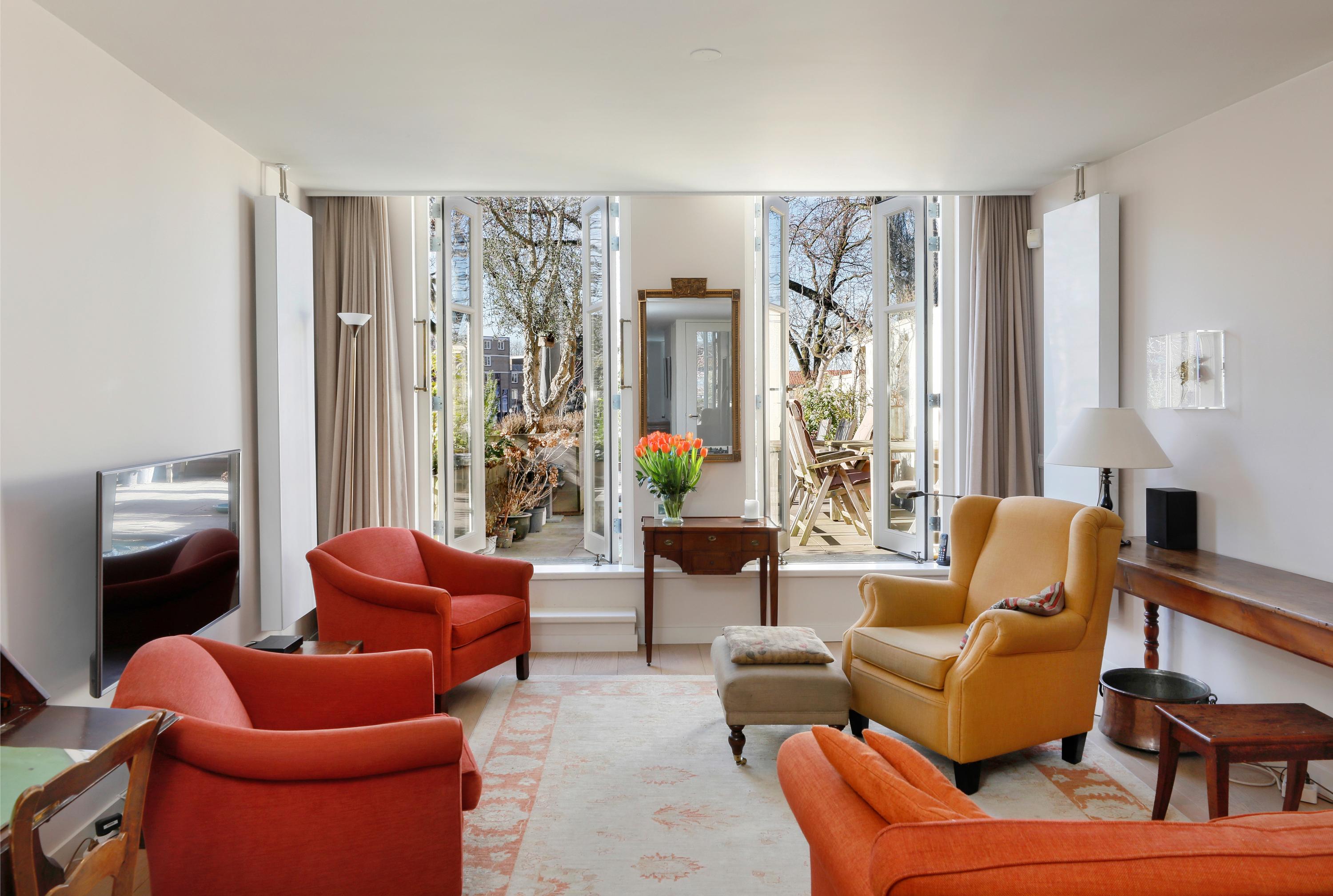 Here are the living room and kitchen. The low windows provide a beautiful view of the Brede Haven. At the rear is a large and sunny roof terrace where you can enjoy the sun from noon to sunset.