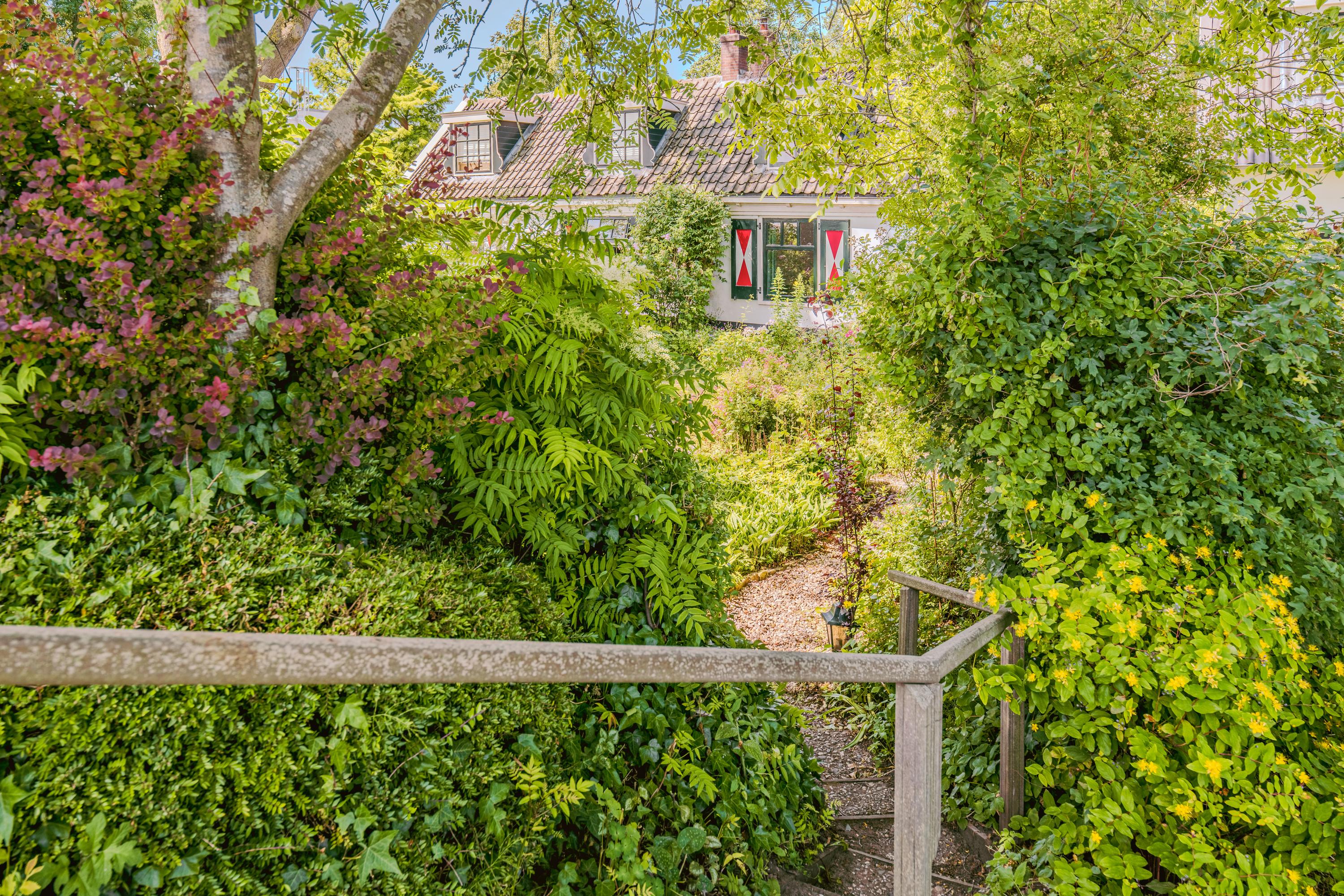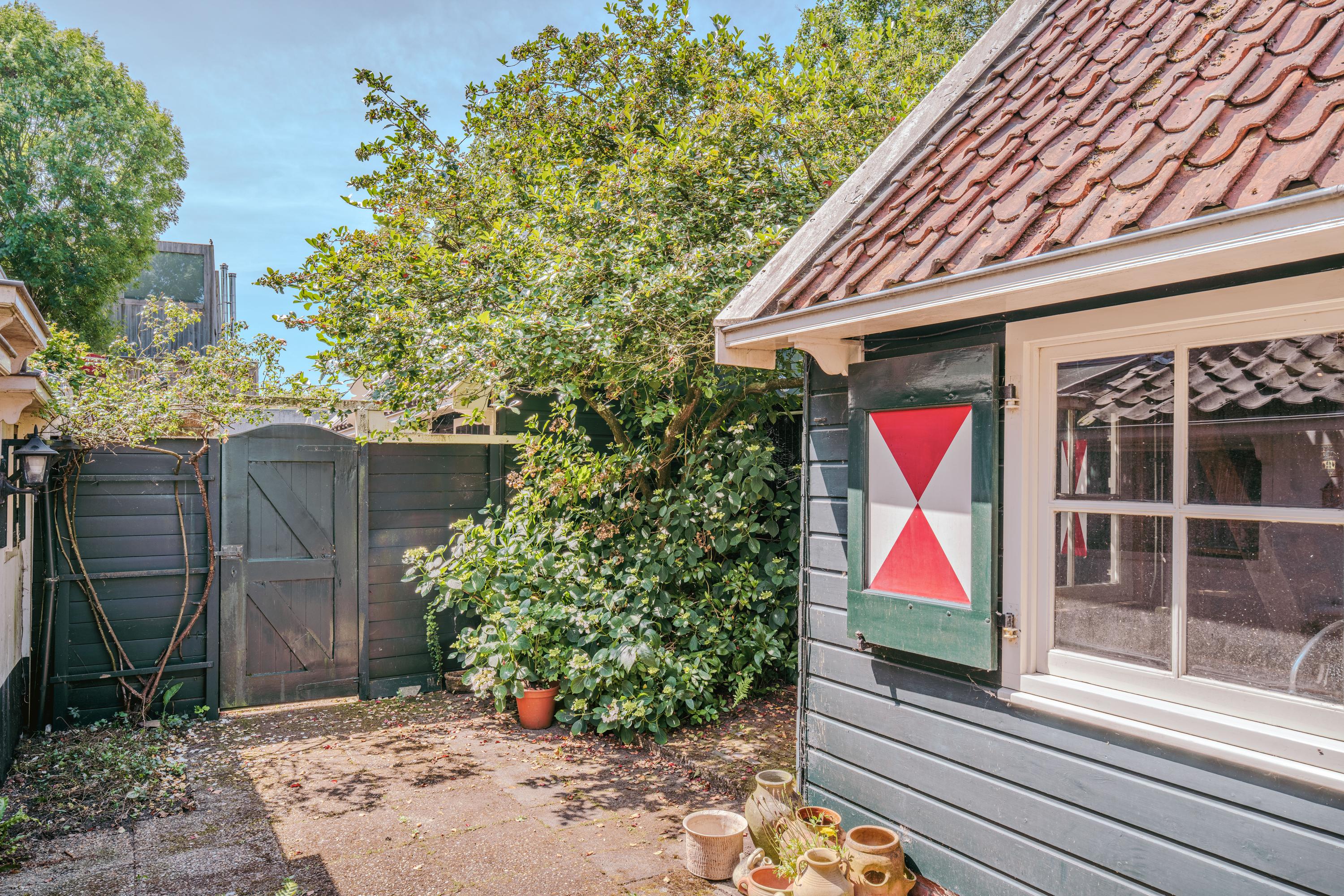 This authentic property offers a unique opportunity for those seeking a characteristic home in a special location, ready to be renovated entirely to one’s own taste. Situated along the Amsteldijk, the house lies slightly below road level and is partly hidden among the greenery. From the dike, a staircase descends to the front garden – a green space offering peace and privacy. On the right-hand side of the house, a narrow path runs along the façade to the front door, subtly set into the exterior wall.