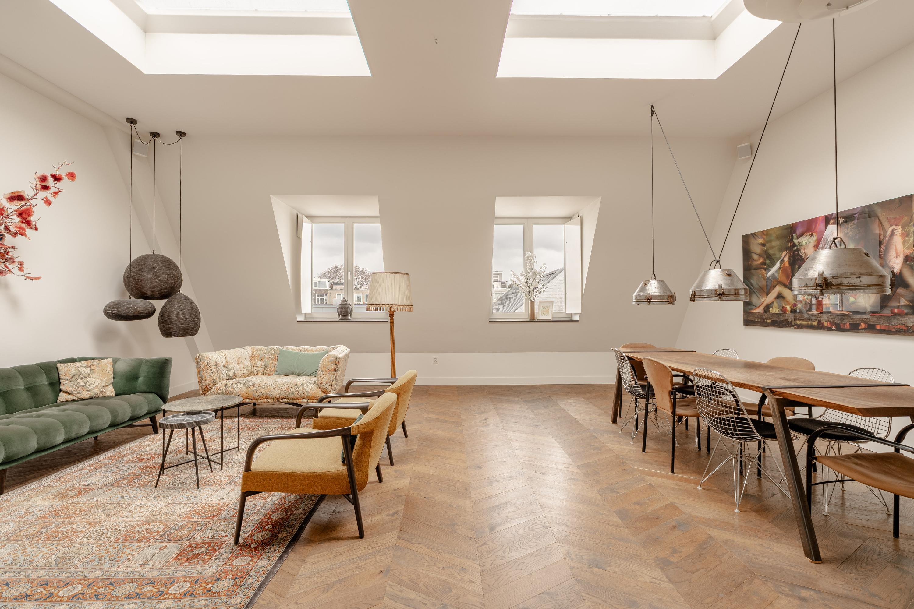 From the living room, a loft ladder provides access to the roof terrace, where you can quietly enjoy beautiful views over the Jordaan.