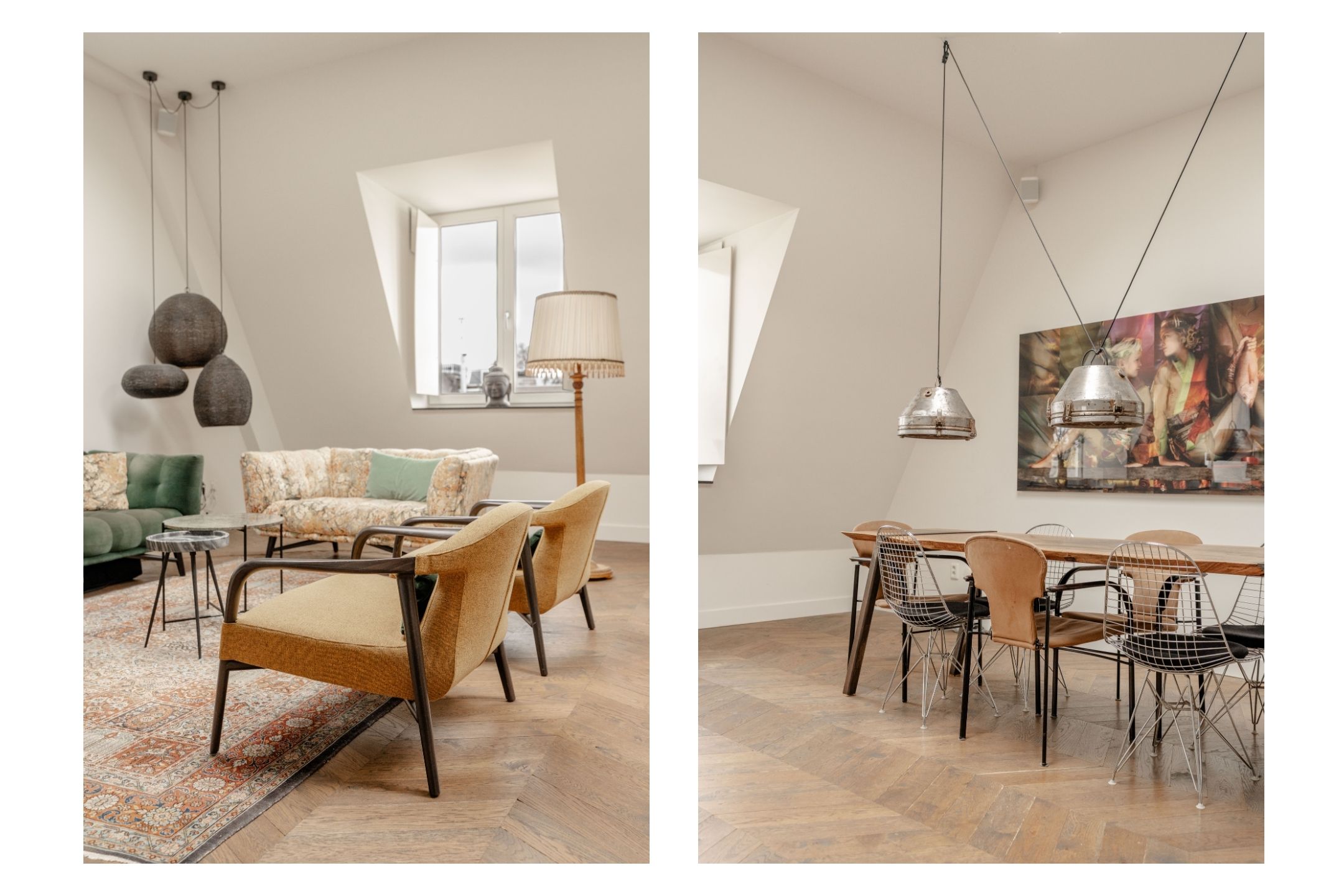 The third floor forms the main living level of the apartment. Here you will find the spacious and bright living room with open kitchen located at the front of the apartment. Thanks to the impressive ceiling height and multiple skylights, the space enjoys abundant daylight, creating an open and airy atmosphere. The wooden floor and clean finishes contribute to the warm and modern appearance.