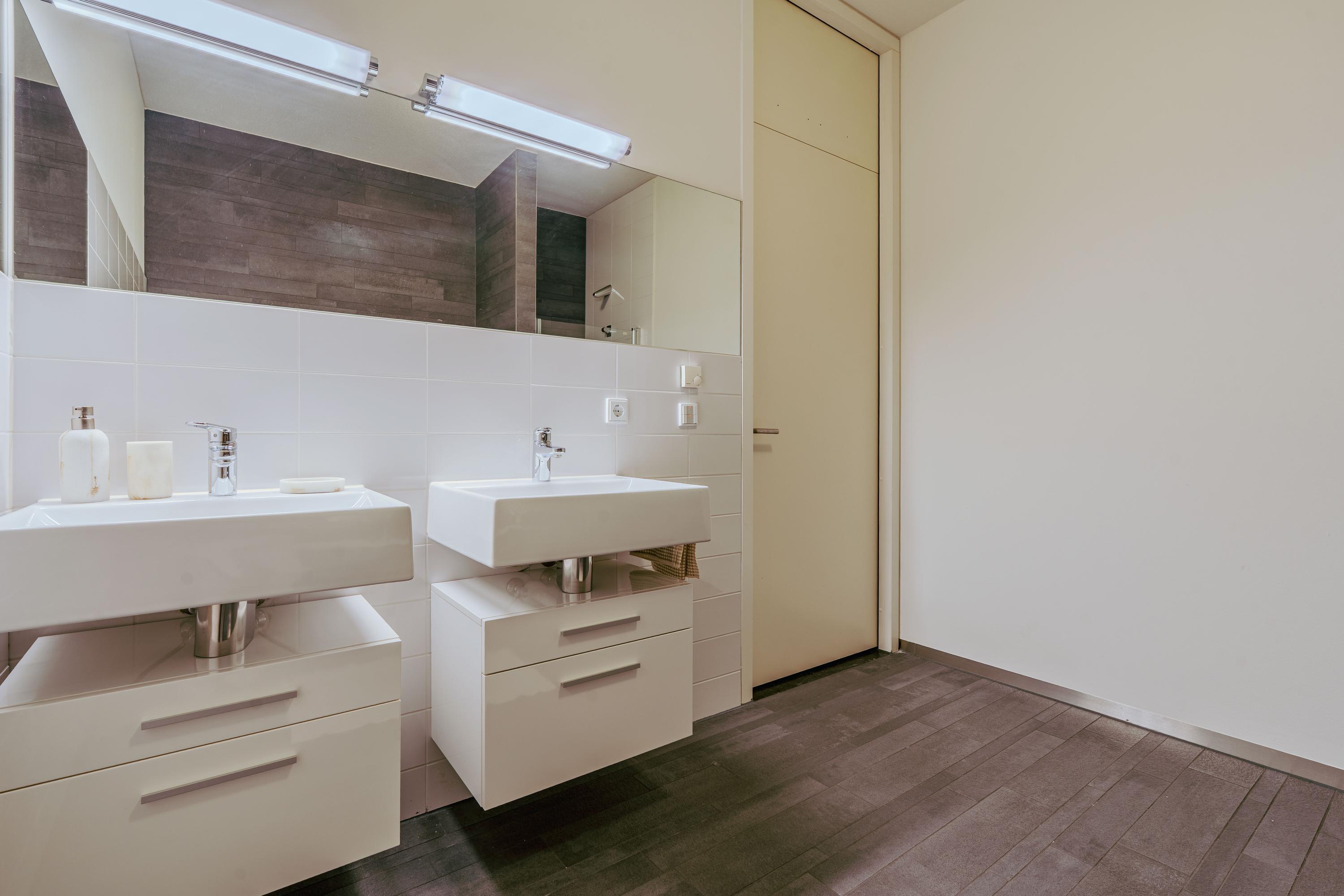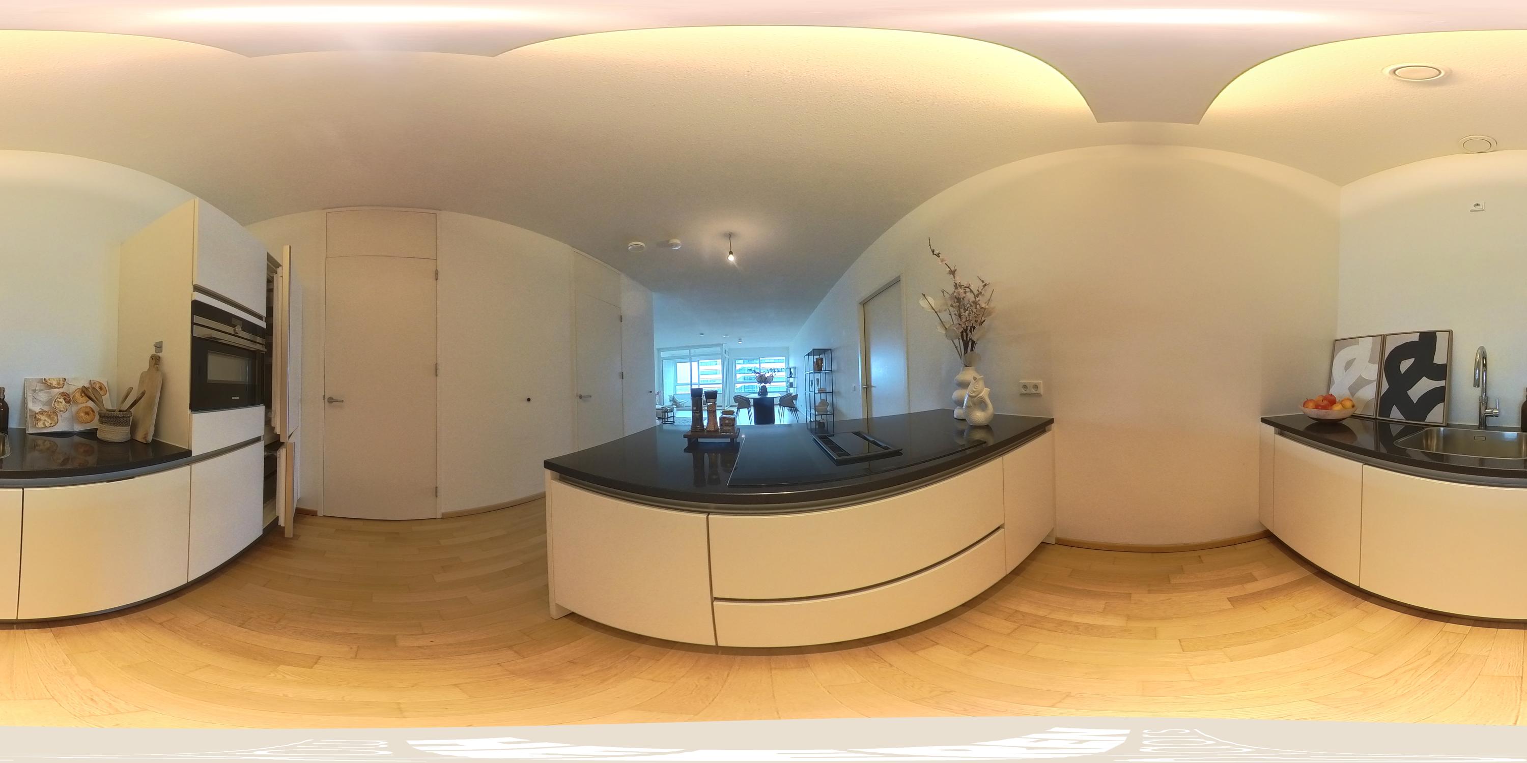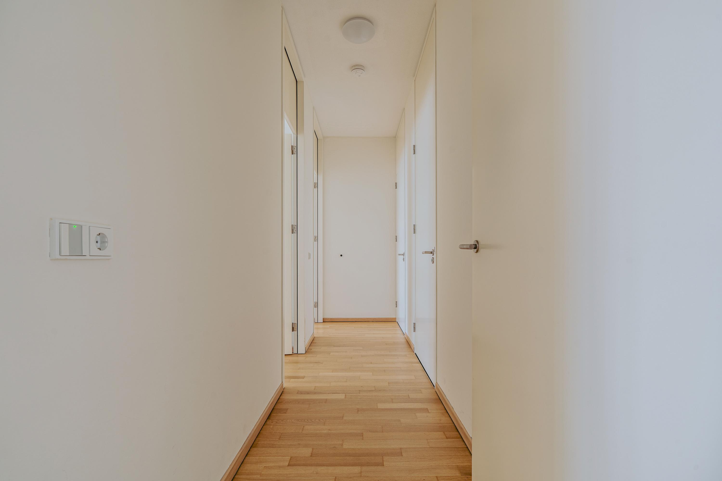 Upon entering, a spacious hallway welcomes you with a meter cupboard, separate toilet, and room for a coat closet. From here, you walk into the expansive and open-plan living room, where the breathtaking views immediately capture your attention. Floor-to-ceiling windows enhance the sense of space and light throughout. At the front of the apartment, you’ll find a sunroom — the perfect spot to unwind, read a book, or simply enjoy the panoramic view. The open kitchen at the rear is equipped with high-quality built-in appliances, including a refrigerator, freezer, induction hob with integrated extractor, Quooker, and dishwasher. A separate utility room offers additional storage space.