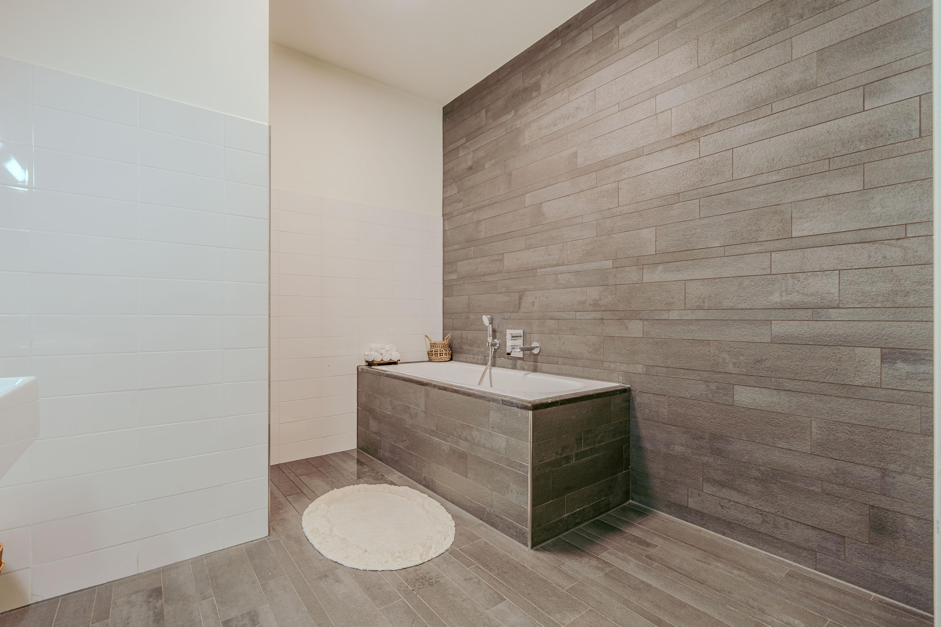 A second hallway connects the living area to the bedrooms at the front and the bathrooms at the rear. Both bedrooms are impressively spacious and stretch along the length of the apartment, creating a calm and airy atmosphere. The primary bedroom also includes a sunroom, adding to the luxurious feel and openness. To the rear, there are two large, modern bathrooms — each equipped with double vanities, a bathtub, and a walk-in shower.