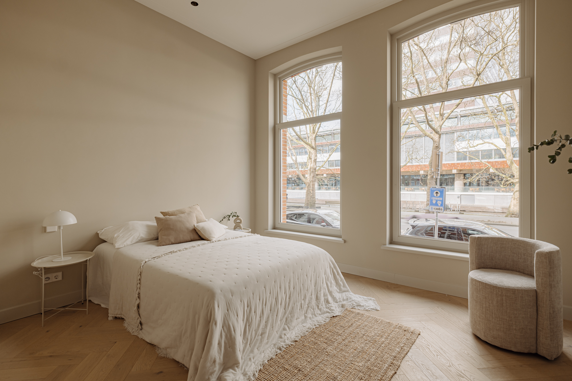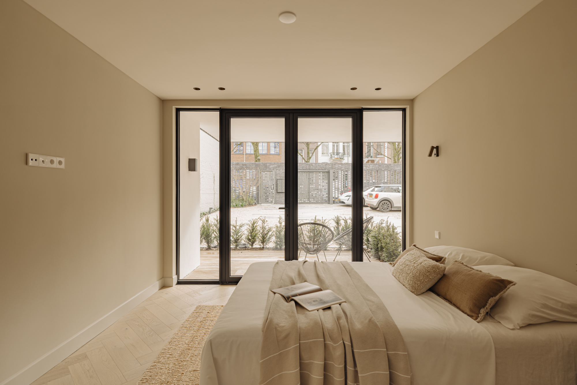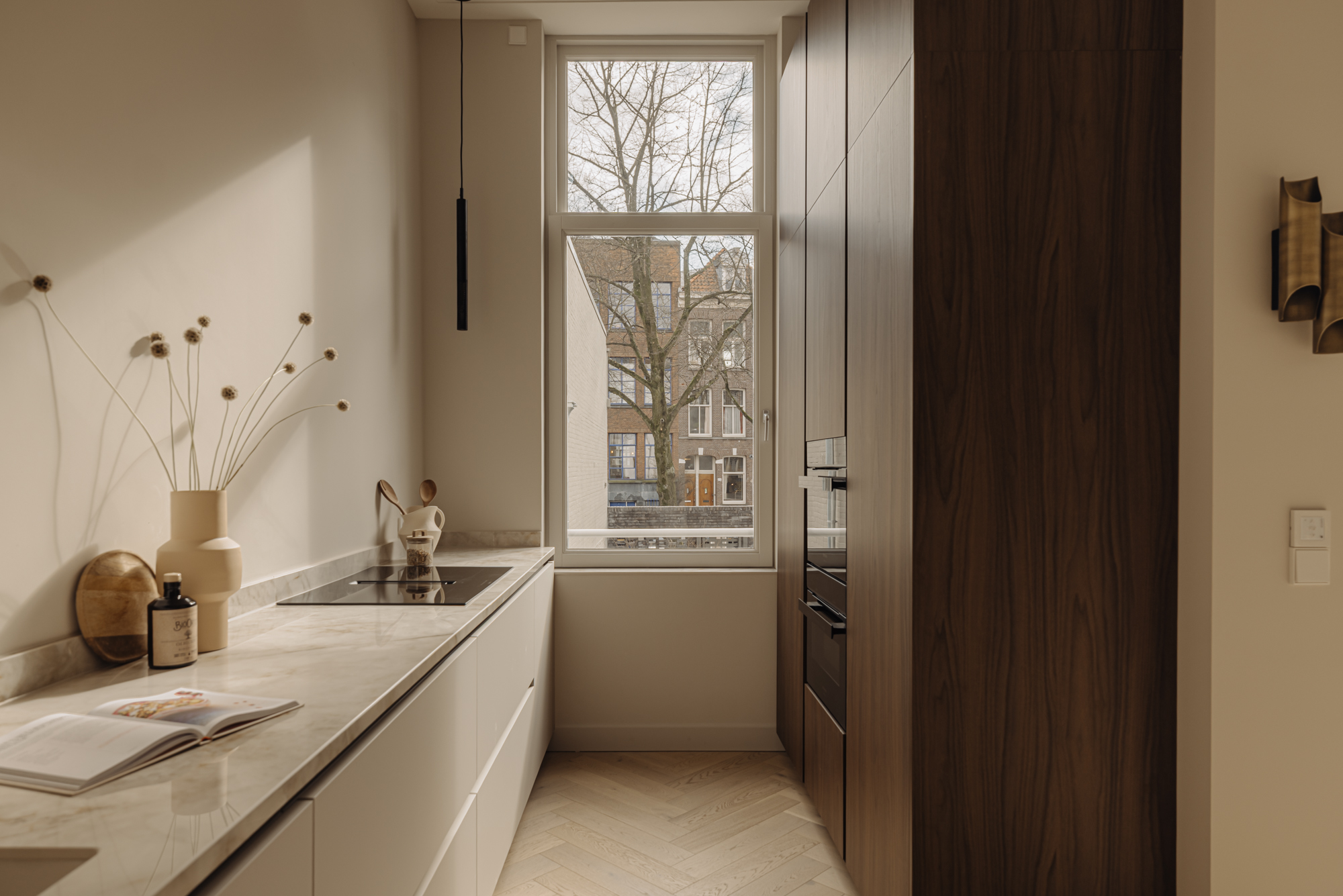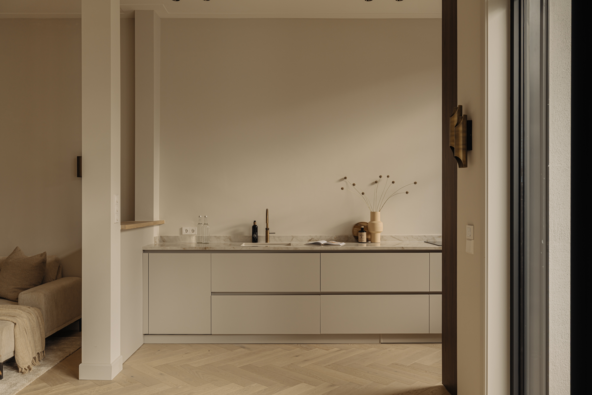 A luxury, 182-m² double ground-floor apartment with four bedrooms, two bathrooms, a balcony, terrace, internal storage space and a front and back entrance. The apartment features carefully selected, high-end materials that create a sense of warmth and comfort. Luxury herringbone floors, high ceilings, subtle tones in the kitchen and bathrooms and a well-thought-out lighting plan create a harmonious and inviting ambiance. The kitchen, with its clean lines and ample storage space, is a perfect combination of style and practical functionality. The building itself is a freehold property.
