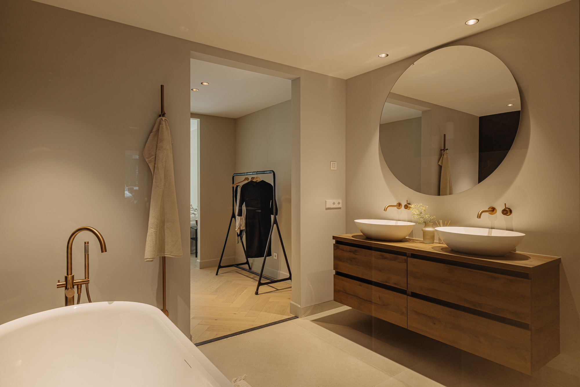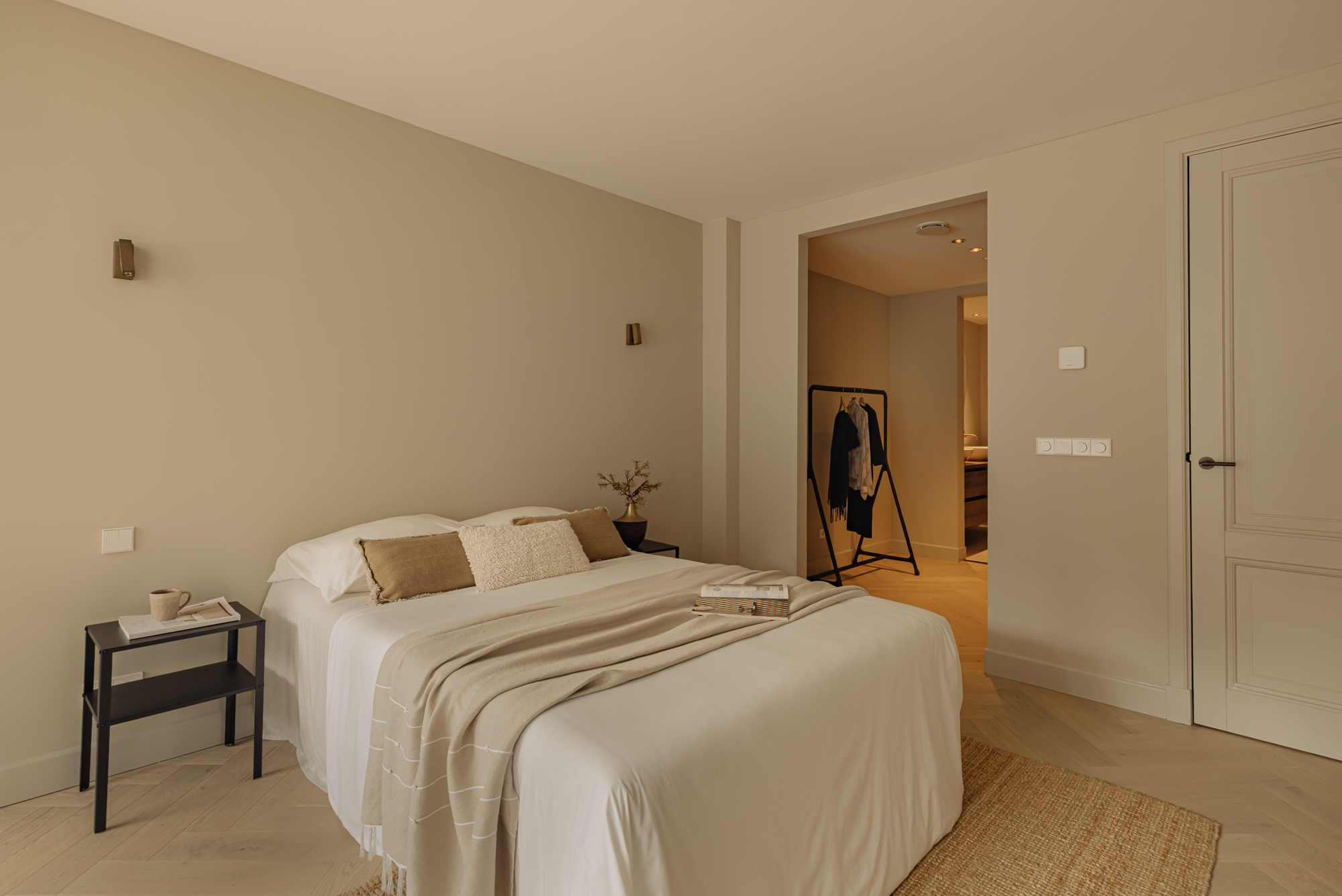 The apartment’s front door opens into a hall that is centrally located and gives access to all the rooms on this floor, including a separate toilet room and a storage room. There is a large, bright living room and an open-plan kitchen of Italian design at the front of this floor. The luxury kitchen is equipped with a comprehensive range of built-in appliances and balances style and functionality perfectly. The sophisticated combination of white units with marble worktops and large units with the warm shade of walnut give the space a beautiful, atmospheric feel. French doors open out onto the south-facing, recessed balcony. The first large bedroom is at the back of the apartment.