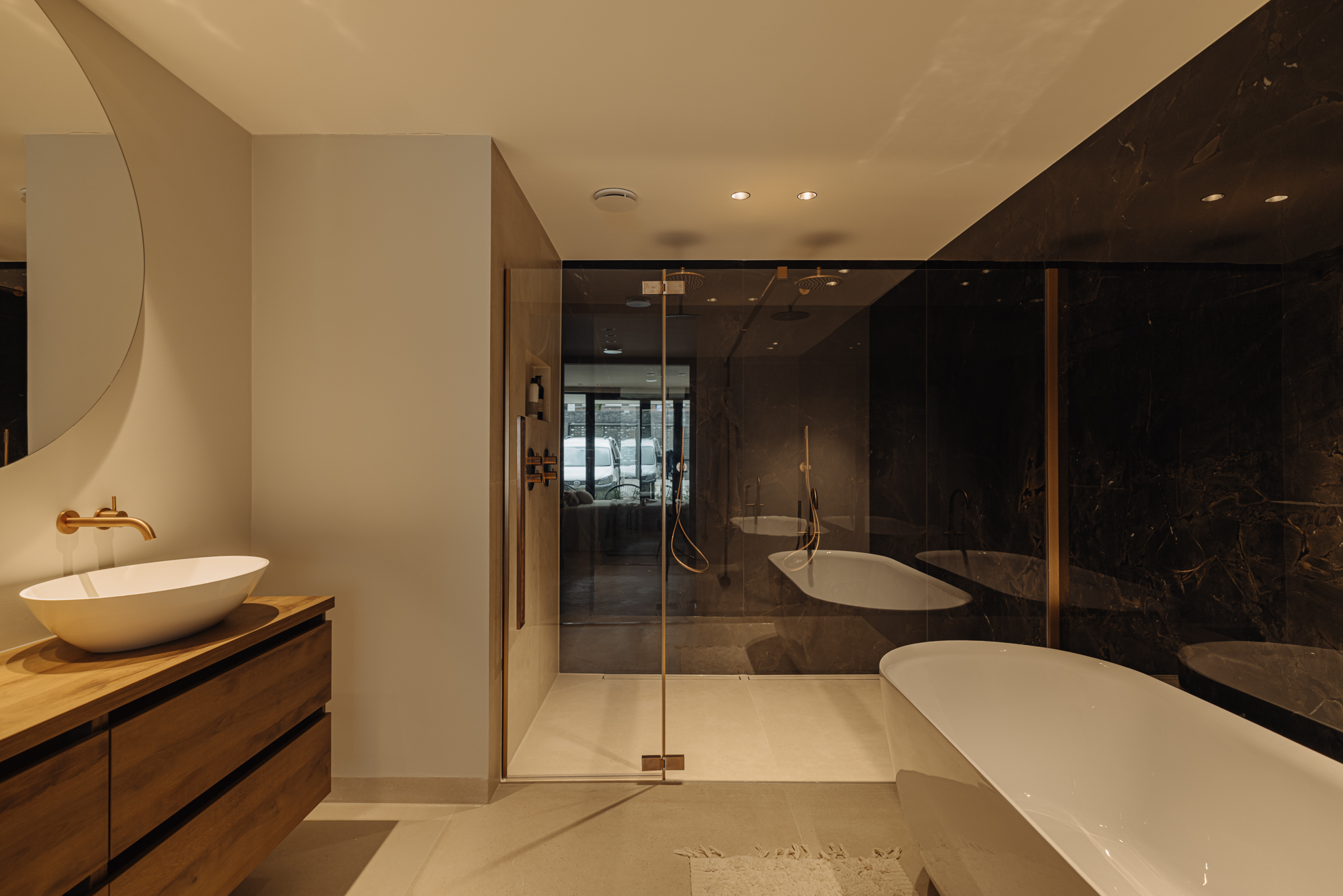 An internal staircase leads to the ground floor, where a spacious landing with a built-in wardrobe leads though to all the rooms on this floor, including a separate toilet room. At the front of this floor, there are two large bedrooms, both with direct access to the sunny terrace. The master bedroom has a luxury en-suite bathroom with a bath, double washbasin unit and a double walk-in shower. The second, stylish bathroom, which is also at the front of this property, has a large washbasin and a walk-in shower. At the back of this floor, you will find the fourth bedroom and a large storage space of approx. 11 m².