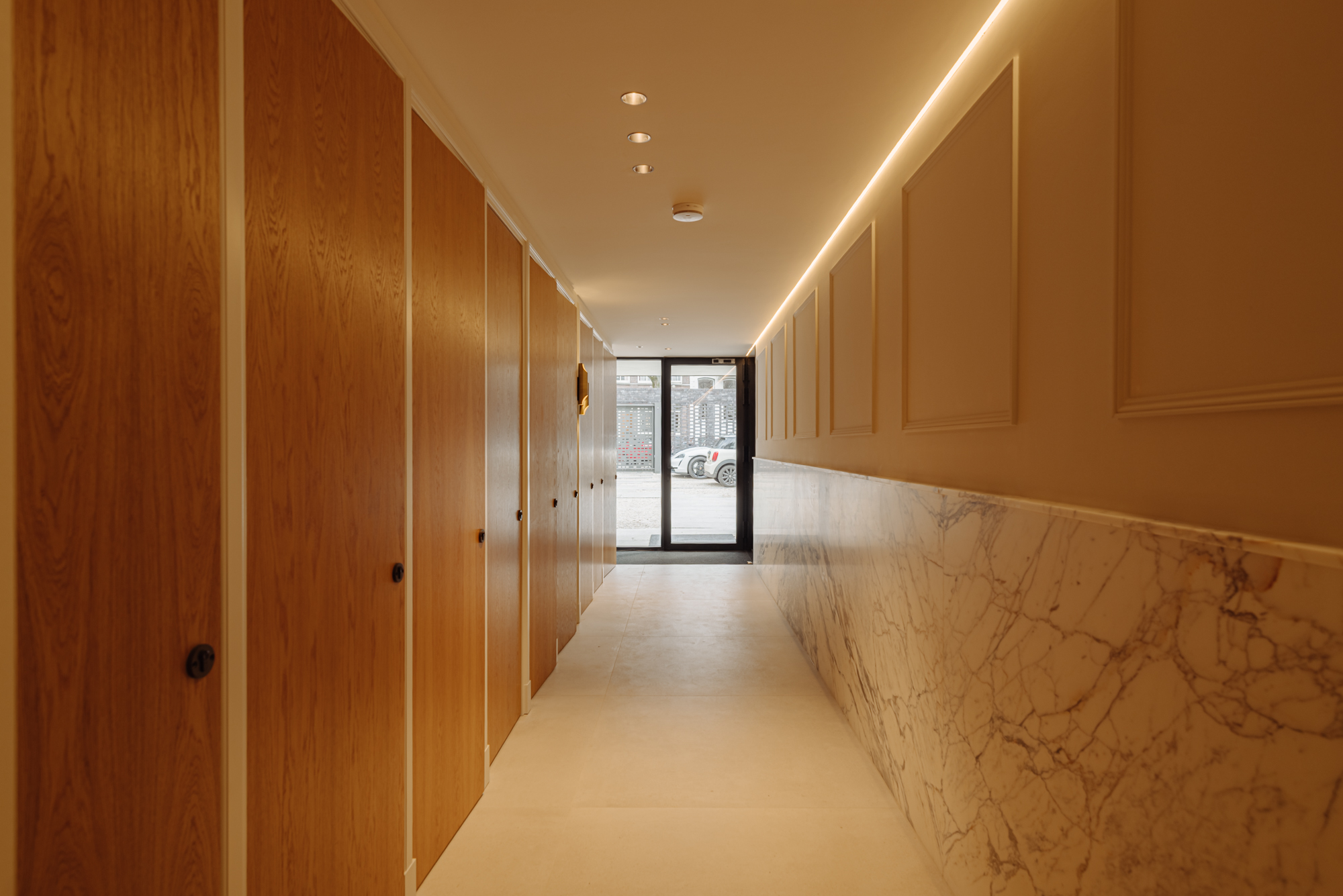 The building’s private parking spaces give access to the stylish, communal entrance with marble wainscoting. Here you will also find access to the meter cupboards for each apartment. The first floor and the entrance to the apartment are reached via the stairs or the elegant marble lift. The apartment can also be accessed from the back of the building.