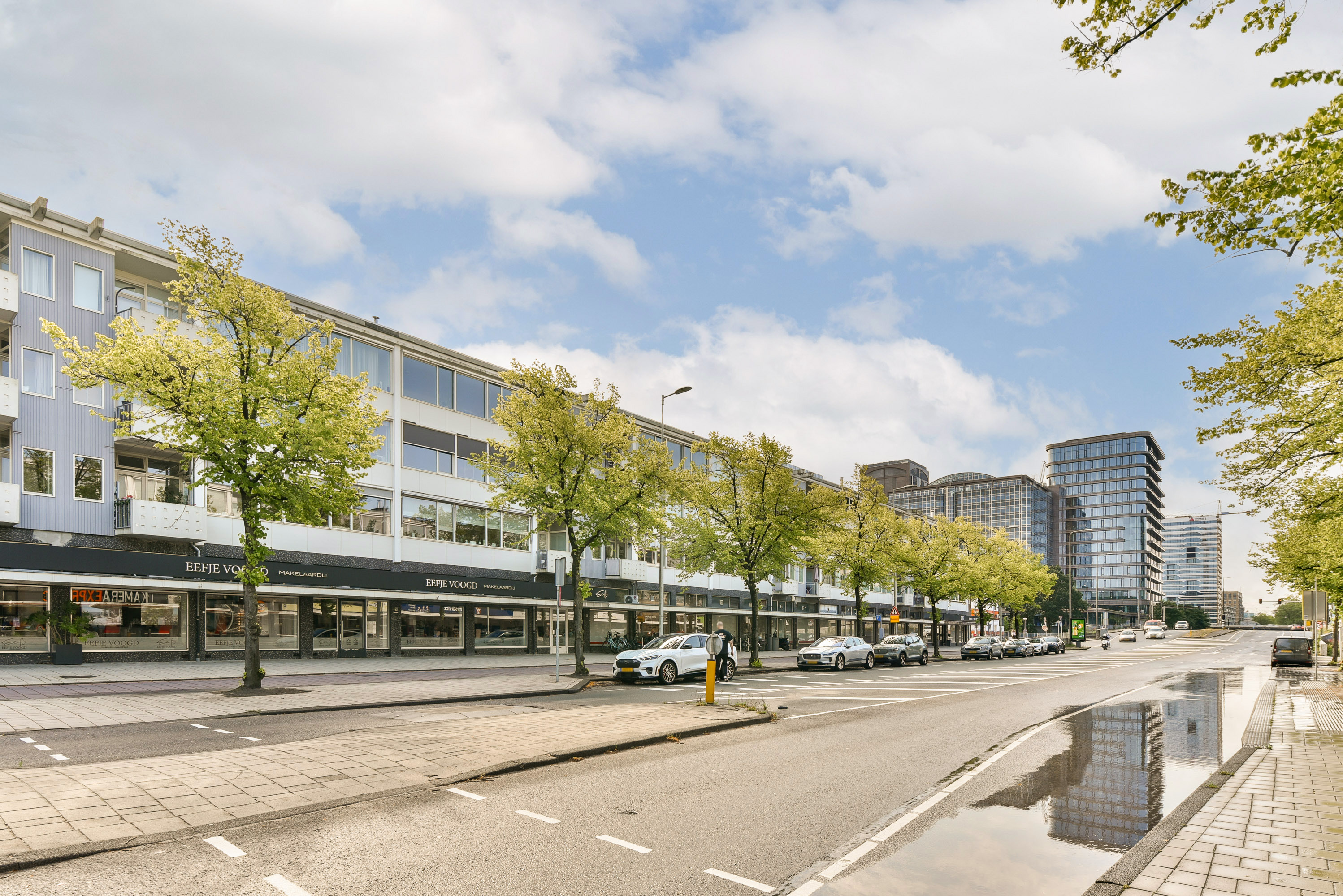 Upon entering, you are welcomed by a spacious hallway with an elegant parquet floor and practical built-in cupboards. The bright living area comprises a generous open-plan kitchen, dining space, and a comfortable lounge featuring a built-in wood-burning stove. The modern kitchen, finished in black Fenix, is equipped with a cooking island including an induction hob, oven, combi-oven, dishwasher, large refrigerator, and Quooker. Thanks to the glass façade and two French doors opening onto the west-facing balcony, the living room is bathed in natural light. The apartment offers three bedrooms. The master bedroom, located at the front of the apartment, features an entire wall of wardrobes, an original built-in cabinet with safe, and direct access to the balcony. The other bedrooms also enjoy access to the balcony. The luxurious bathroom is fitted with a rain shower, bathtub, double washbasin, and a second toilet. Additional built-in storage spaces are available throughout the apartment, including a spacious utility room with connections for a washing machine and dryer. The entire apartment is finished with a herringbone floor and atmospheric lighting by Zuiver. With large windows on both sides, the home enjoys abundant natural light throughout the day. Morning sun streams into the bedrooms, while in the afternoon and evening the kitchen and living area are filled with warm sunlight. This not only creates an exceptionally bright and airy atmosphere but also enhances the overall sense of space and comfort.