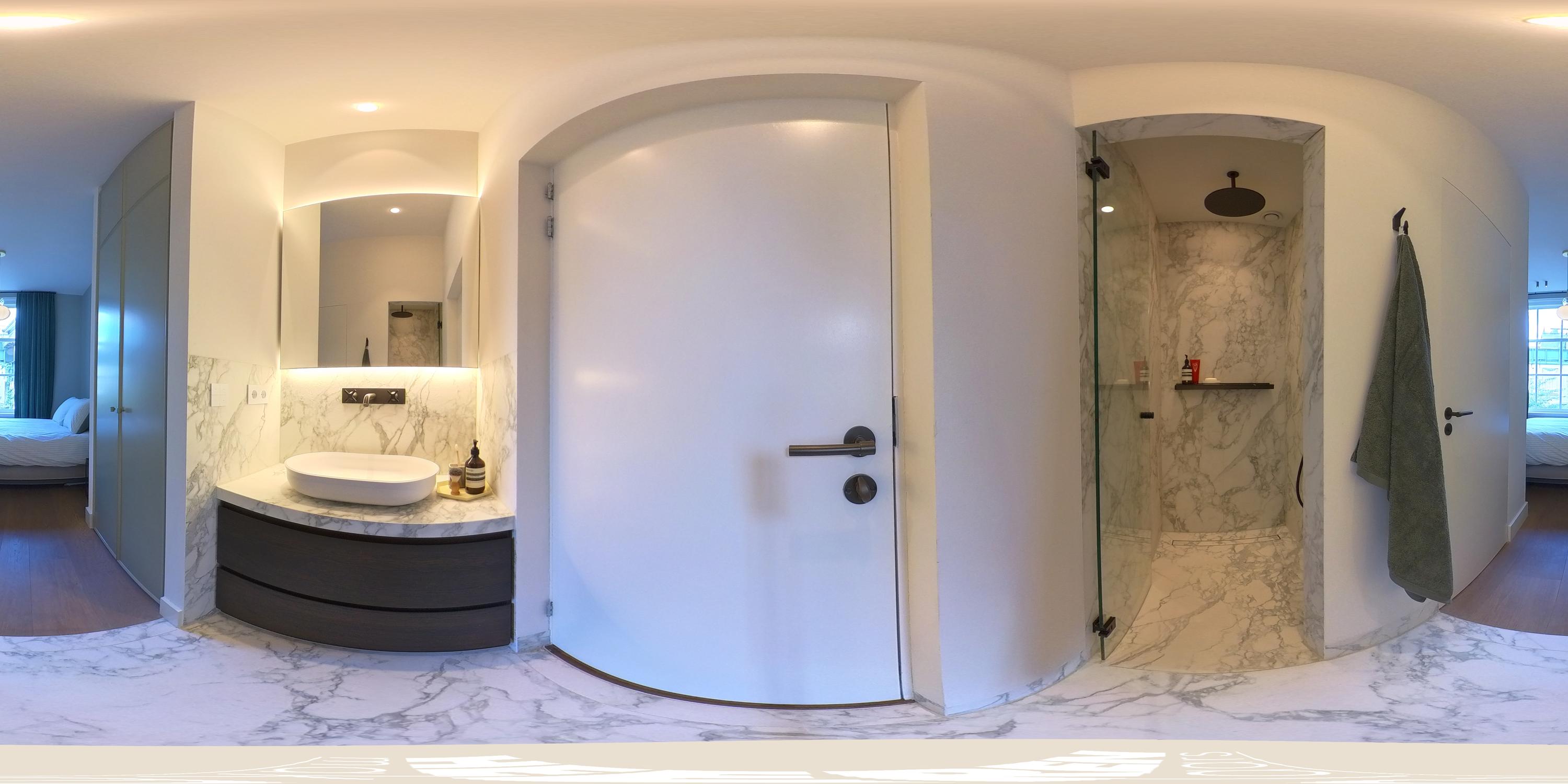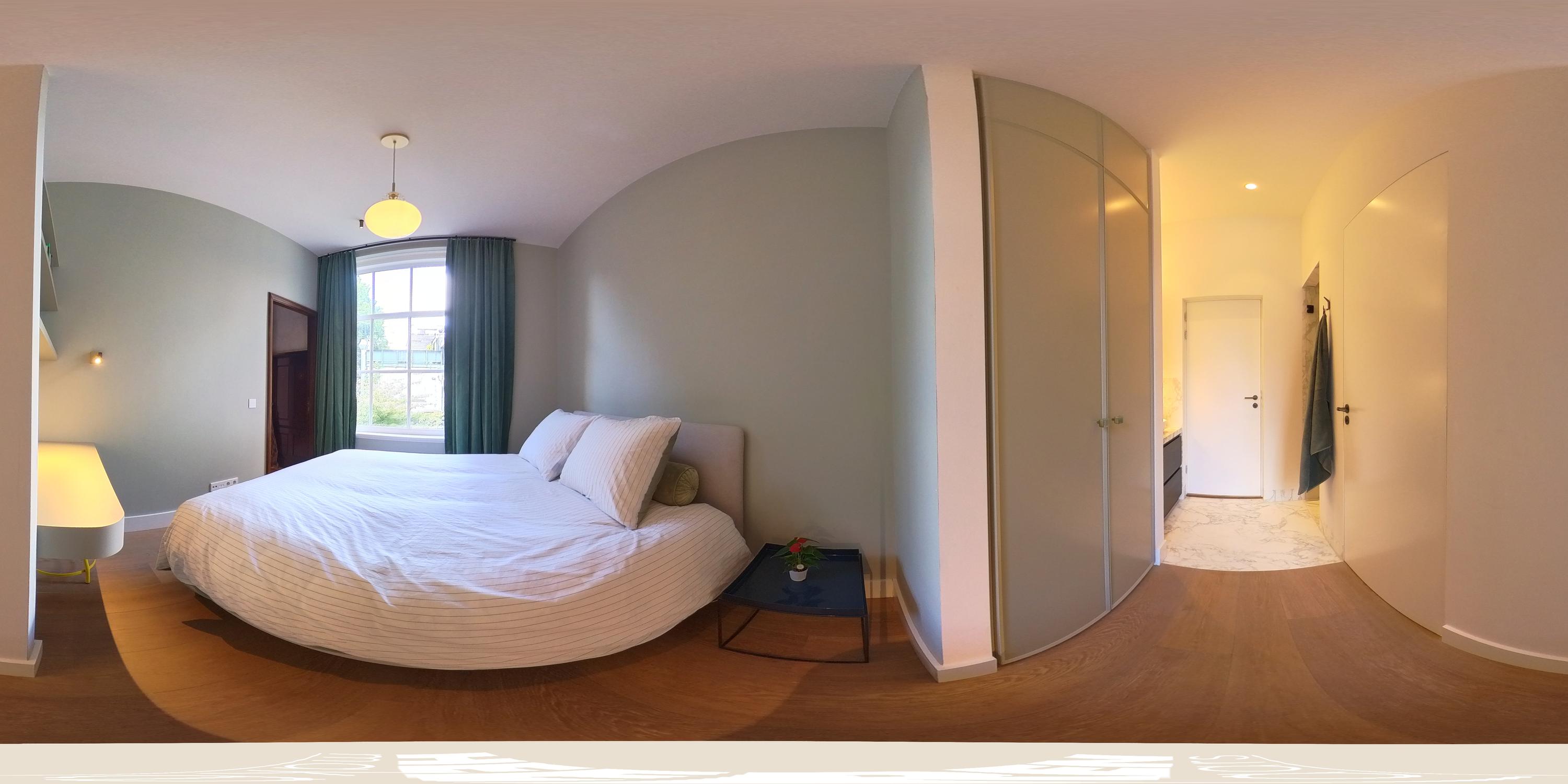 Aan de voorzijde bevindt zich daarnaast nog een ruime slaapkamer en een luxe badkamer voorzien van inloopdouche, wastafel met meubel en een separaat toilet met fontein.