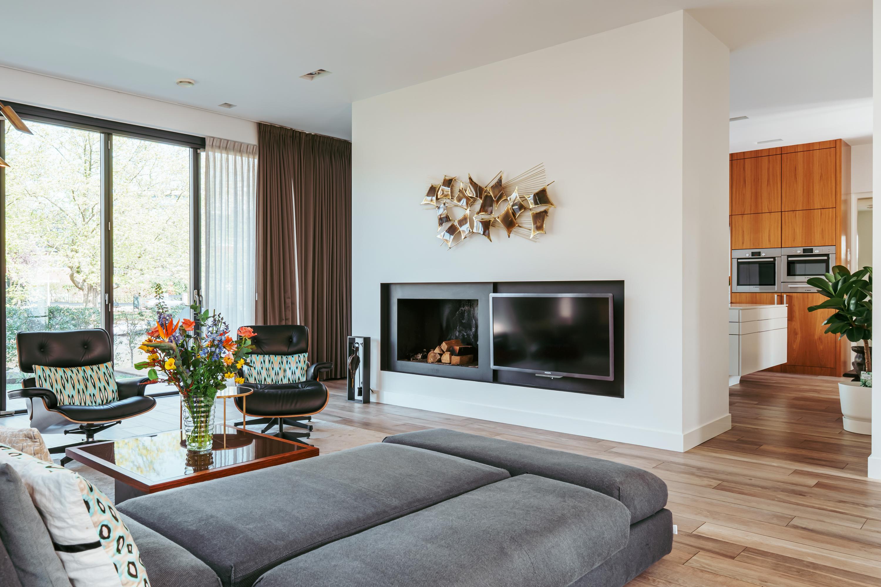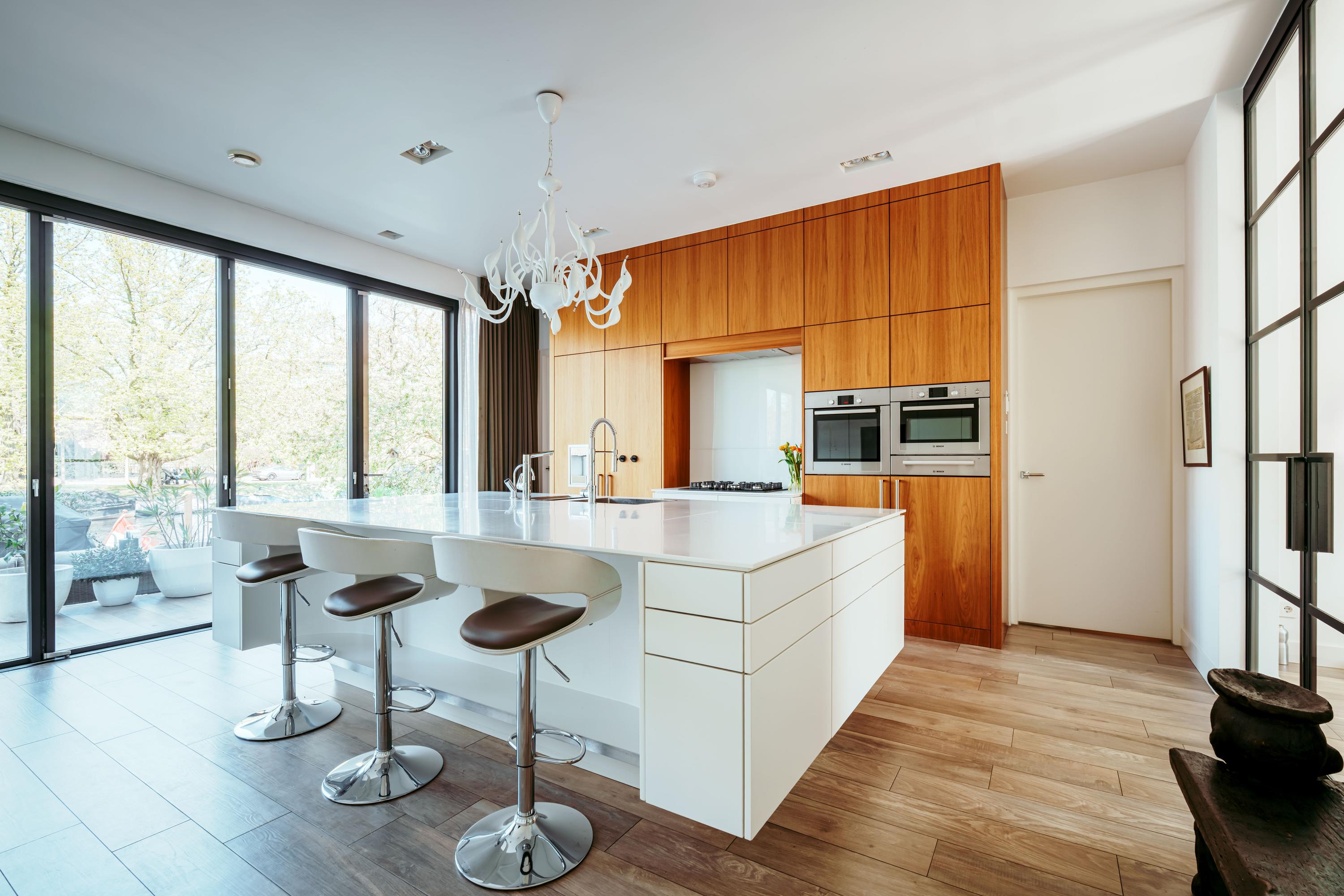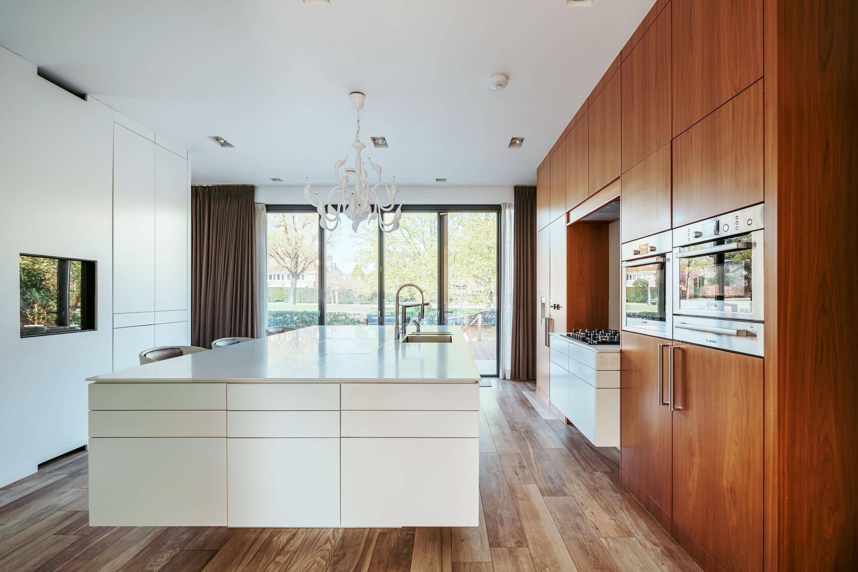 Entrance; through the hall with cloakroom and separate toilet, you reach the living area of the home. Steel doors lead to the spacious dining and living room, featuring a fireplace and French doors opening onto both the front and rear gardens. Large windows allow for ample natural light and create a seamless connection with the outdoors. Adjacent to the living room is the generously sized kitchen-diner. It includes a central island with double sink, double dishwasher, Quooker, and pull-out pantry. On the opposite side is the cooking area, featuring a five-burner gas hob, concealed spice cabinet, a large American fridge with integrated water and ice dispenser, and ample storage space. Two Bosch ovens and a warming drawer are also built in. The kitchen also boasts its own gas fireplace, which is integrated into a double wall shared with the living room fireplace. French doors in the kitchen lead to the rear garden with a private jetty, suitable for mooring a boat.