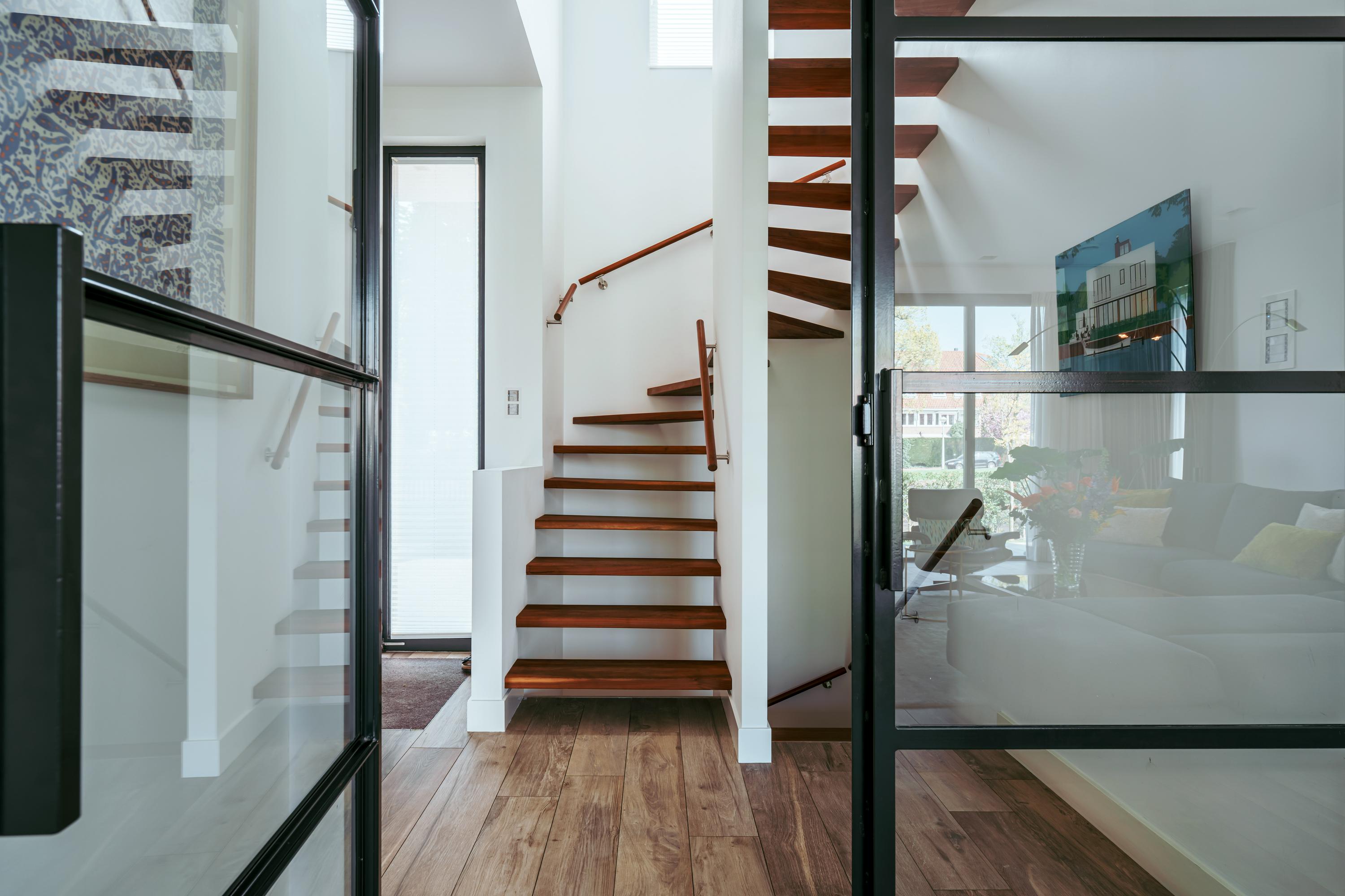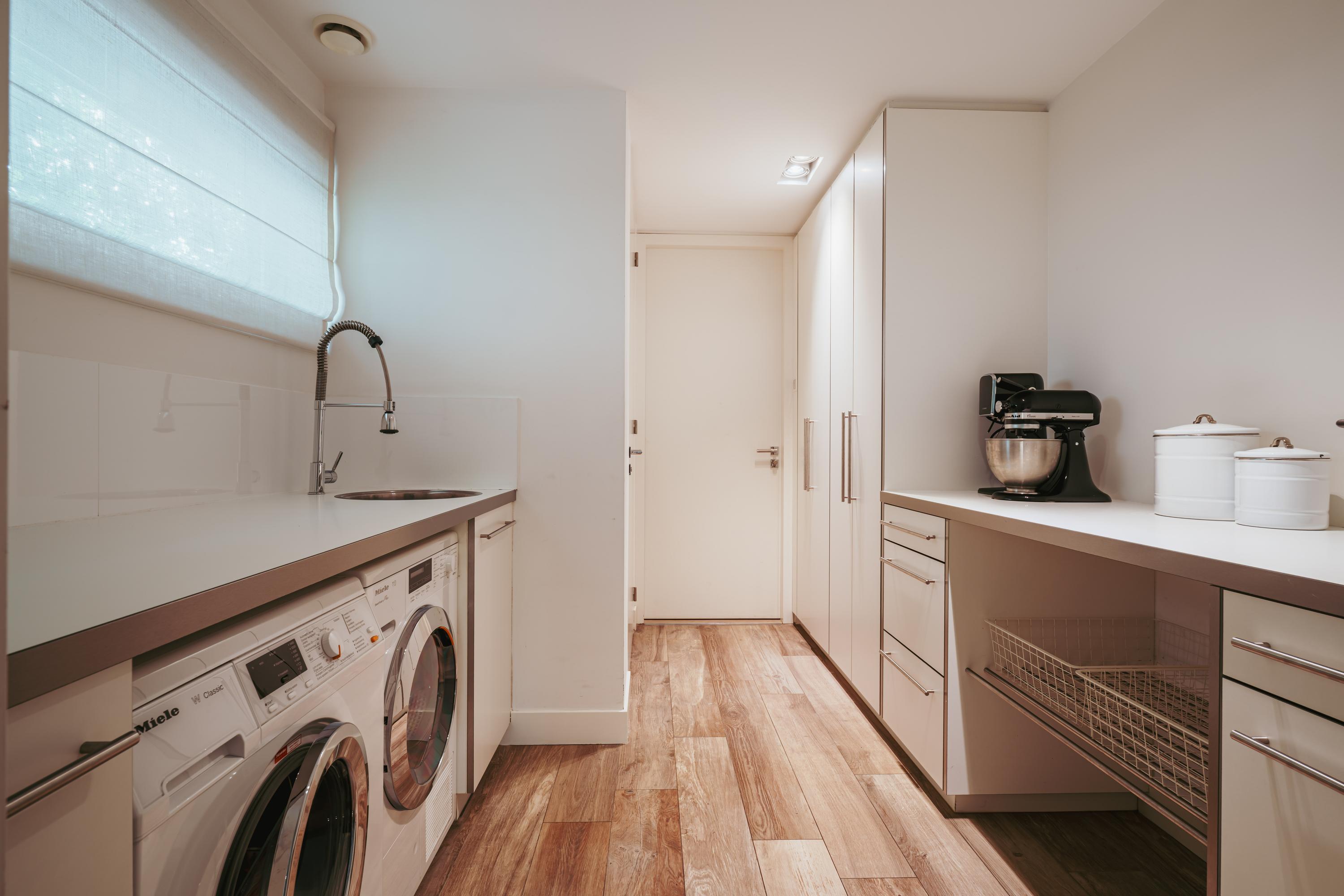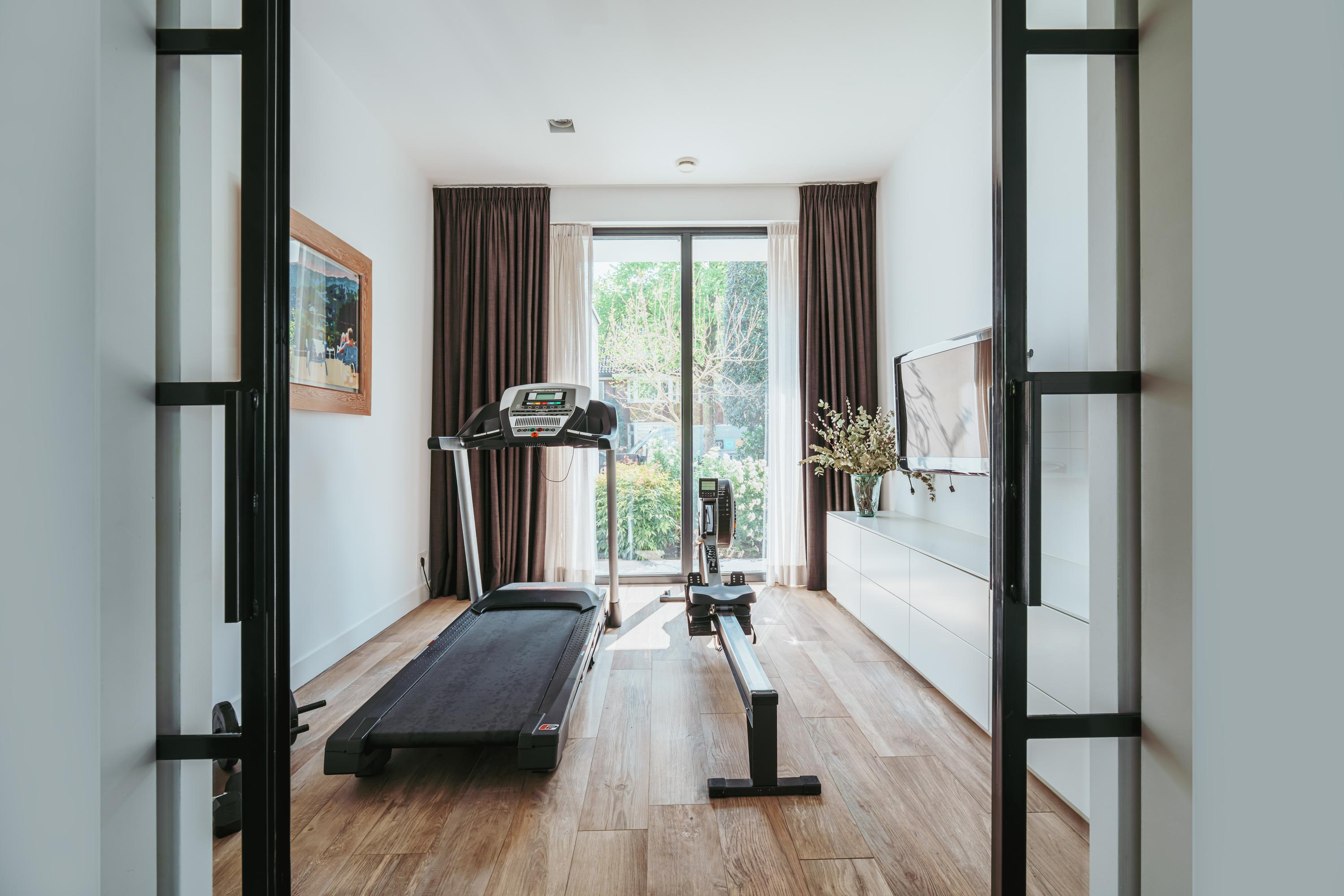 Adjacent to the kitchen is the utility room with extra storage space, leading to a full bathroom with walk-in shower and washbasin. From here, you also have internal access to the spacious garage, suitable for bicycles, storage or as a workspace. At the rear of the house is a study with garden views. On the right side is a multifunctional room, currently used as a gym, which can be closed off with sliding steel doors.