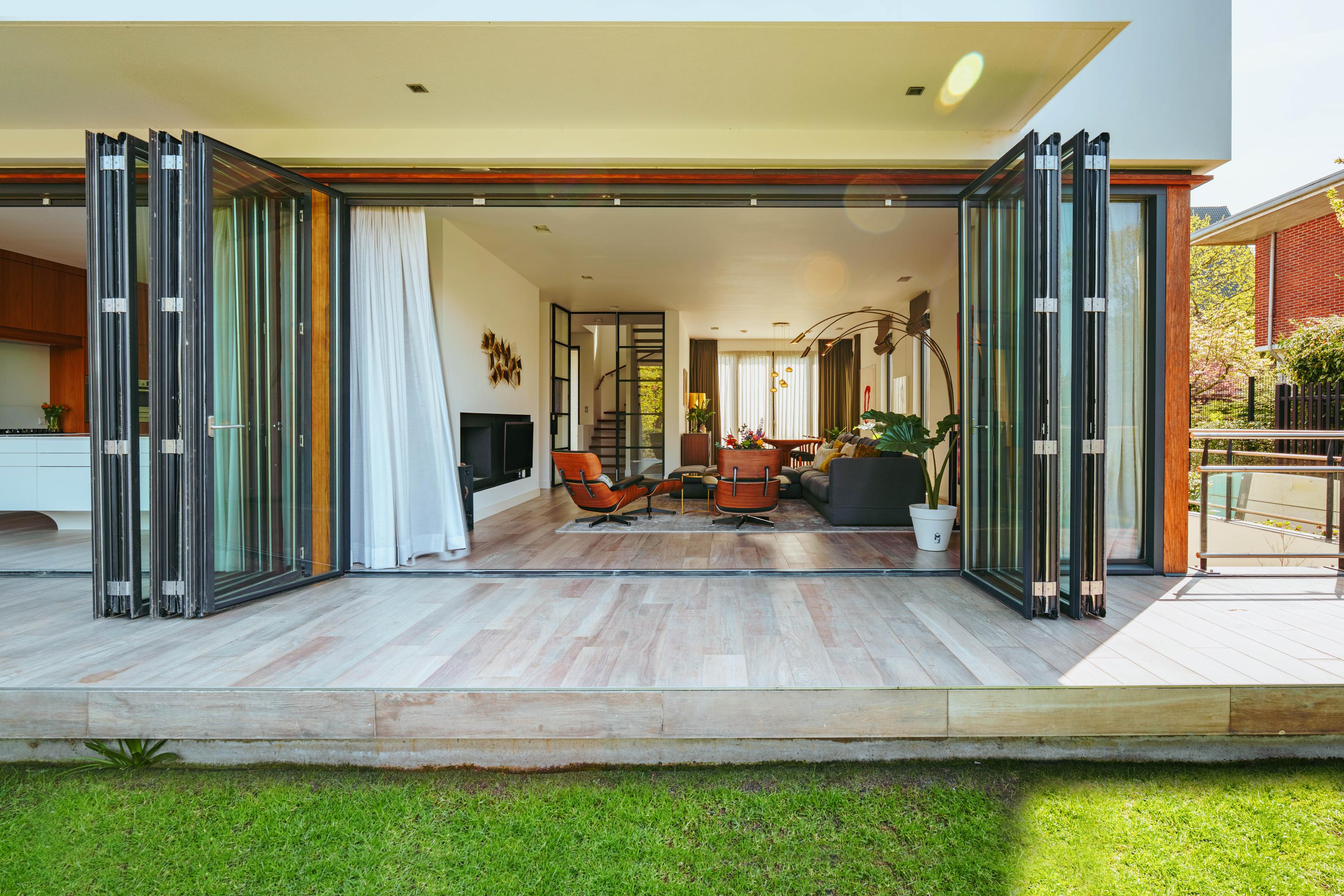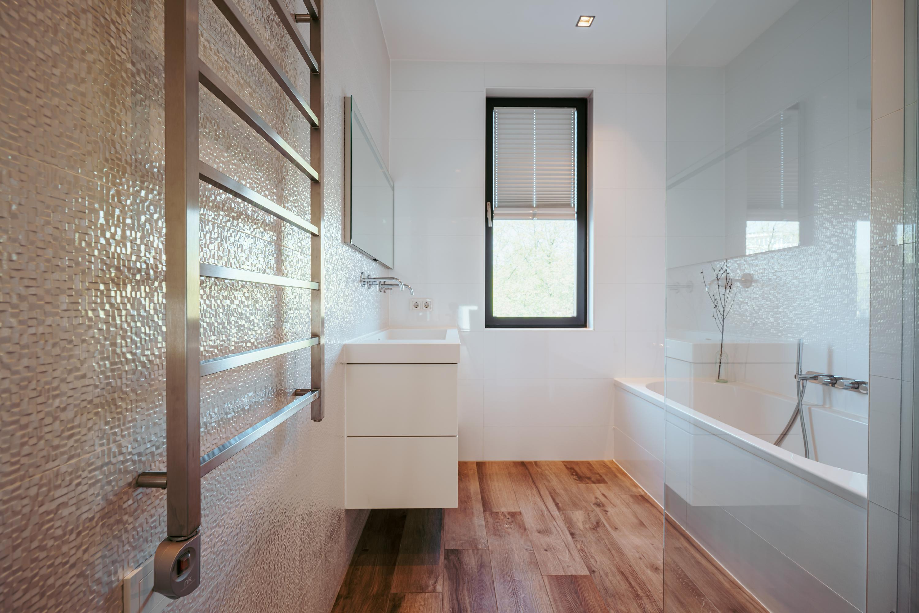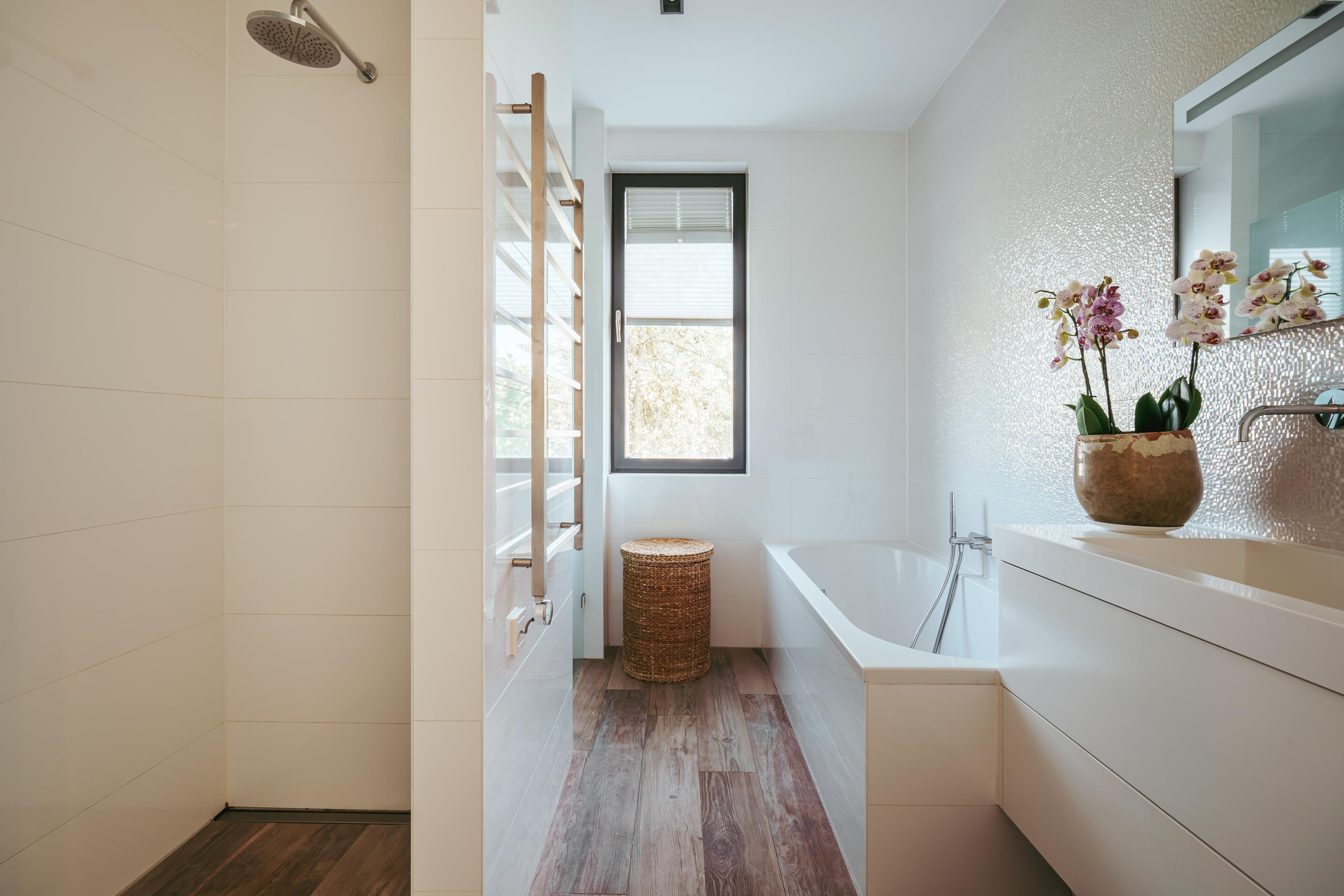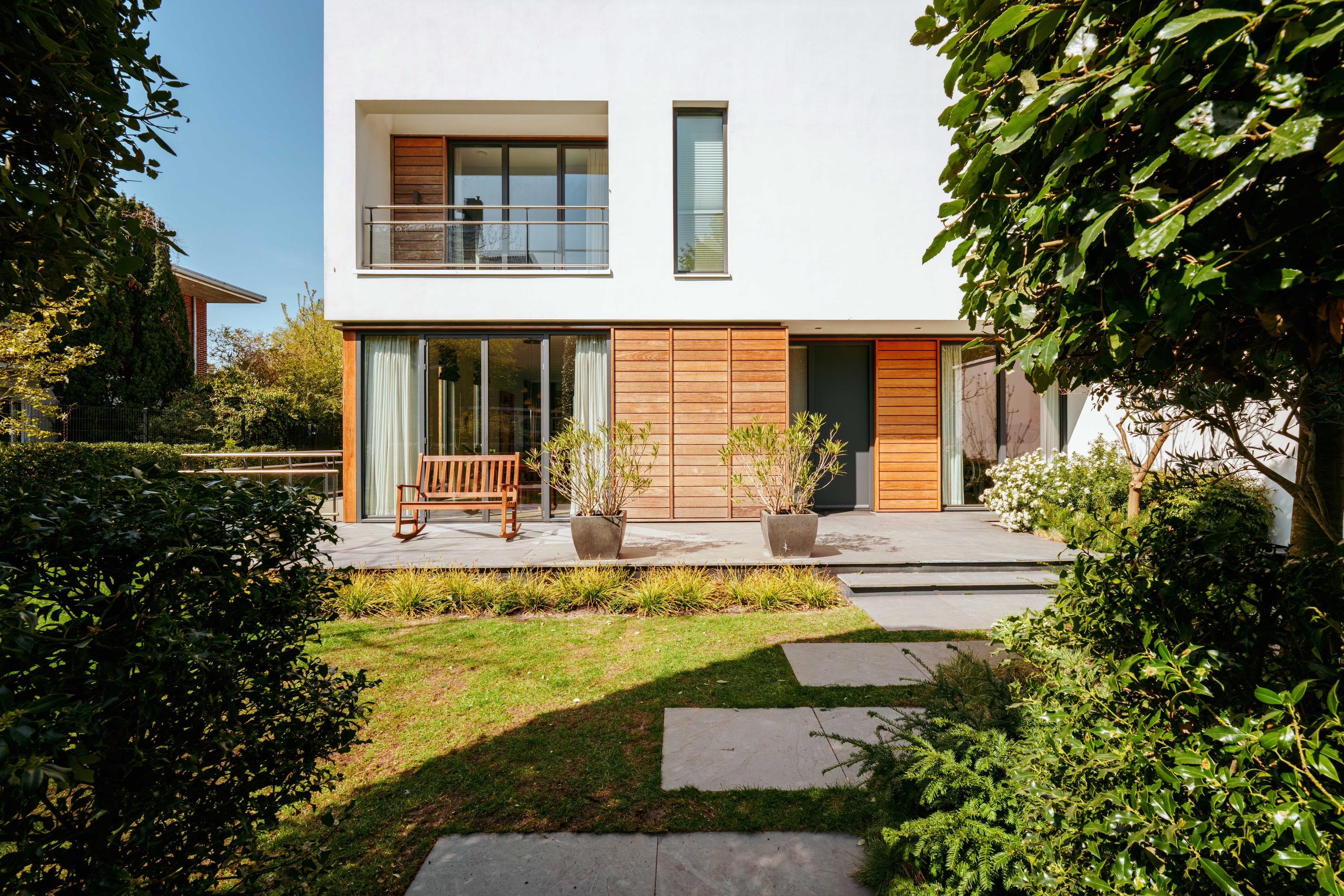 Adjacent to the kitchen is the utility room with extra storage space, leading to a full bathroom with walk-in shower and washbasin. From here, you also have internal access to the spacious garage, suitable for bicycles, storage or as a workspace. At the rear of the house is a study with garden views. On the right side is a multifunctional room, currently used as a gym, which can be closed off with sliding steel doors.