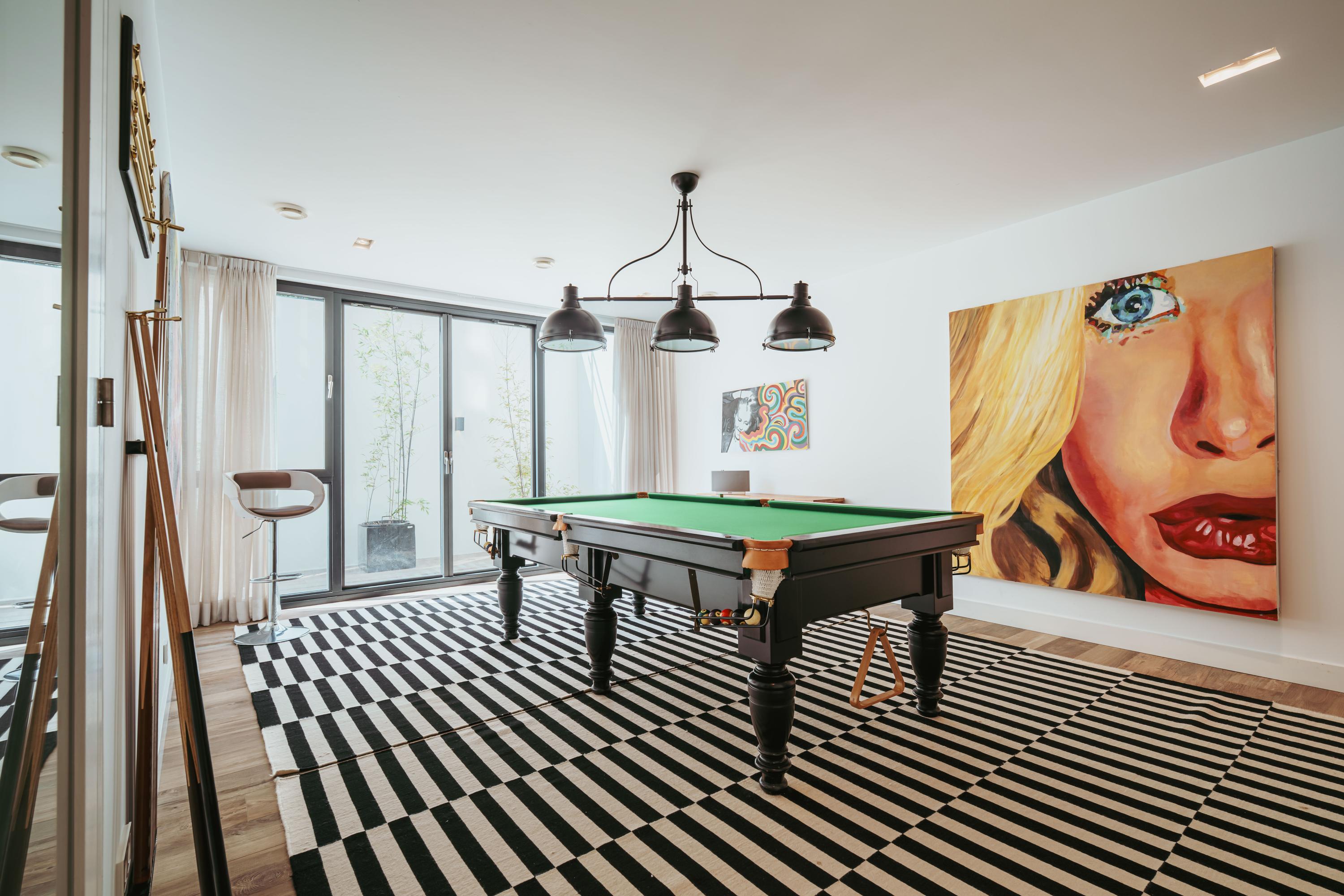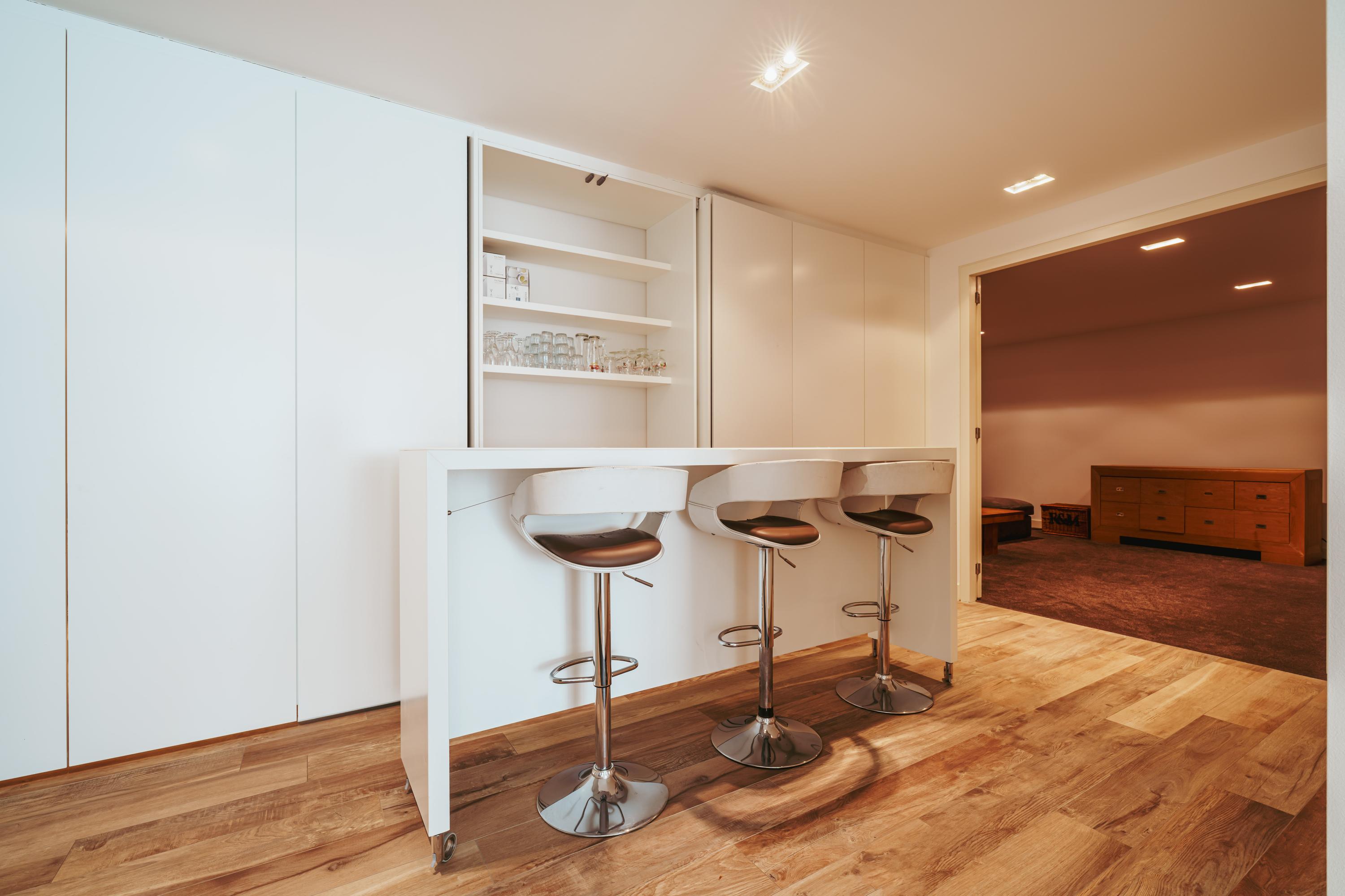 The staircase in the hall leads to the basement level. This floor includes one spacious bedroom with French doors opening onto a patio. Thanks to light wells, there is a surprising amount of daylight. You’ll also find a bathroom with shower and toilet, a large hallway, a generous storage room, and a technical room. Additionally, part of the basement is set up as a home cinema, enclosed by glass doors that block out daylight. Adjacent is a bar area. There is also a large open space, currently fitted with a pool table, which can be freely arranged as a lounge, workspace or hobby area.