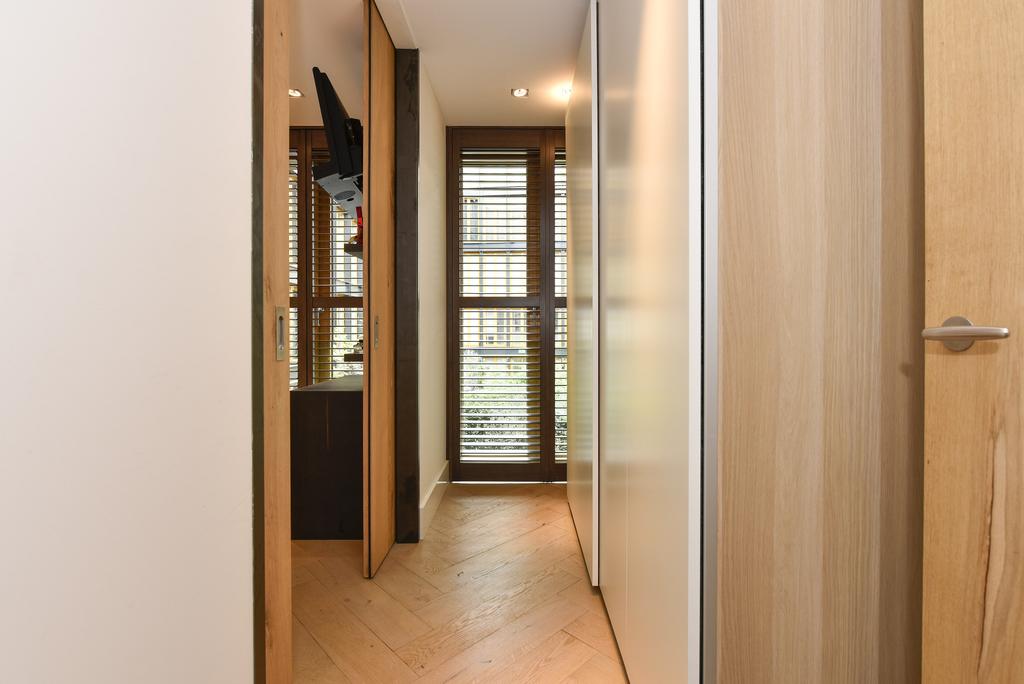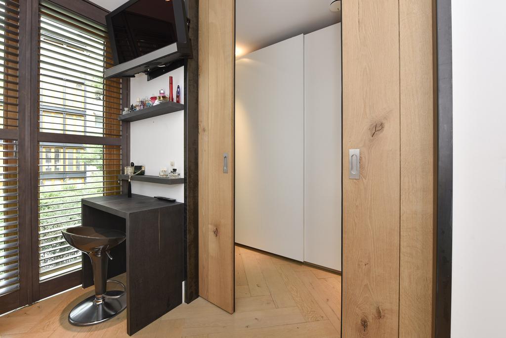 This block was designed and finally completed in 2012, with an eye for detail and quality. The design provided for extra high ceilings and the use of predominantly glass in the façades on the garden side. The apartments are light, airy and spacious. The current owners finished off the apartment’s interior with a great deal of taste and an eye for detail which may be seen in the sturdy materials such as the herringbone pattern floors and the steel surrounds to the internal framing for doors and windows. Lots of details are repeated throughout the apartment. This apartment has a floor area of 135 m² and a garden of 41 m².