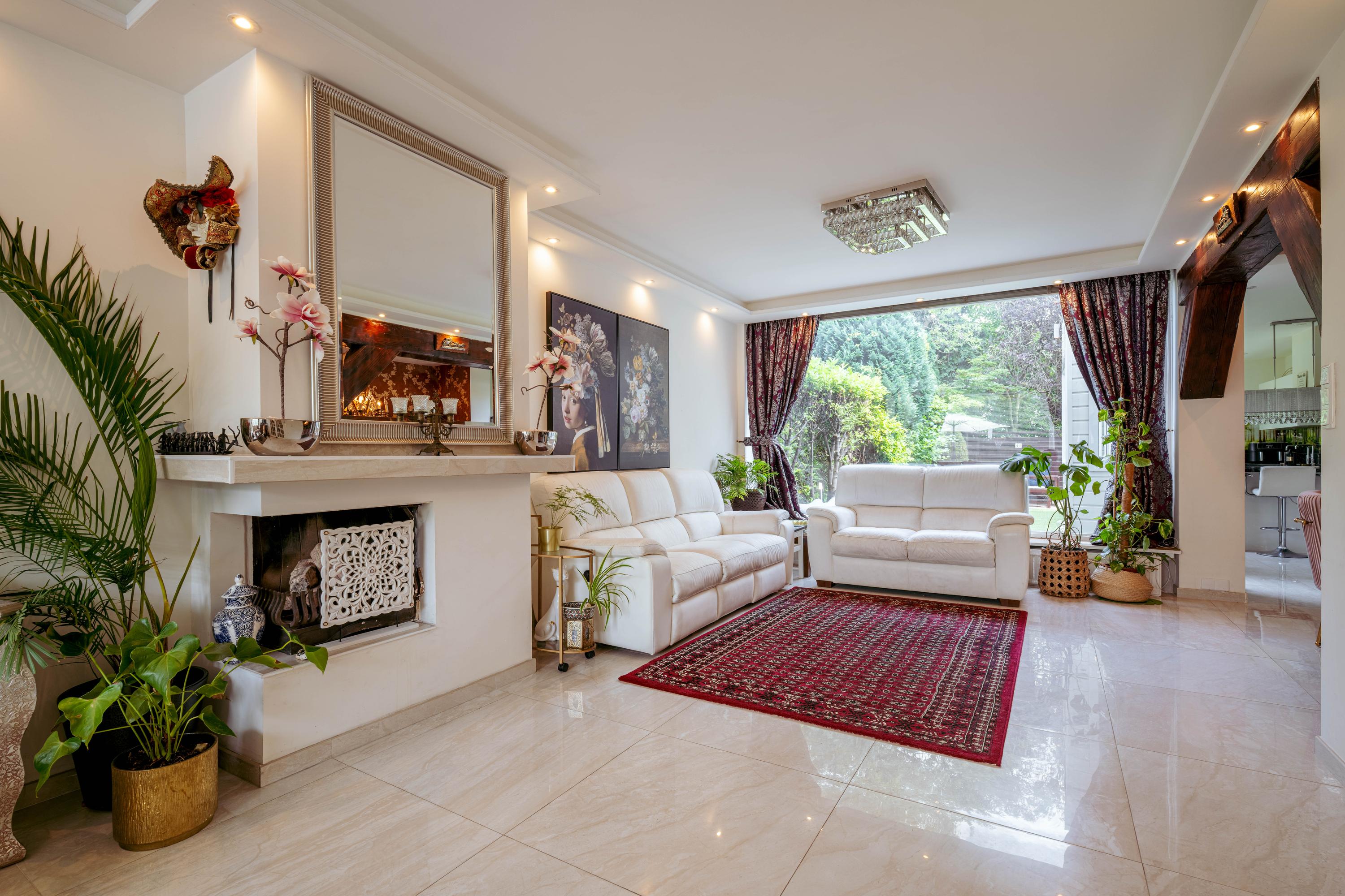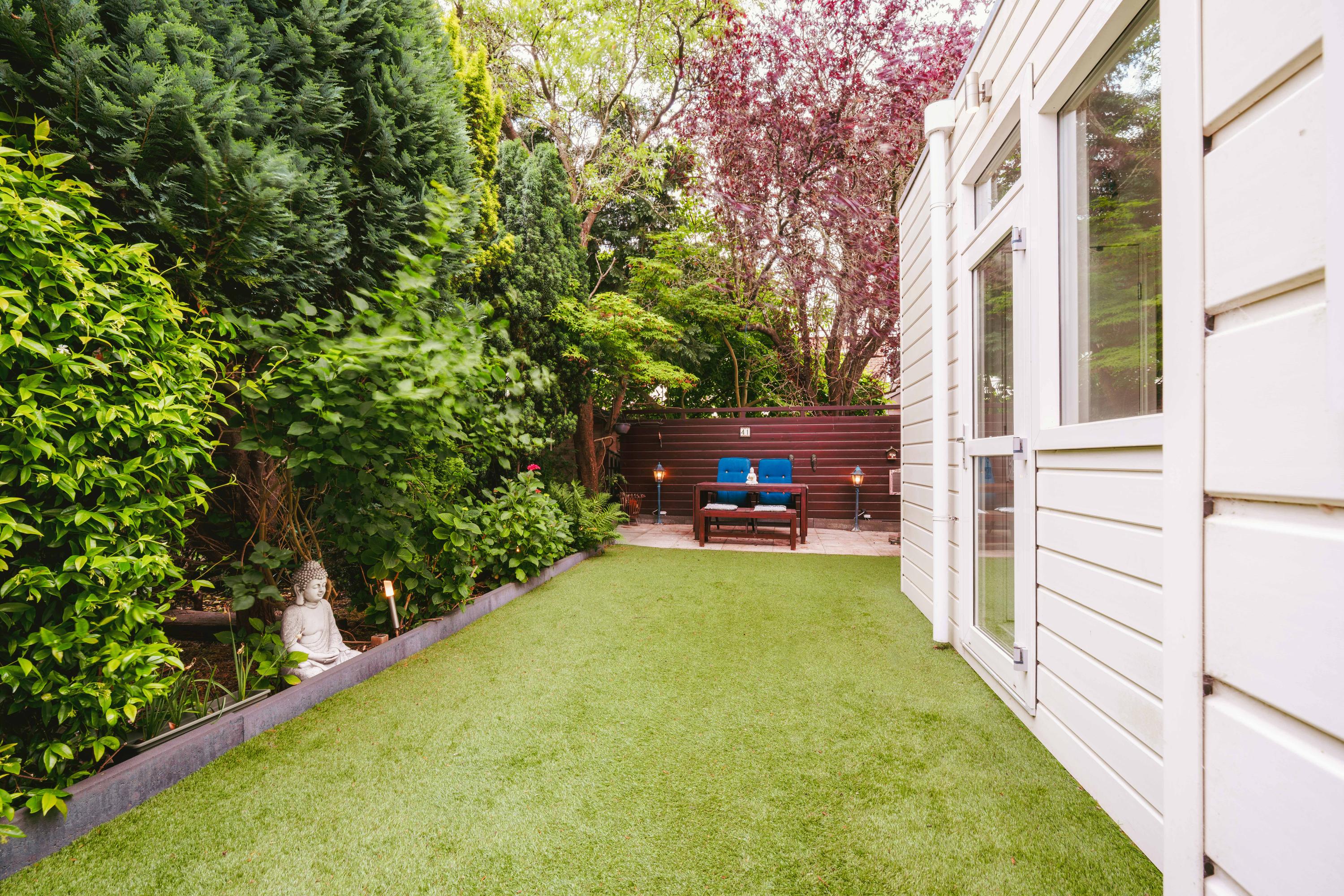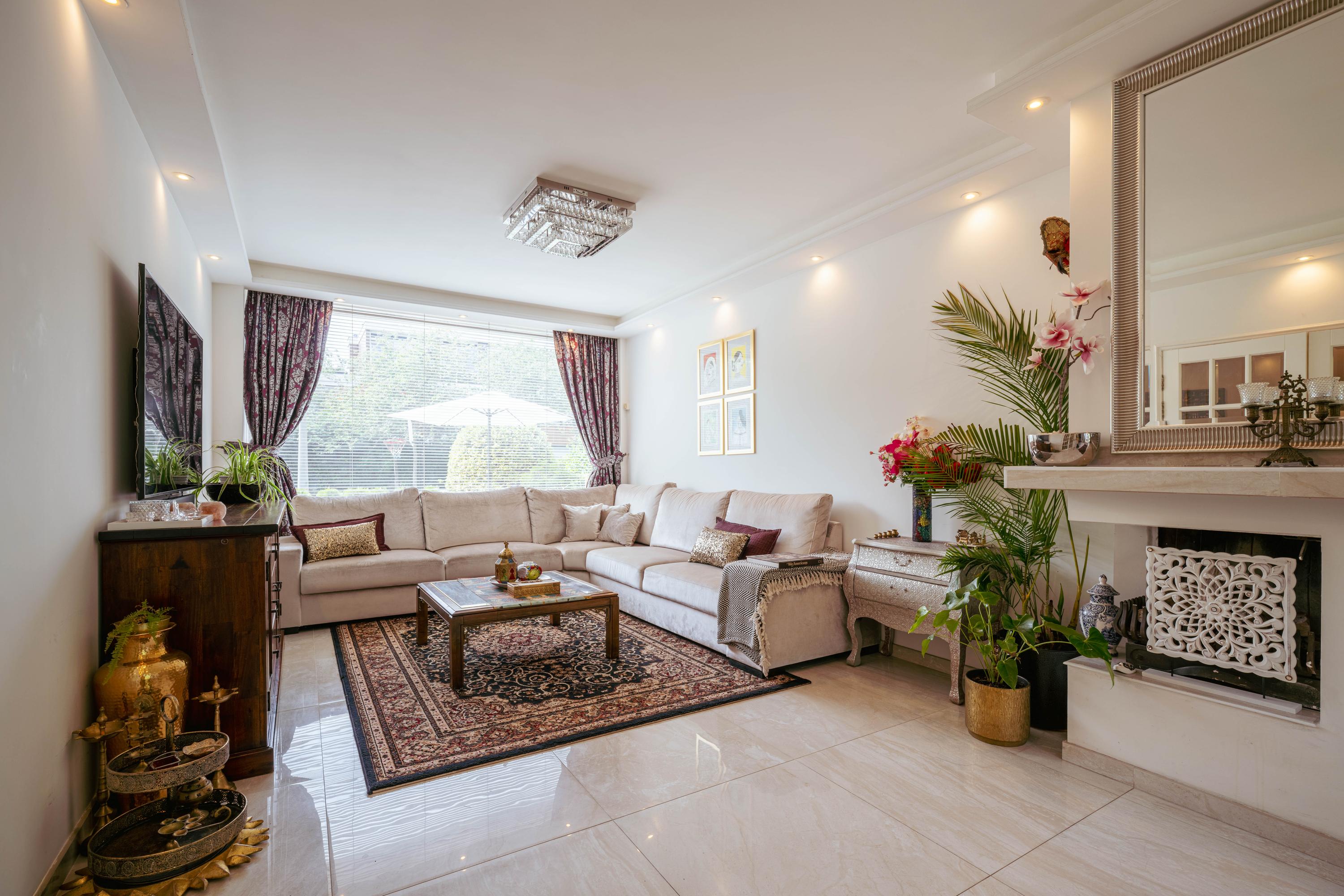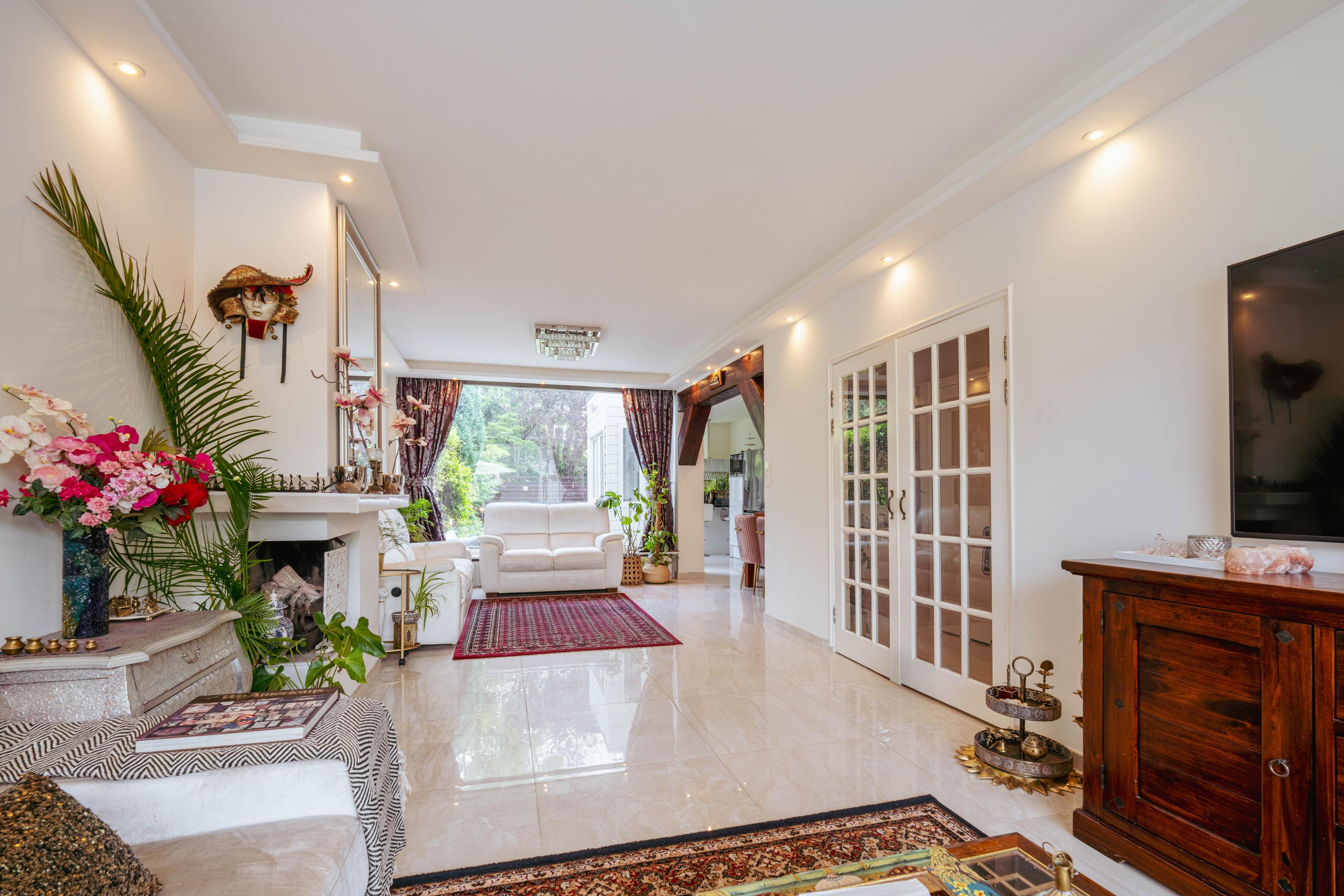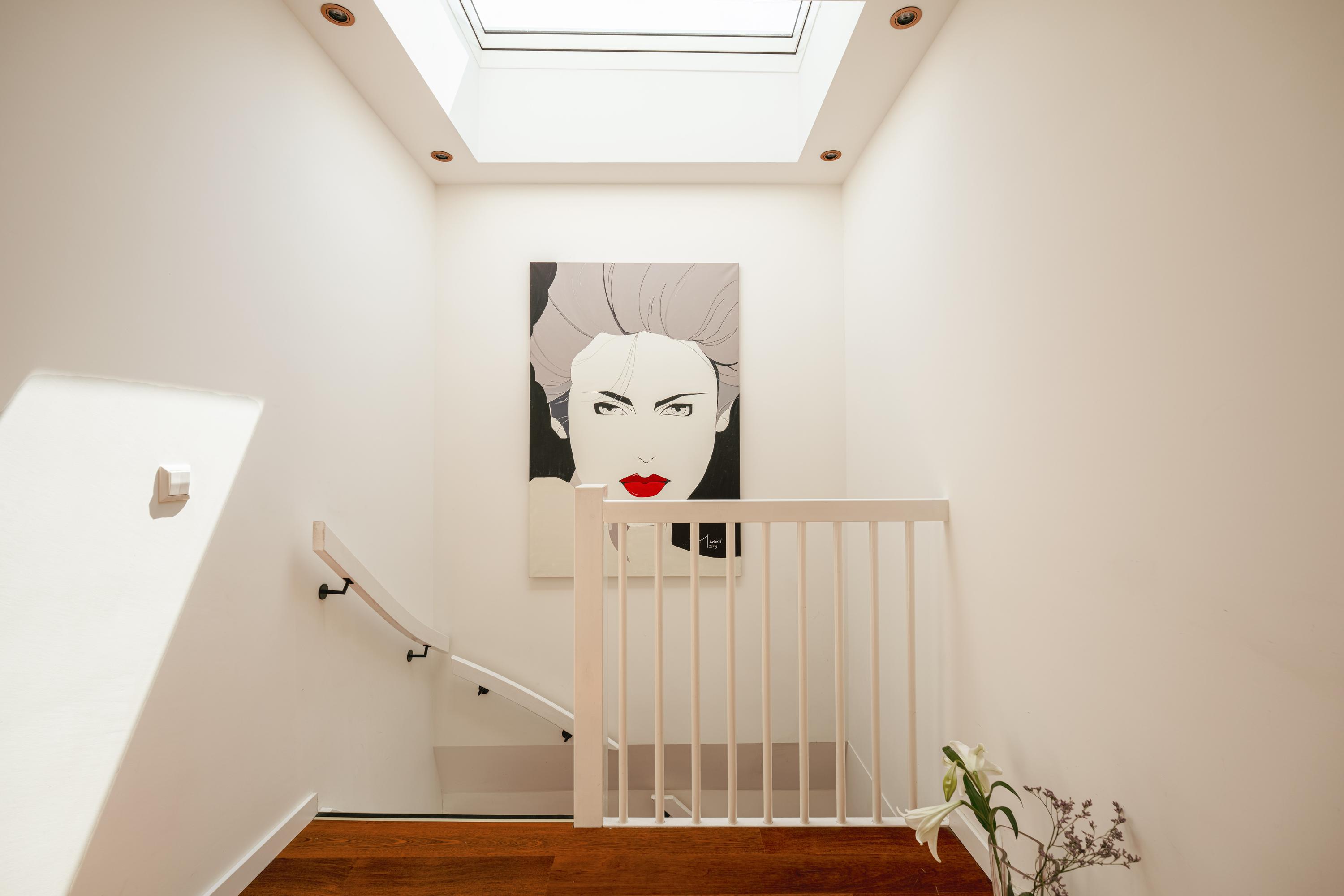 The living room opens to the gardens and is anchored by a gas fireplace, while the semi-open kitchen—fully equipped with modern appliances—extends to a utility space and a sunlit east-facing rear garden of approximately 51m². The ground floor arrangement encourages ease of gathering and daily rhythm. Upstairs, four double bedrooms are arranged around a central bathroom, and the top floor offers two more generous bedrooms and a second bathroom with double rain shower. Both floors provide flexibility for evolving family needs or discreet guest accommodation.
