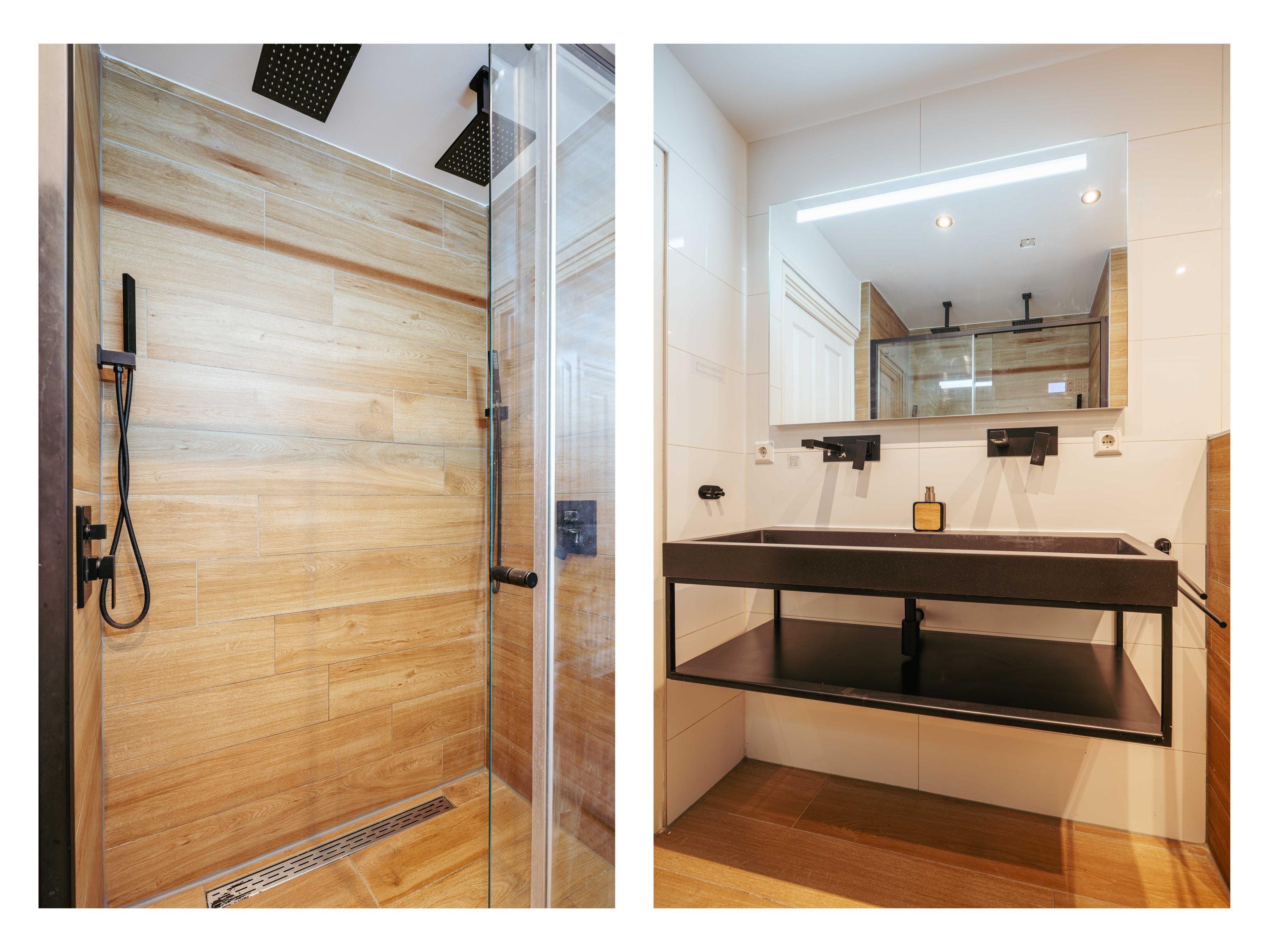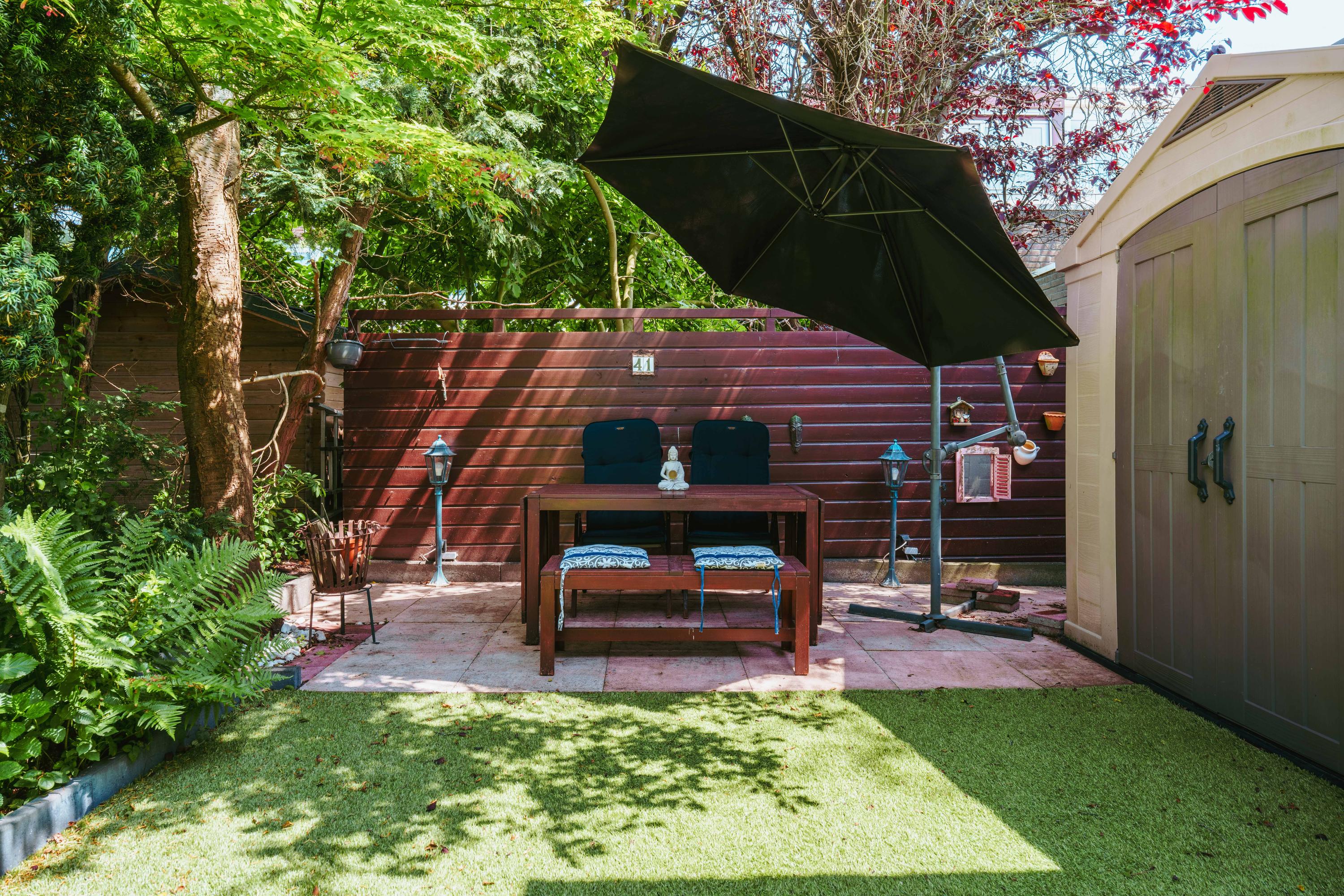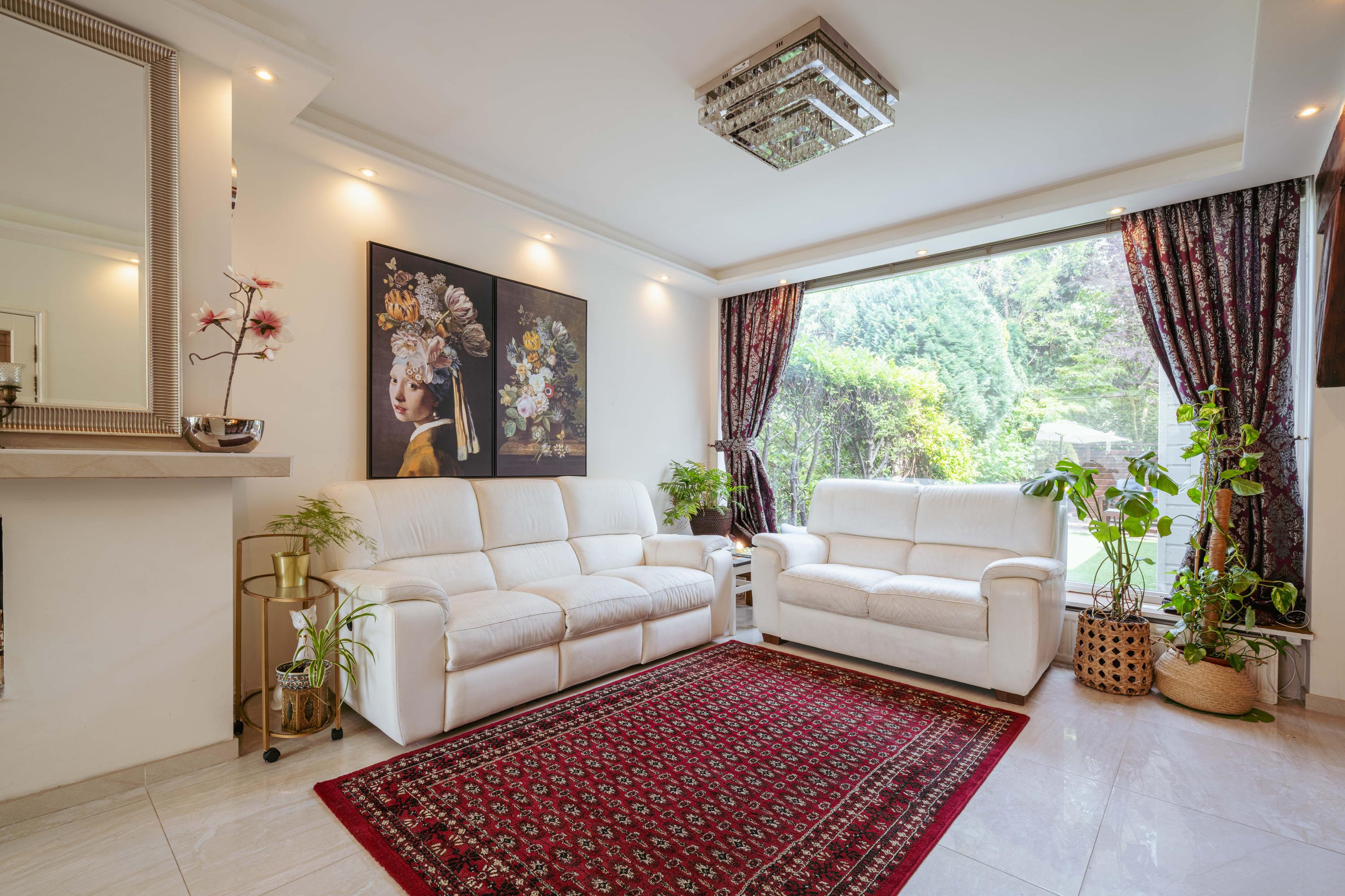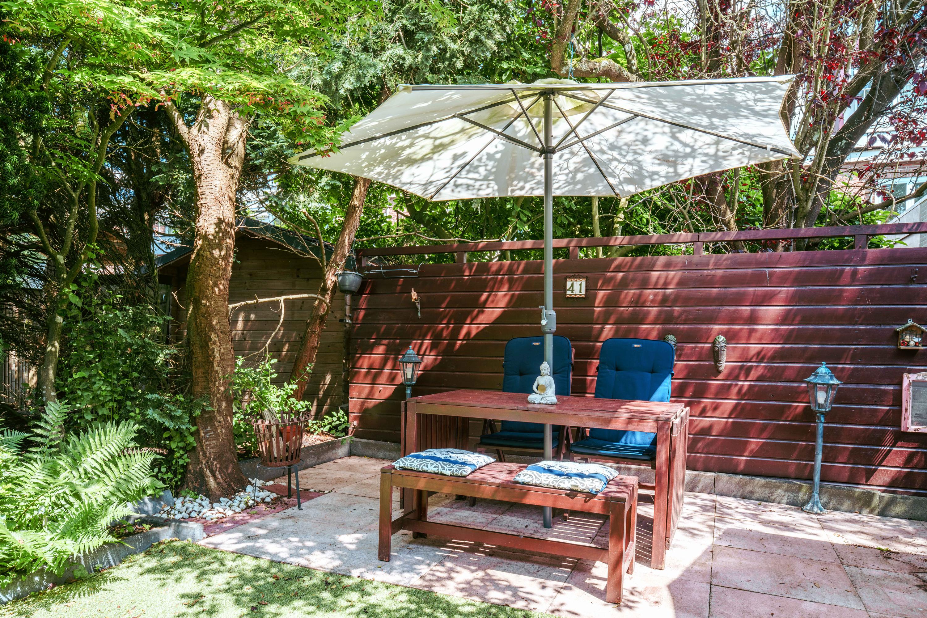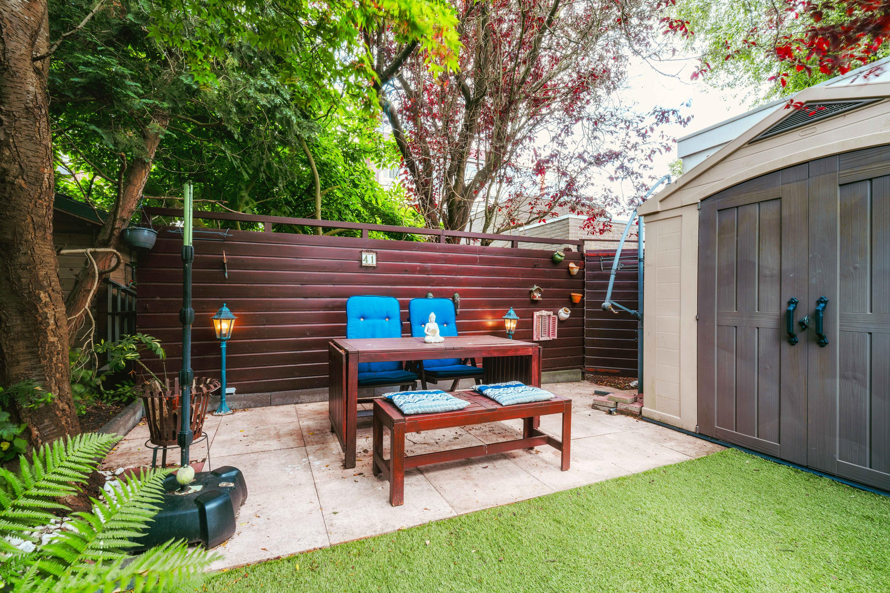 The living room opens to the gardens and is anchored by a gas fireplace, while the semi-open kitchen—fully equipped with modern appliances—extends to a utility space and a sunlit east-facing rear garden of approximately 51m². The ground floor arrangement encourages ease of gathering and daily rhythm. Upstairs, four double bedrooms are arranged around a central bathroom, and the top floor offers two more generous bedrooms and a second bathroom with double rain shower. Both floors provide flexibility for evolving family needs or discreet guest accommodation.