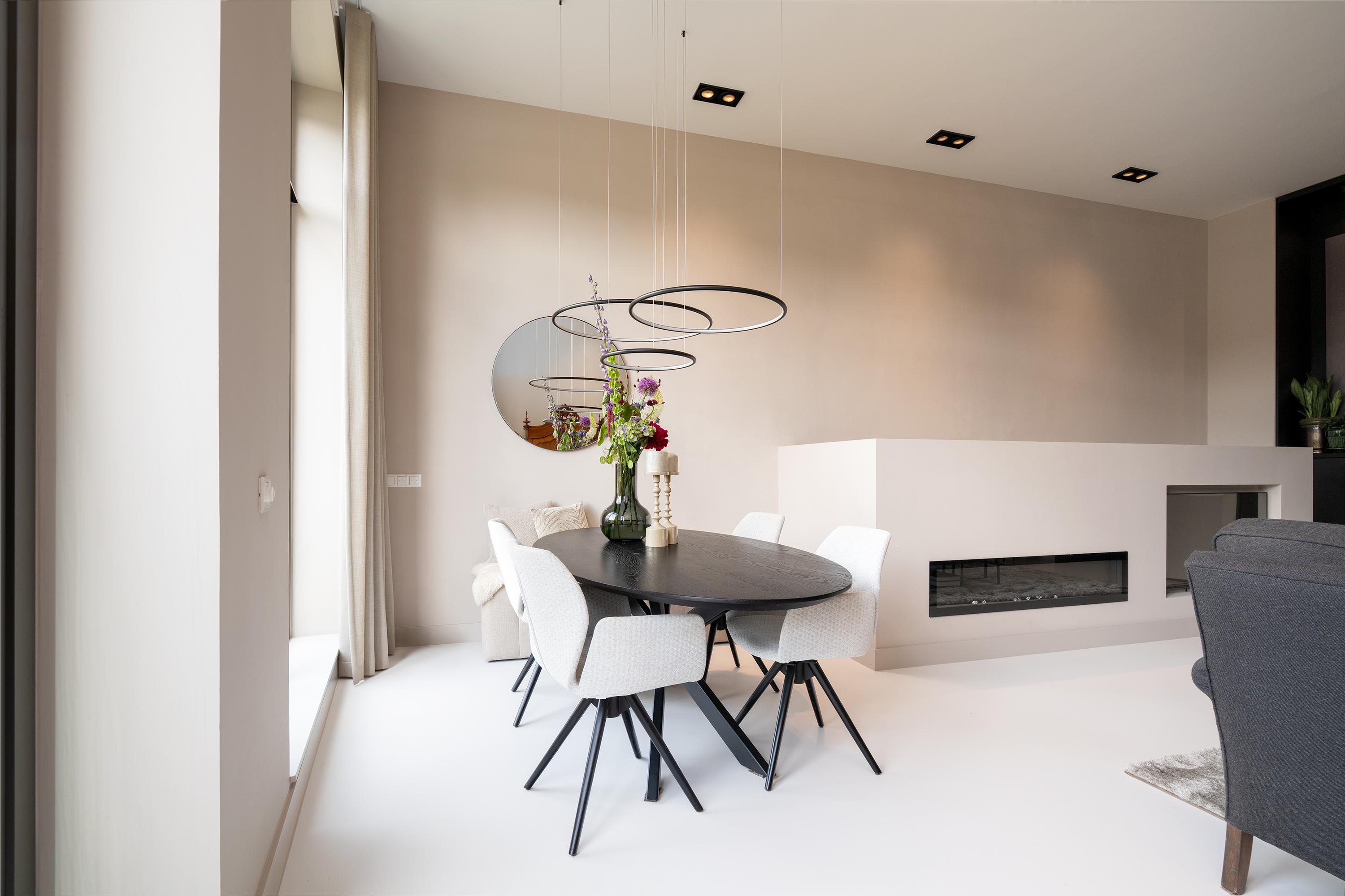 The kitchen offers far more than just a wine cooler. Custom-built wooden cabinetry frames the sleek kitchen equipped with a Quooker tap, BORA induction cooktop, and premium AEG appliances including a combination steam oven, fridge-freezer, and dishwasher. The timeless marble countertop adds a touch of elegance. The kitchen flows seamlessly into the living area, with the poured concrete floor — complete with underfloor heating and cooling — continuing throughout. The custom staircase, featuring a cinewall and electric fireplace, acts as a central design feature.
