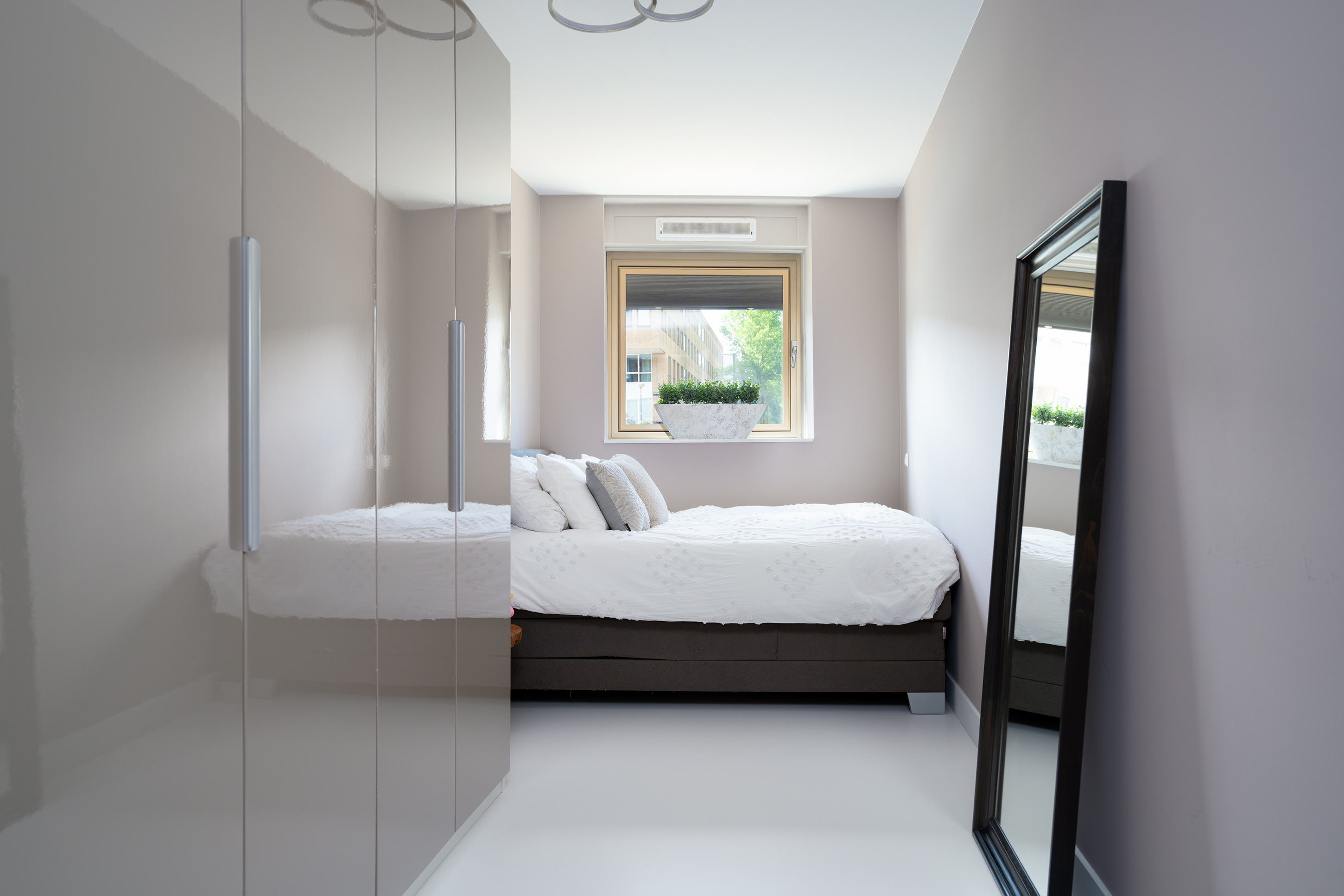 Spacious central hallway, utility room with washer/dryer setup in custom-built cabinetry (both AEG machines available for takeover), master bedroom with a high-end custom wardrobe by De Maatfabriek, second bedroom/guest room, modern bathroom with walk-in shower, second toilet, and washbasin. This level is ideal for sleeping or working, with ample natural light and windows that open in both bedrooms.