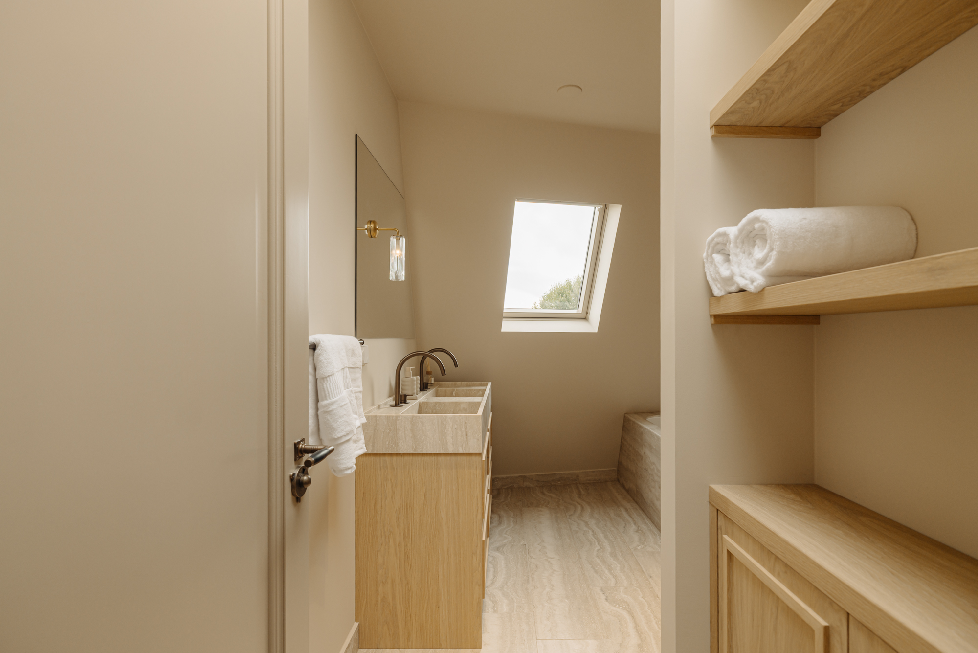The upper floor comprises two generously sized bedrooms, one of which has access to a balcony, a second luxury bathroom, and a separate laundry room. A separate toilet on both levels provides added convenience. The southwest-facing terrace and balcony offer serene views of Amsterdam’s iconic landmarks and create a harmonious connection between indoor and outdoor living.