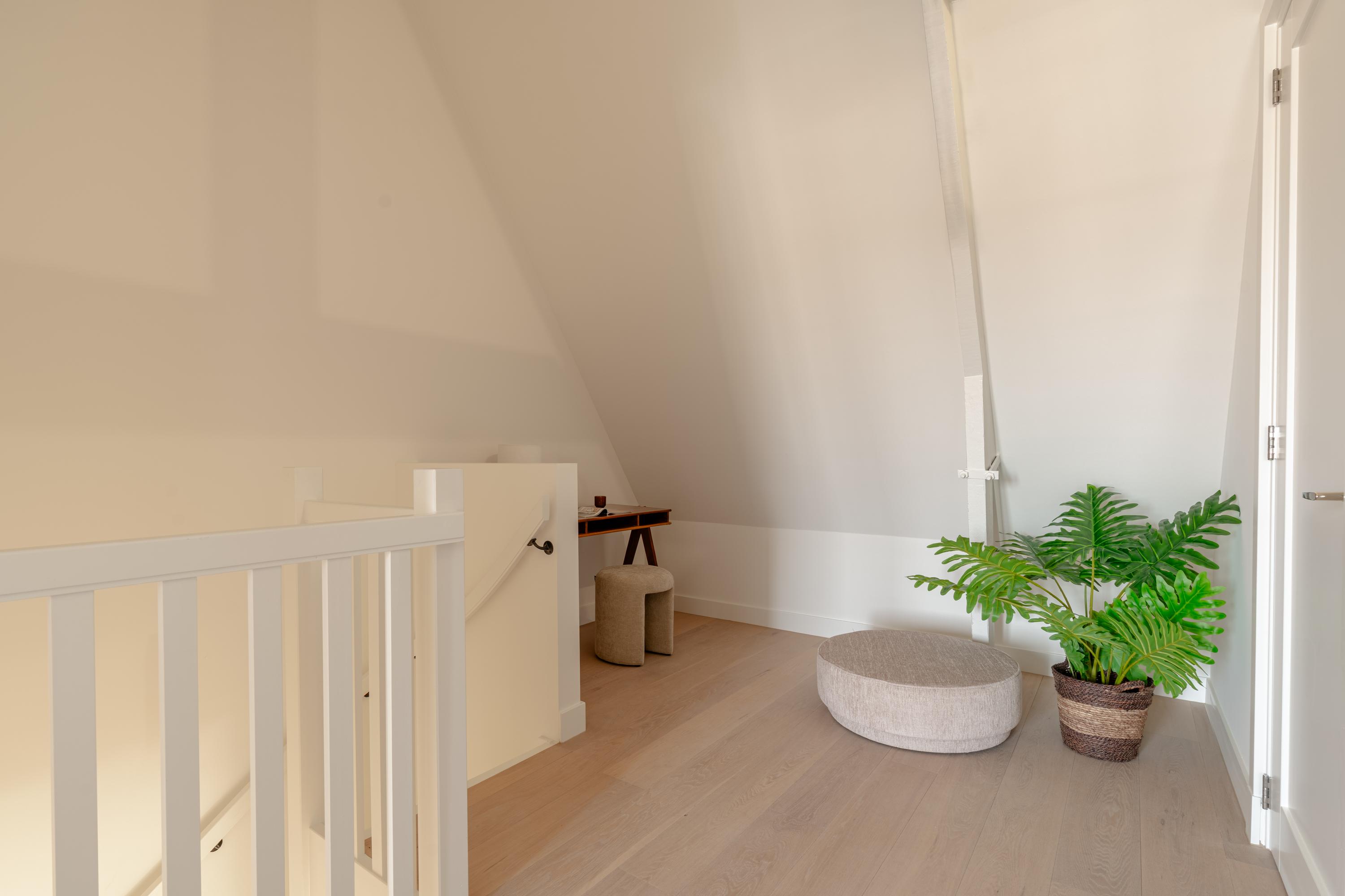 The open-plan kitchen is a true eye-catcher, fitted with high-quality built-in appliances: an induction hob with integrated extractor, dishwasher, combi-oven and Quooker tap. The combination of sleek handleless cabinetry and warm wooden accents gives this floor a modern yet inviting feel. From the living room you have access to a sunny southeast-facing balcony, perfect for a morning coffee or an afternoon drink in the sun.