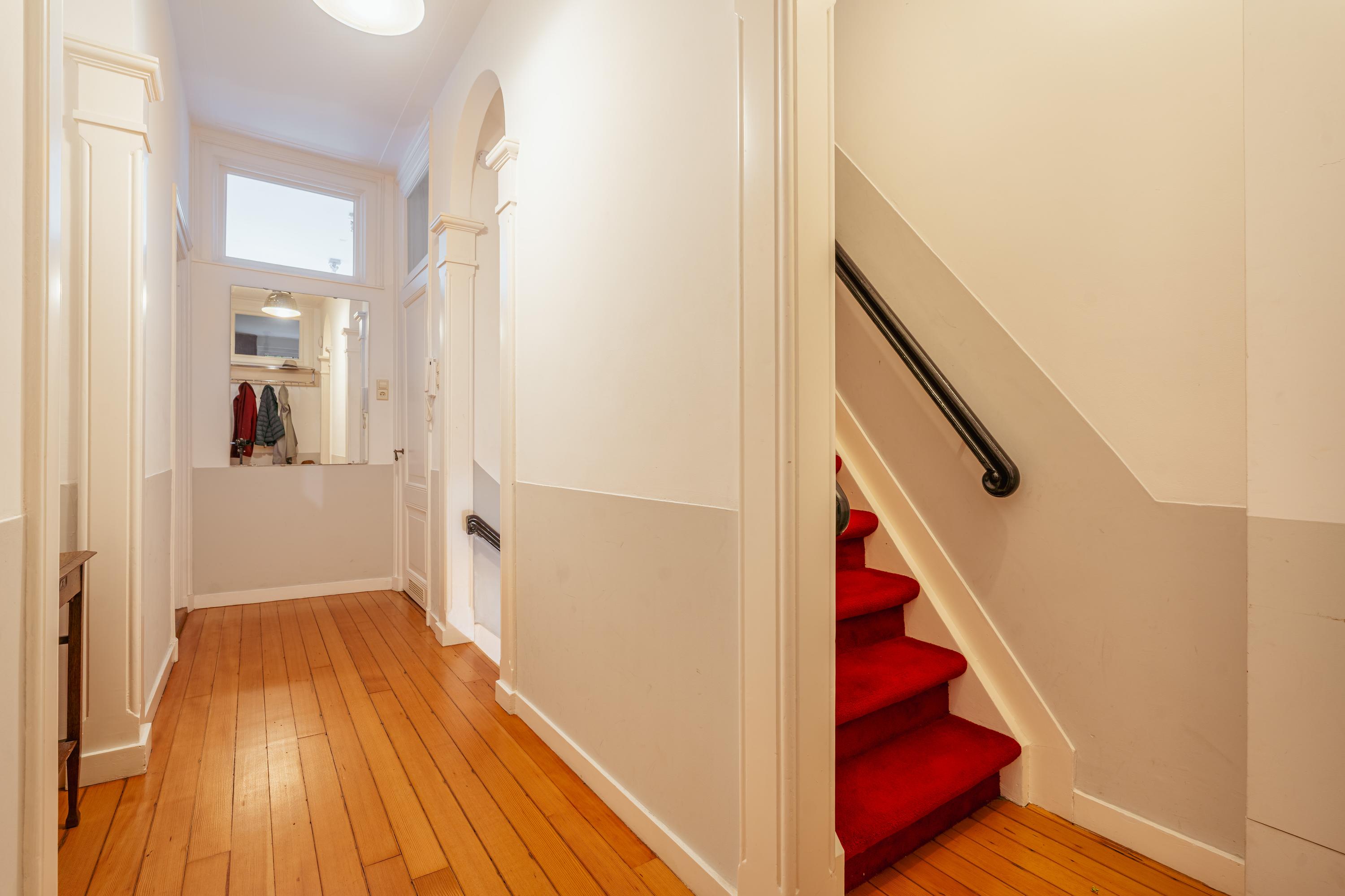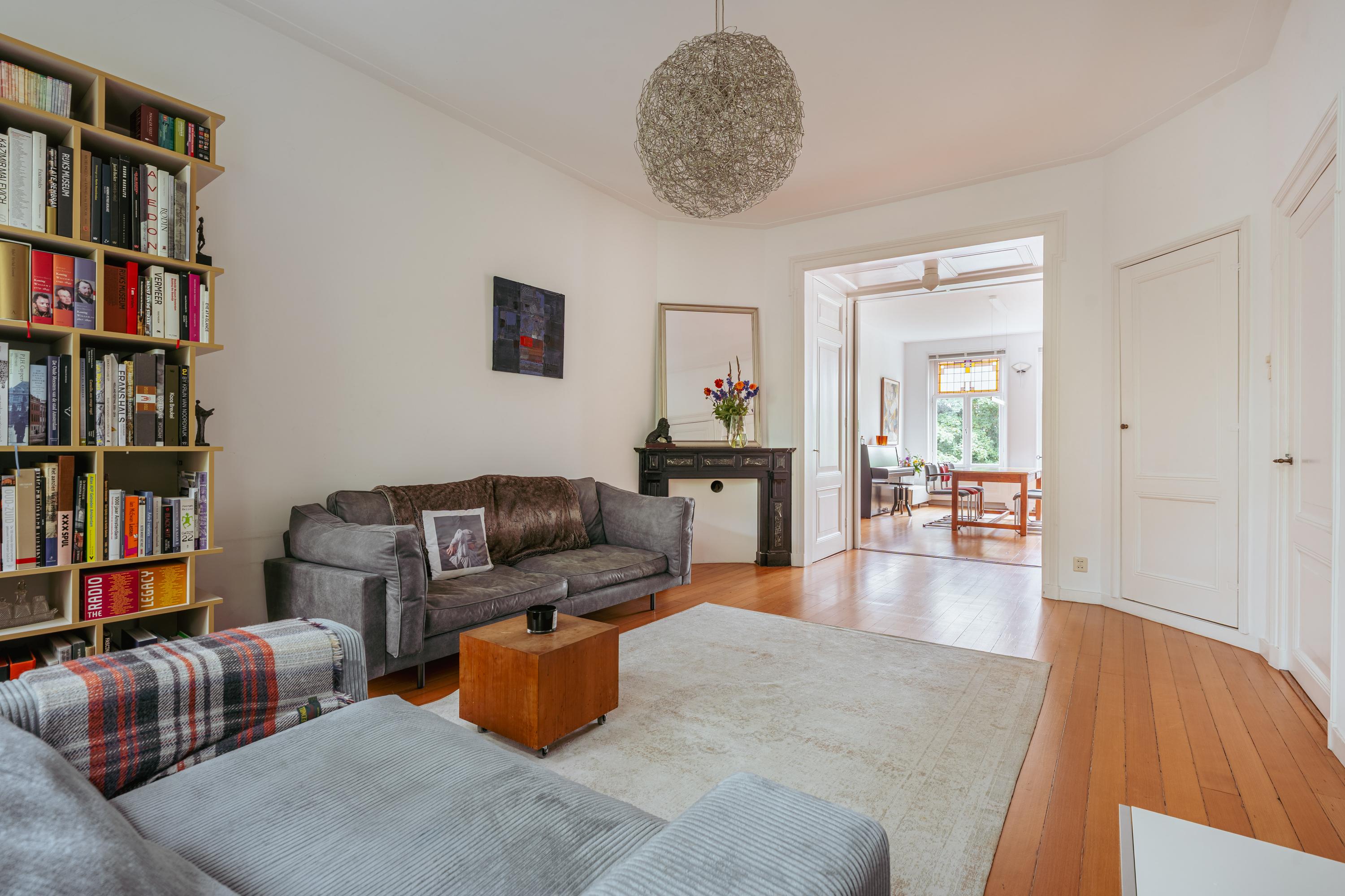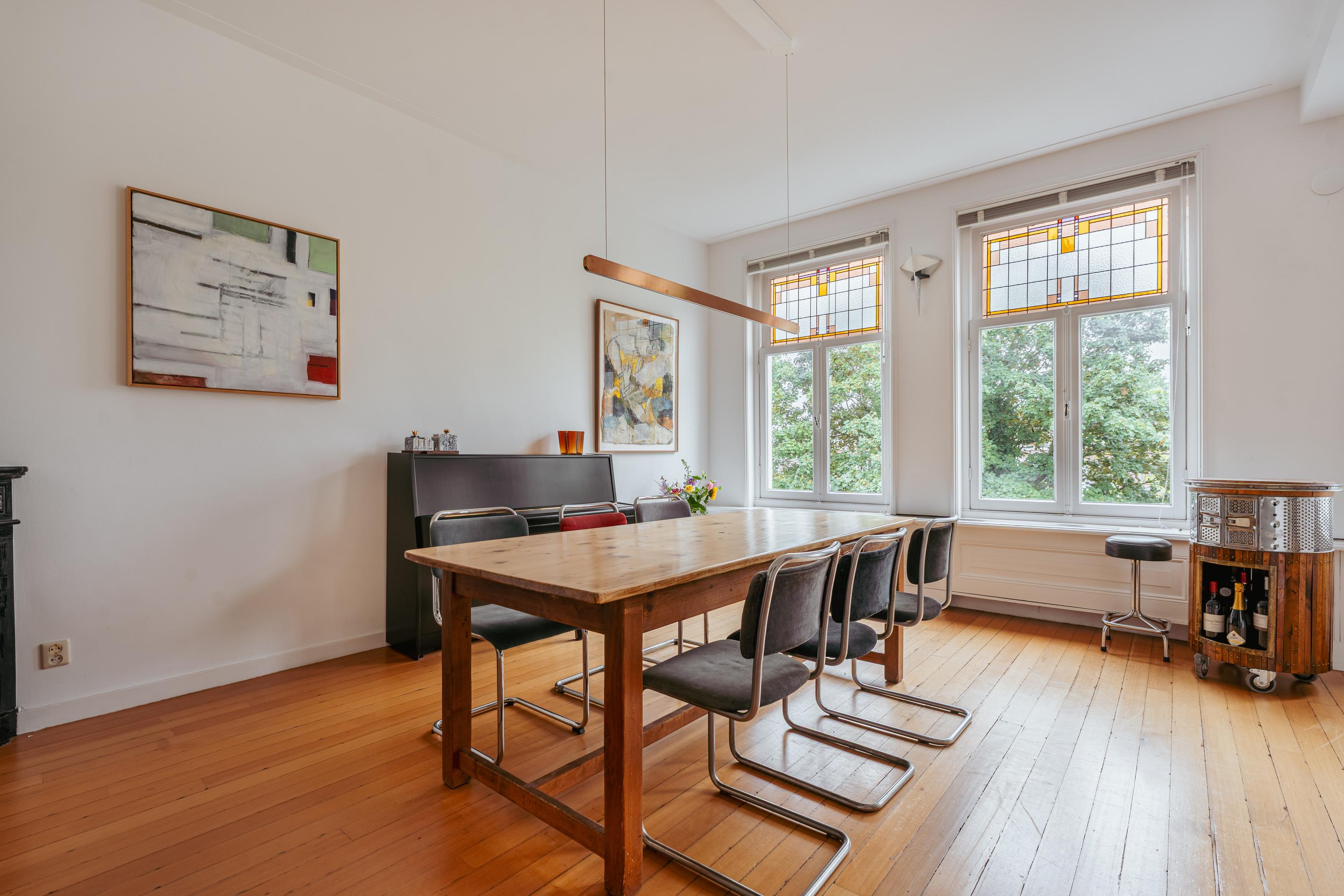 This entire floor is characterized by high ceilings, wooden flooring, and large windows with stained-glass details. At the front, the living room spans the full width of the house and overlooks the green of the Sarphatipark. The abundance of natural light and the generous layout give this space a calm and inviting feel.