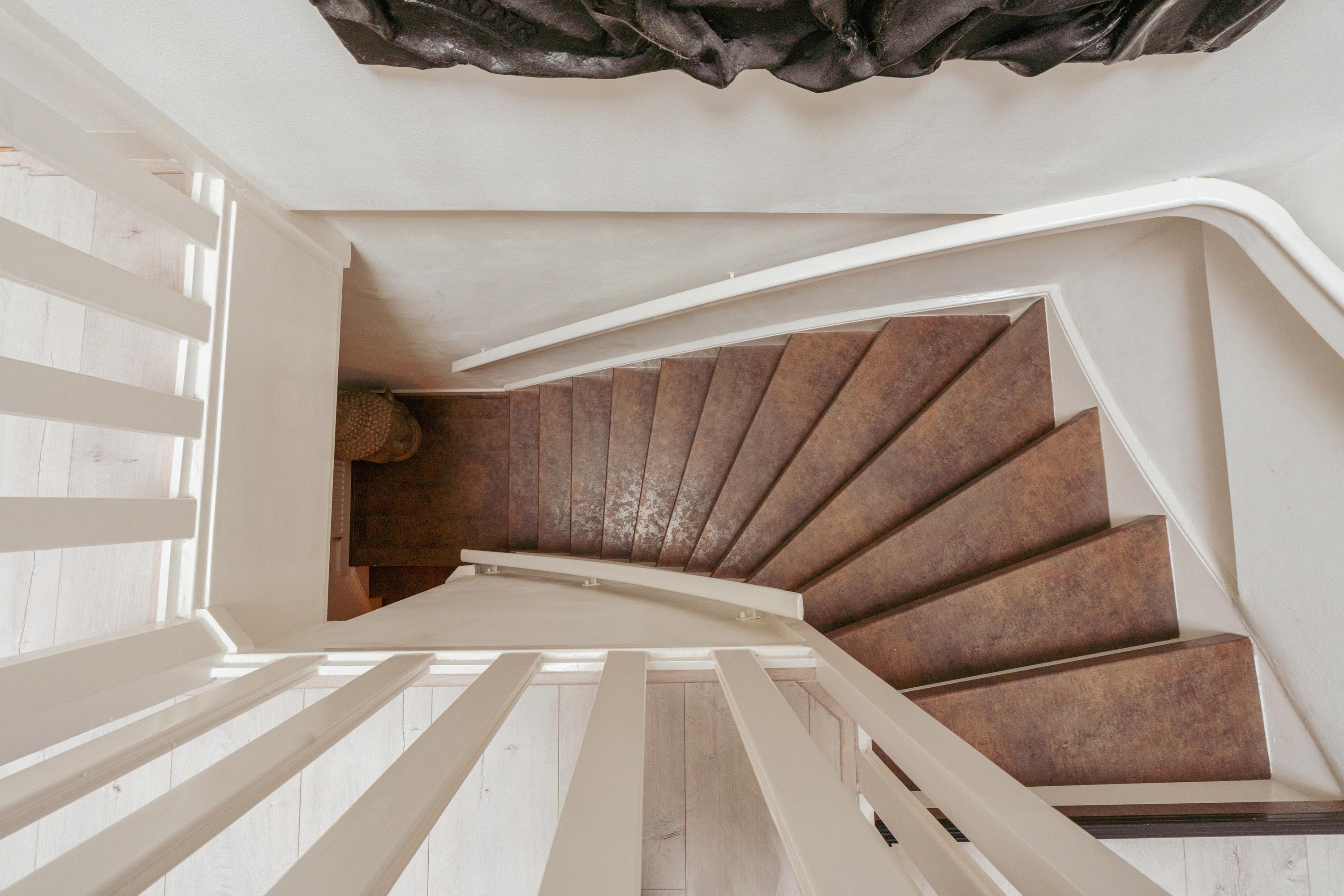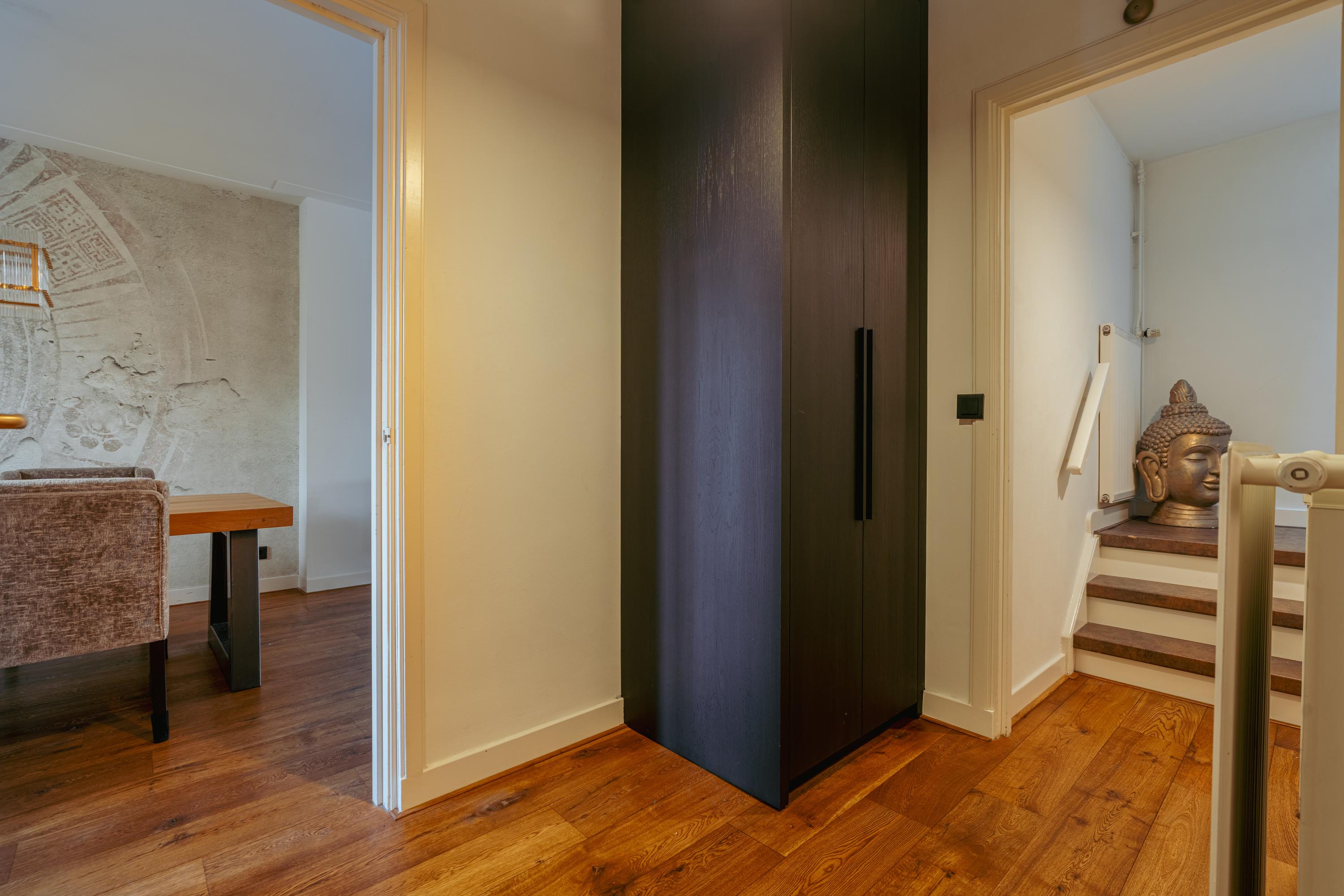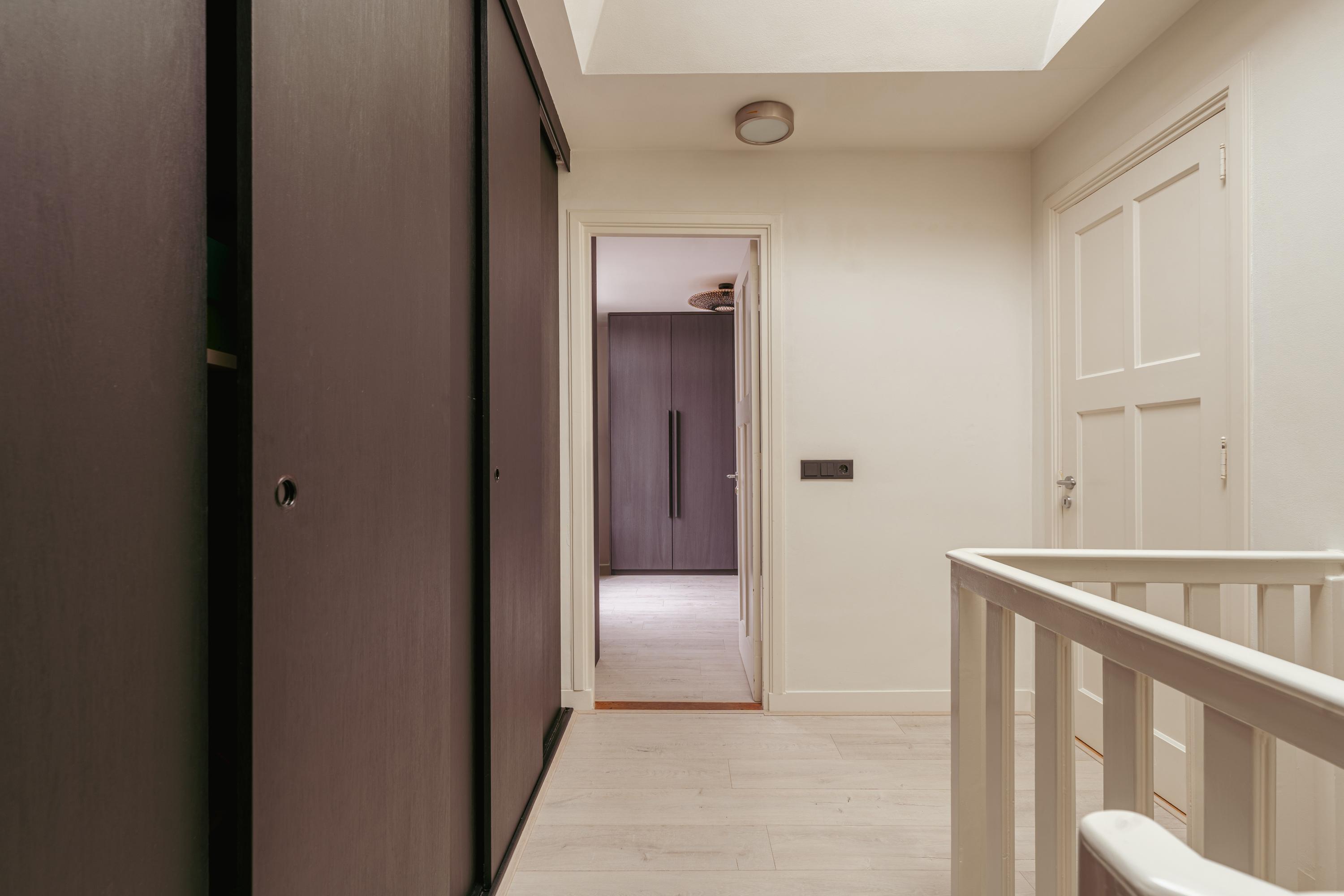 A staircase in the hallway leads to the fourth floor, the second living level. The landing features a large built-in wardrobe providing ample storage and a clean, organized appearance. A skylight allows pleasant daylight to enter.