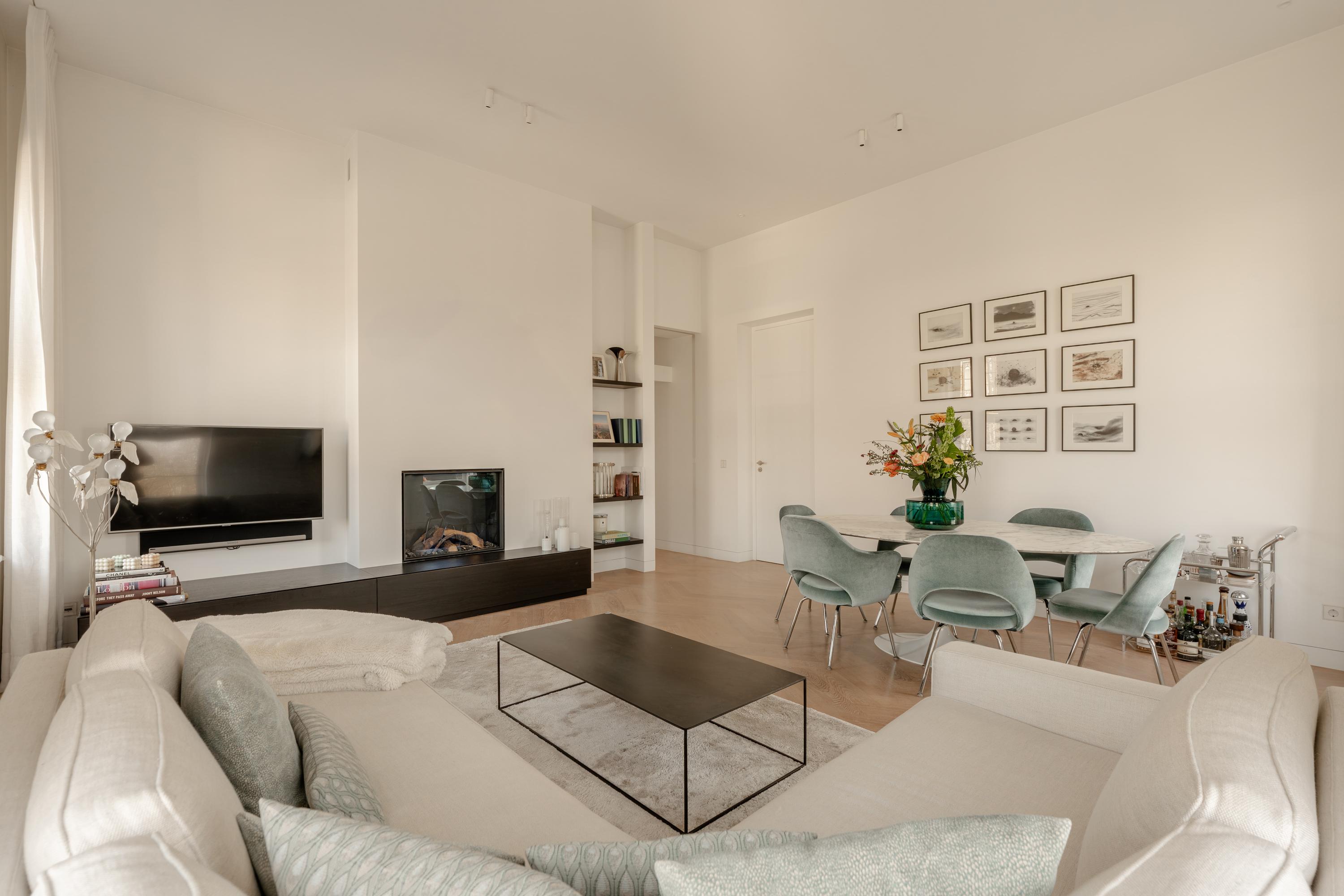 Thanks to the large windows, the space is filled with natural light and offers beautiful views over the characteristic rooftops of Oud-West, creating an open and serene living experience. The kitchen is equipped with high-end Siemens built-in appliances, an induction hob, Quooker tap, and a wine climate cabinet. Integrated air conditioning completes the comfort.