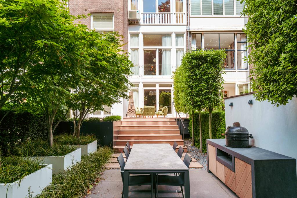 Designed by landscape architect Erik van Gelder, the garden includes a fully equipped outdoor kitchen, making it perfect for summer evenings. A detached storage shed offers additional functionality. This outdoor space is a peaceful and private retreat, ideal for enjoying long, sunny days.