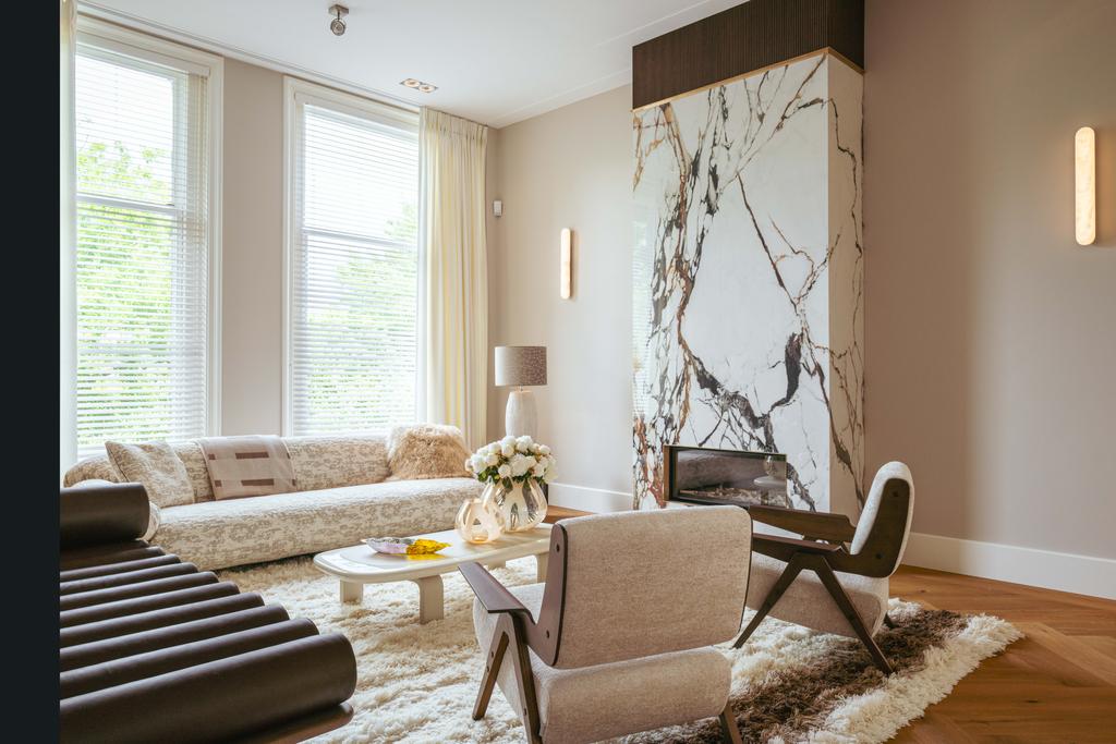 At the front, a cozy sitting area centers around a stylish gas fireplace with a marble mantelpiece, flooded with natural light through large windows and offering an uninterrupted view of Vondelpark. The dining area at the rear is accessible from both the living room and hallway through sleek steel pivot doors and features another gas fireplace with a marble surround, adding warmth and sophistication. A staircase connects this space to the kitchen in the lower ground floor, creating a natural flow between the levels.