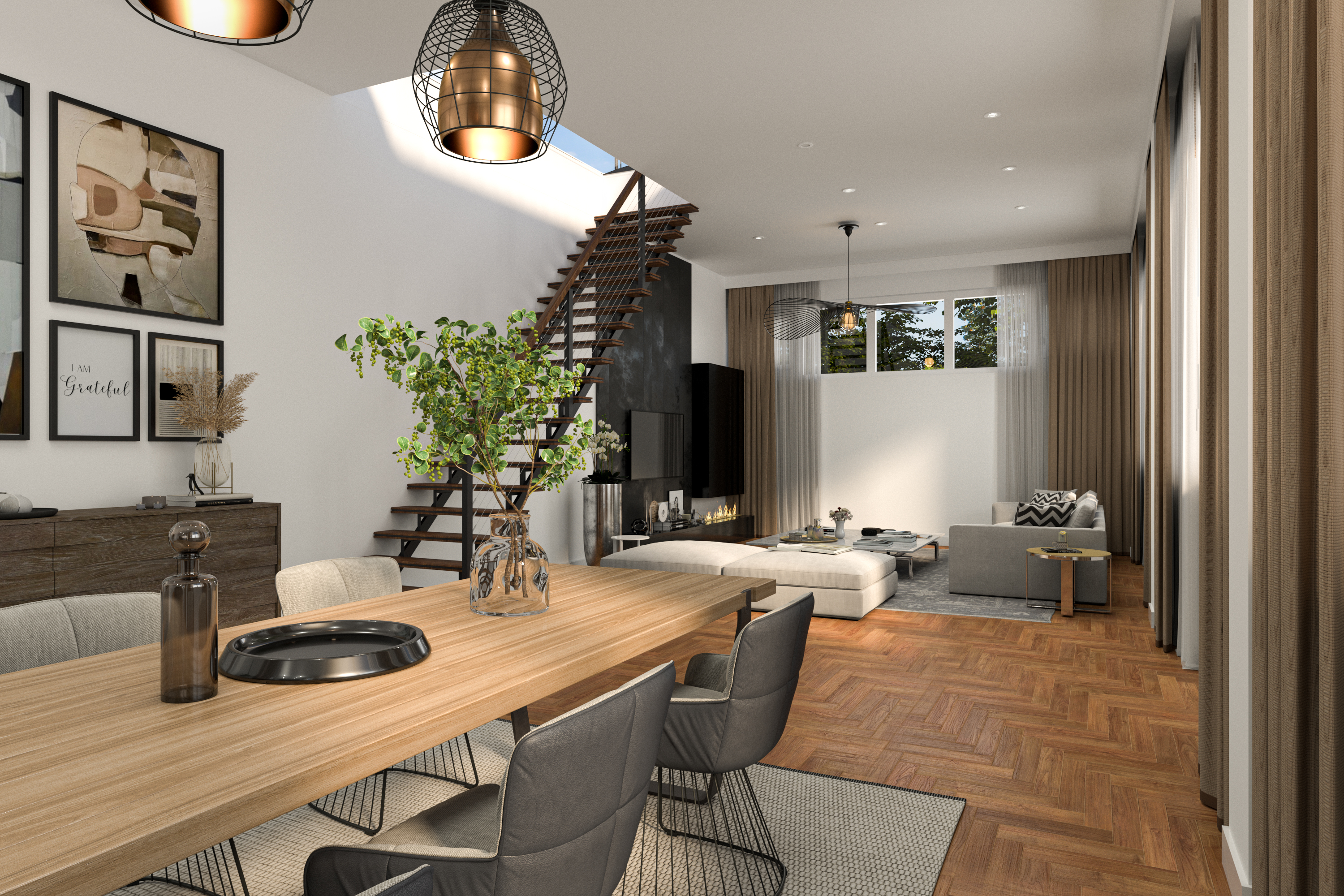 De woonkamer wordt gekenmerkt door de vele ramen, die zorgen voor een prachtige lichtinval en een ruimtelijk gevoel. Er is volop plaats voor een grote eettafel waar u met vrienden en familie lange avonden kunt tafelen, evenals voor een royale zithoek met bijvoorbeeld een op maat gemaakte kastenwand.