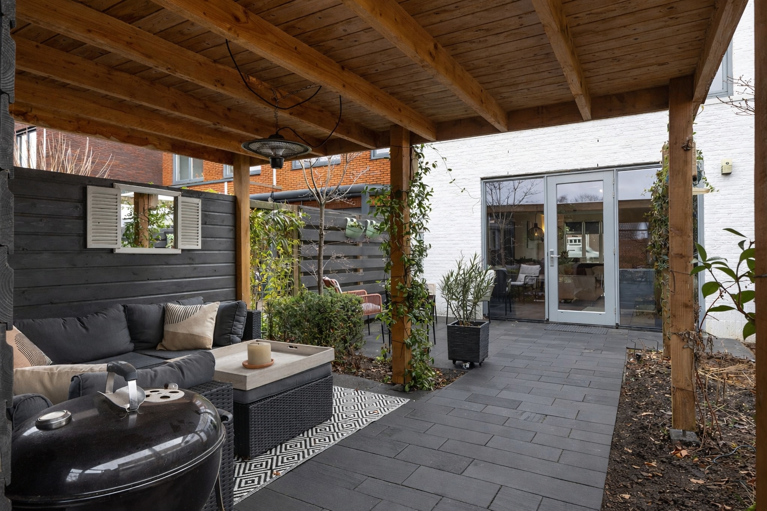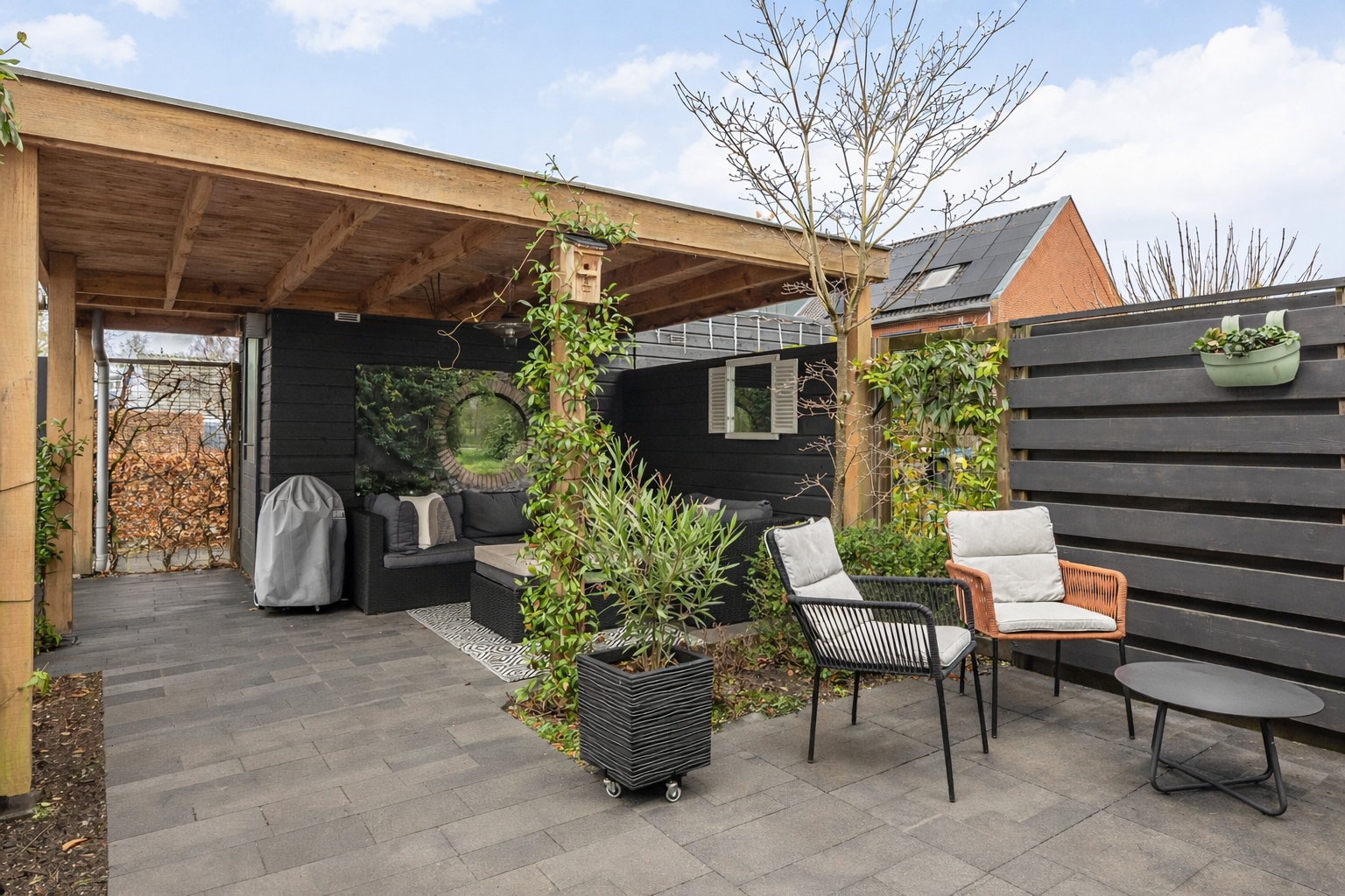 De achtertuin is onder architectuur aangelegd en sluit naadloos aan op de woonruimte. Direct achter de woning ligt een ruim terras, terwijl verderop in de tuin de veranda met luxe pergola een beschutte plek biedt om in alle rust van het buitenleven te genieten. De groene beplanting en verzorgde afwerking zorgen voor privacy en een prettige sfeer, terwijl de achterpoort directe toegang geeft tot het groene binnenhof met de twee eigen parkeerplaatsen.