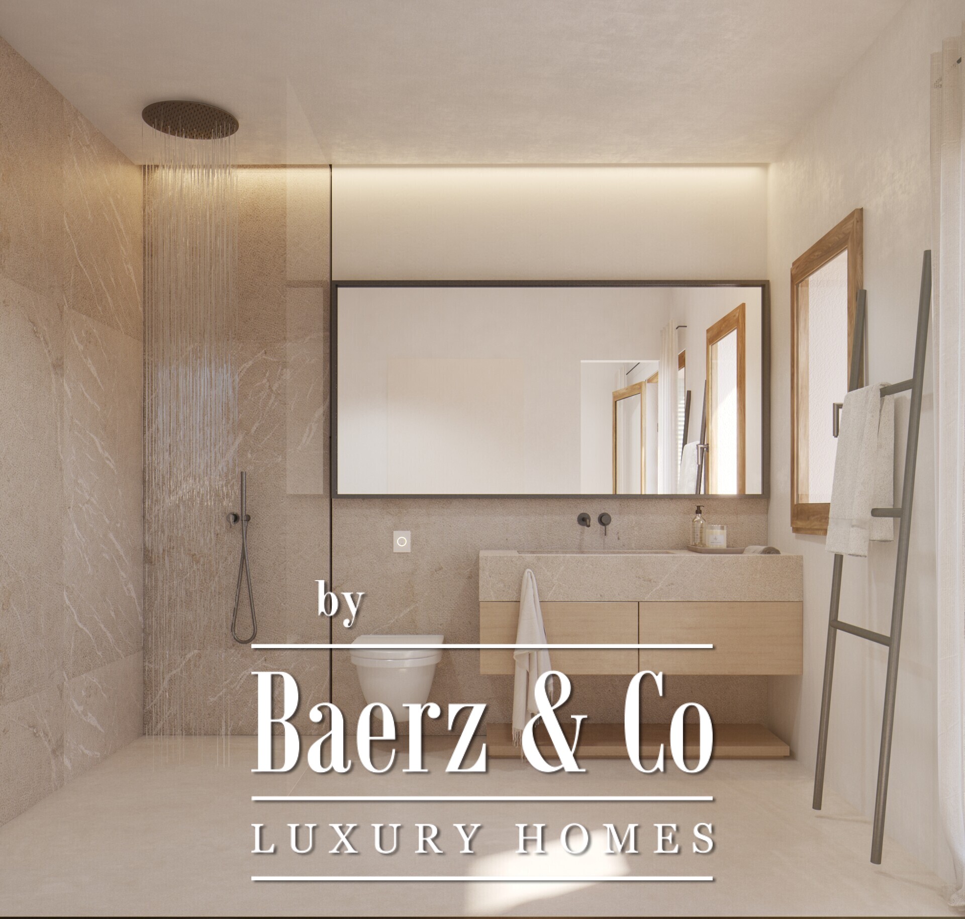 Ascending to the first floor, two generous bedrooms offer en-suite bathrooms and walk-in closets, creating spaces for privacy and calm. The entire top floor has been envisioned as a master retreat, hosting a luxurious en-suite, expansive closet and direct access to a private roof terrace with panoramic village views—ideal for quiet mornings or sunset contemplation.