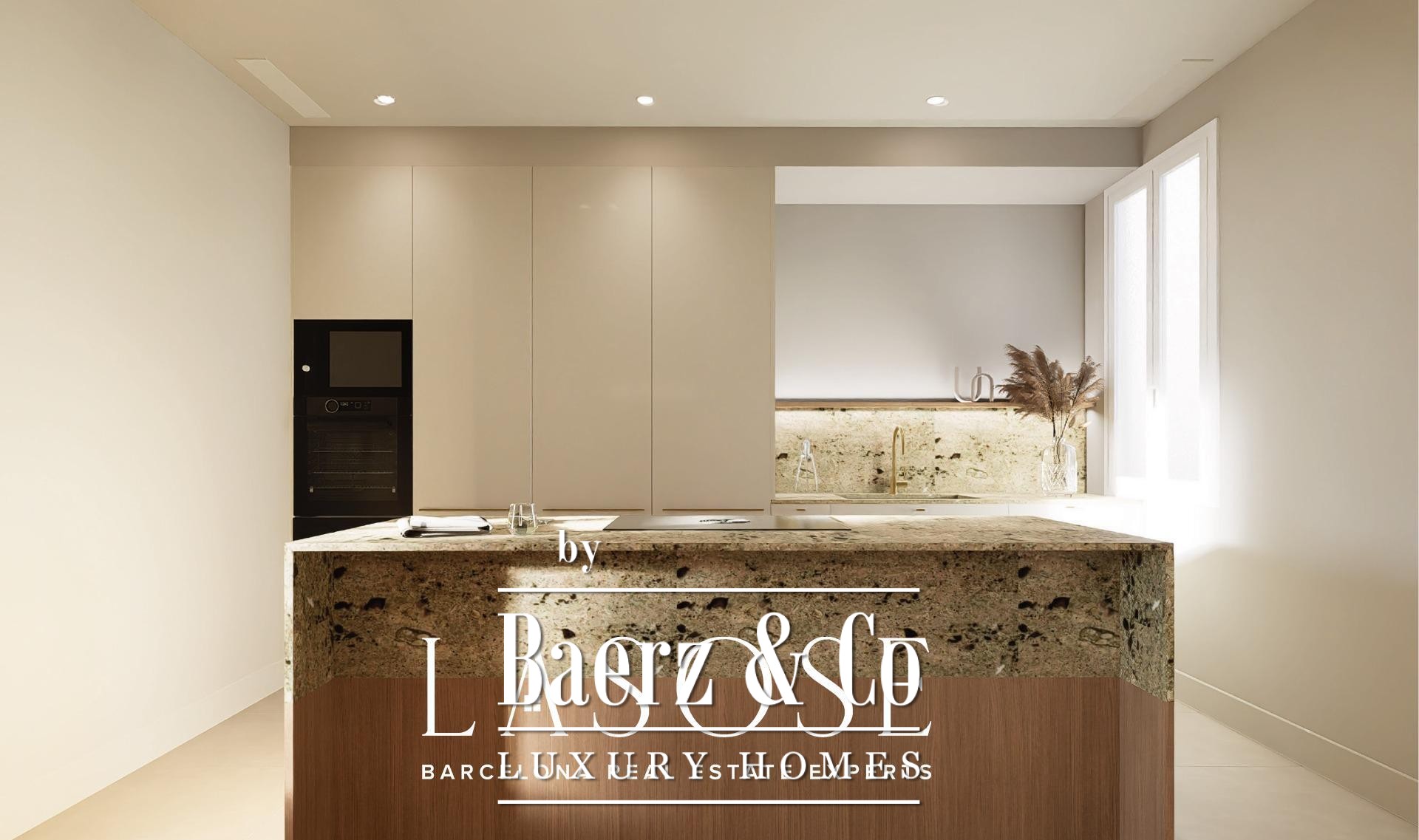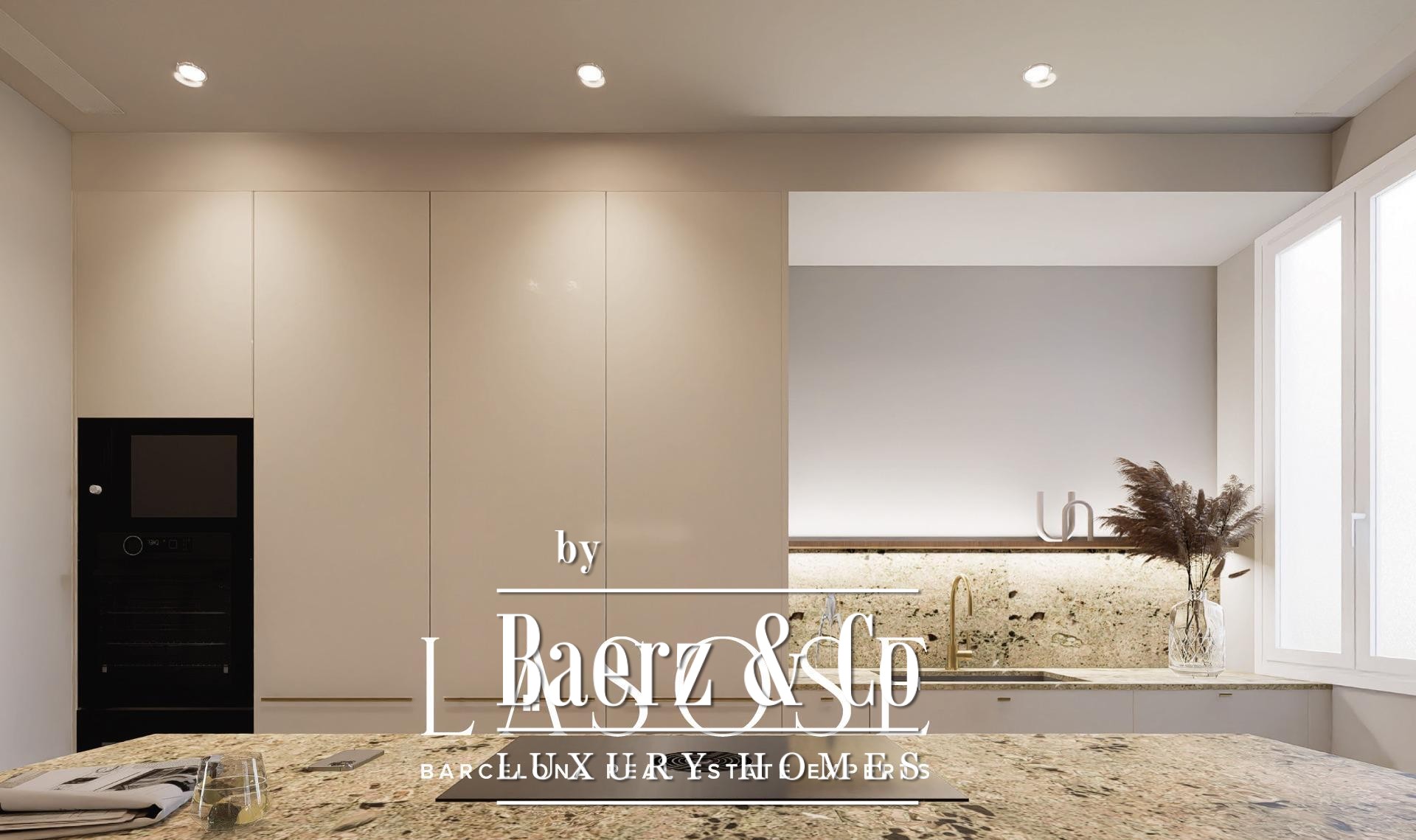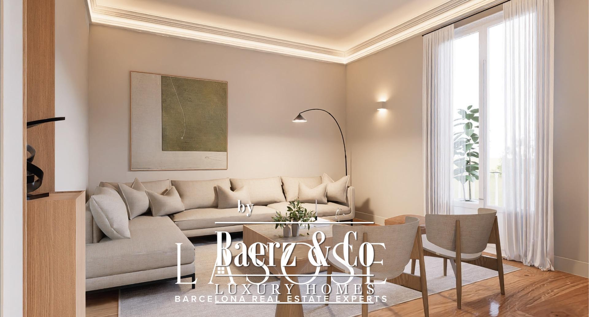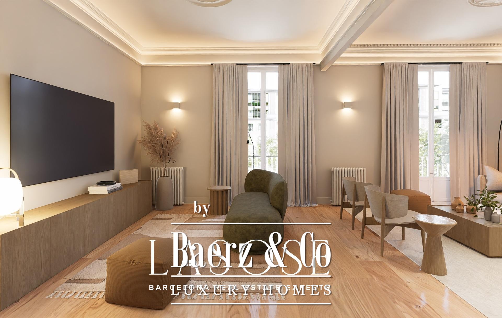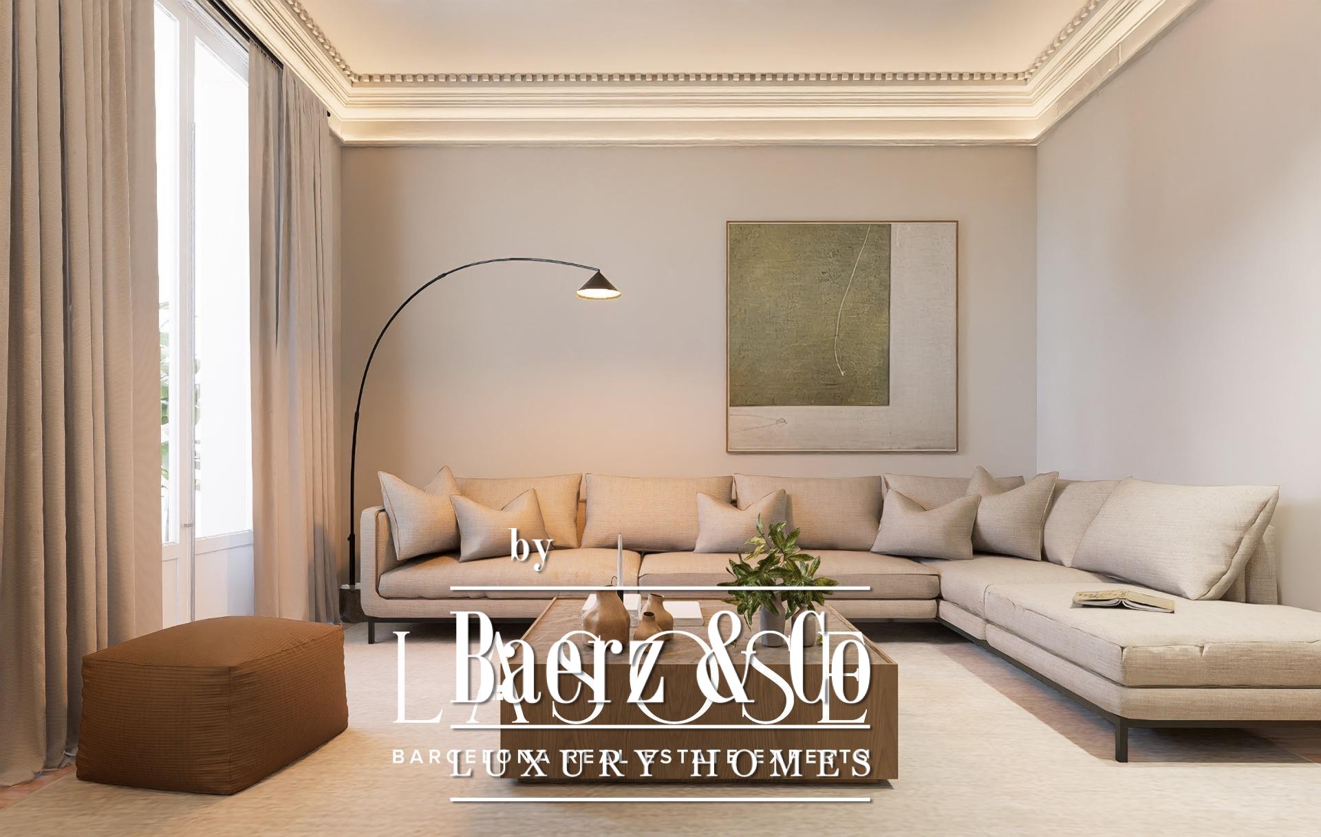 Recently completed renovations reveal high ceilings and expansive windows, drawing light through every room and emphasizing the tranquil spatial scale. Refined finishes, advanced glazing, and meticulous insulation foster privacy and serenity above the city’s vibrancy. The main living area flows seamlessly to a generous private terrace, creating an inviting haven for enjoying the Mediterranean climate or taking in privileged Eixample views.