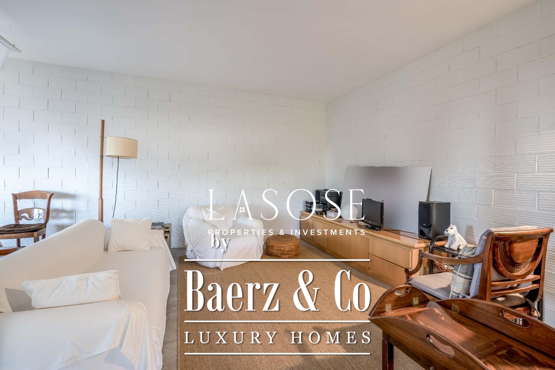 Upstairs, two generous bedrooms are accompanied by a spacious dressing room and a full bathroom. Large windows introduce abundant natural light, paired with parquet underfloor heating for comfort. On the lower floor, a self-contained 115 m² summer apartment includes a dressing room, bathroom, and garden access. Outdoor amenities feature a private pool and landscaped spaces, all within a discreet residential enclave.